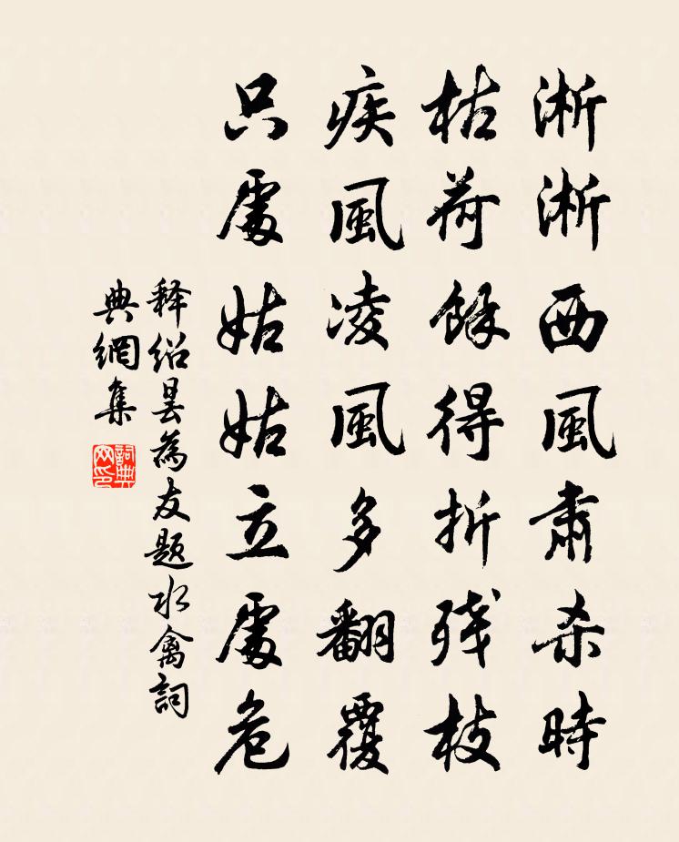 詩詞名句歷史字典書法欣賞書法字典國語詞典說文解字康熙字典古漢語字典標 題 作 者 詩 句 為友題水禽作者:釋紹曇 朝代:宋代為友題水禽原文淅淅西風肅殺時,枯荷余得折殘枝。疾風凌風多翻覆,只處姑姑立處危。詩詞問答問:為友題水禽的作者是誰?答:釋紹曇問:為友題水禽寫於哪個朝代?答:宋代釋紹曇為友題水禽書法欣賞為友題水禽書法作品詩詞推薦秋思白玉蟾〔宋代〕萬蠢懼寒皆向蟄,千岩涼風舞黃葉。雨痕印水如撮纈,蟲聲入夜如彈鑷。酒澆心緒轉悽愴,帶減腰圍增瘦怯。夢向題金陵棲霞寺贈月公周繇〔唐代〕明家不要買山錢,施作清池種白蓮。松檜老依雲外地,樓台深鎖洞中天。風經絕頂回疏雨,石倚危屏掛落泉。欲結嚴寬桂岩堂二絕句周必大〔宋代〕卜築華堂已八年,花因舊植有新添。廣寒何待中秋到,明月清風即步蟾。初冬旅遊王建〔唐代〕遠投人宿趁房遲,僮僕傷寒馬亦飢。為客悠悠十月盡,莊頭栽竹已過時。摸魚子許有壬〔元代〕買陂塘旋載楊柳,閒宮宜治閒務。老天助我攻清淡,兩月不遭泥雨。規別渚。更累土為山,留土分為嶼。鄉人共語盆池張蠙〔唐代〕圓內陶化功,外絕眾流通。選處離松影,穿時減藥叢。別疑天在地,長對月當空。每使登門客,煙波入夢中。小醉折梅楊萬里〔宋代〕死愛花枝不忍吹,醉來恣意折芳菲。鬢邊插得梅花滿,更捻南梅滿把皈。和劉後村梅花百詠方蒙仲〔宋代〕禹錫當年出省台,玄都花謝轉生哀。梅花不涉春風事,看取先生幾度來。宿舊彭澤懷陶令黃庭堅〔宋代〕潛魚願深渺,淵明無由逃。彭澤當此時,沈冥一世豪。司馬寒如灰,禮樂卯金刀。歲晚以字行,更始號元亮。淒其叢祠樹木尤岑蔚宋祁〔宋代〕祠憑怪神樹不伐,樹得岑陰神托威。鄉人奠酒女巫醉,祠樹不知誰是非。挽胡信芳上舍二首王珪〔唐代〕清弋江村外,工山右縣邊。追游曾結社,許與更忘年。郢斬無為質,牙琴有絕弦。巾箱遺墨在,披閱一潸然。游輞川至南山,寄谷口王十六錢起〔唐代〕山色不厭遠,我行隨處深。跡幽青蘿徑,思絕孤霞岑。獨鶴引過浦,鳴猿呼入林。褰裳百泉里,一步一清心。王子人月圓 中秋書事 北曲聊樂府續集吳監張可久〔元代〕西風吹得閒雲去,飛出爛銀盤。桐陰淡淡,荷香冉冉,桂影團團。鴻都人遠,霓裳露冷,鶴羽天寬。文生何處,瓊滿江紅(烏衣園)吳潛〔宋代〕喚出山來,把鷗鷺、盟言輕食。依舊是、江濤如許,雨帆煙笛。歌罷莫愁檀板緩,杯傾白墮瓊酥滴。但驚心、十六醉題廣州使院鄭愚〔唐代〕數年百姓受饑荒,太守貪殘似虎狼。今日海隅魚米賤,大須慚愧石榴黃。暮春陳宓〔宋代〕蘭亭明日禊餘春,風冷難回積雨雲。不惜芳菲倦遊賞,雅宜竹下閉門人。迎新倉守曾悅心道間偶賦馬廷鸞〔宋代〕黃旂紅幟走踆踆,曉出闉闍奔迓新。車蓋如雲騎如水,山頭牛背有閒人。滿江紅佚名〔宋代〕王母當年,瑤池會、曾充坐客。對良辰為壽,復逢佳節。屈指重陽才五,明朝月已圓如璧。這夫人、真與柏舟姜,郴江百詠並序開利寺阮閱〔宋代〕修篁喬木水西涯,古屋頹垣達磨家。持缽但聞僧乞供,杜門不為客烹茶。題會春苑趙汝譡〔宋代〕草荒故苑幾春風,尚想花開春樹紅。欲問當時馬王事,寂寥殘照野亭中。名句推薦馬思邊草拳毛動,雕眄青雲睡眼開。劉禹錫《始聞秋風》 國亡身殞今何有,只留離騷在世間。張耒《和端午》 安居不用架高堂,書中自有黃金屋。趙恆《勸學詩》 白頭燈影涼宵里,一局殘棋見六朝。錢謙益《金陵後觀棋絕句六首·選一》 辛勤三十日,母瘦雛漸肥。白居易《燕詩示劉叟》 卷盡殘花風未定,休恨,花開元自要春風。辛棄疾《定風波·暮春漫興》 淚濕羅巾夢不成,夜深前殿按歌聲。白居易《後宮詞》 夕陽西下,斷腸人在天涯。馬致遠《天淨沙·秋思》 卓眾來東下,金甲耀日光。蔡琰《悲憤詩》 半死梧桐老病身,重泉一念一傷神。白居易《為薛台悼亡》