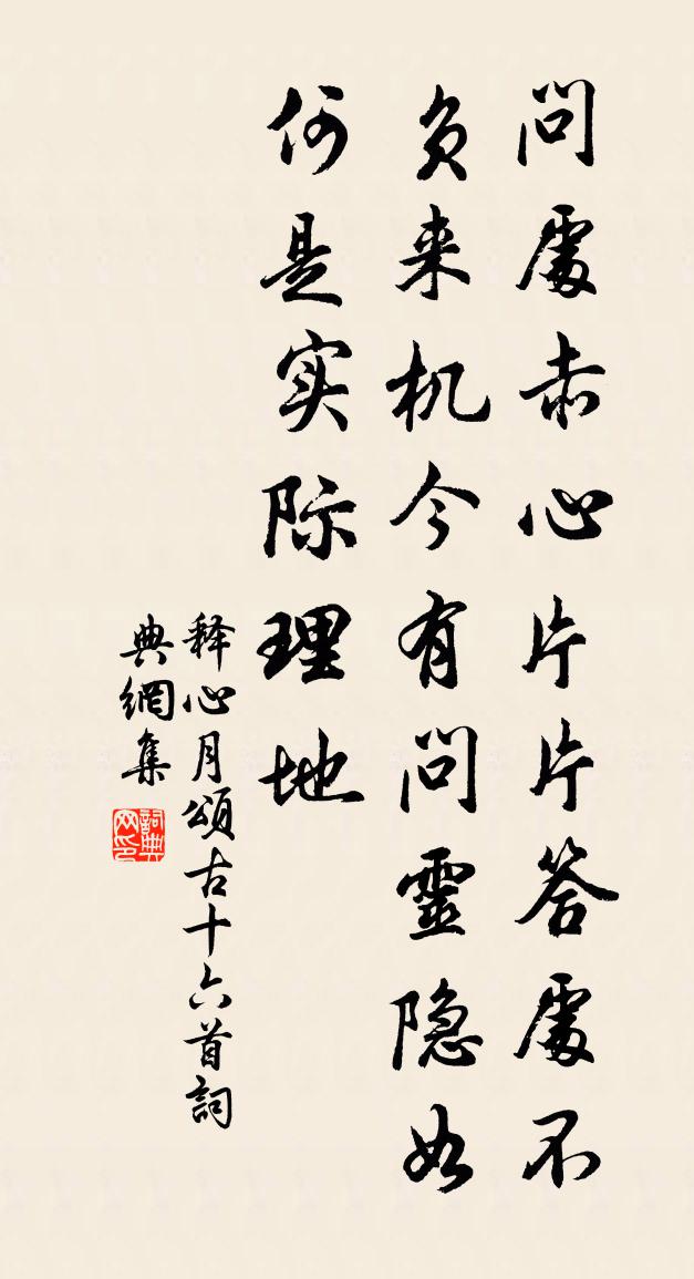 詩詞名句歷史字典書法欣賞書法字典國語詞典說文解字康熙字典古漢語字典標 題 作 者 詩 句 頌古十六首作者:釋心月 朝代:宋代頌古十六首原文問處赤心片片,答處不負來機。今有問靈隱如,何是實際理地。詩詞問答問:頌古十六首的作者是誰?答:釋心月問:頌古十六首寫於哪個朝代?答:宋代釋心月頌古十六首書法欣賞頌古十六首書法作品詩詞推薦清平樂(木犀)盧炳〔宋代〕玻璃翦葉。點綴黃金屑。雅淡幽姿風味別。翠影婆娑弄月。秋光占斷江南。清香鼻觀先參。一朵折來和露,烏雲髻樓李嶠〔唐代〕百尺重城際,千尋大道隈。漢宮井幹起,吳國落星開。笛怨綠珠去,簫隨弄玉來。銷憂聊暇日,誰識仲宣才。一落索呂渭老〔宋代〕宮錦裁書寄遠。意長辭短。香蘭泣露雨催蓮,暑氣昏池館。向晚小園行遍。石榴紅滿。花花葉葉盡成雙,渾似我、宿酇侯鎮汪藻〔宋代〕當時踏月此長亭,鬢似河堤柳色青。今日重來堤樹老,一簪華發戴寒星。王正卿何道夫和嘉字韻詩至數十道夫贈予數篇李流謙〔宋代〕清言元論極邊涯,南渡風流繼永嘉。中散一生慵作吏,淵明無日不思家。悠悠官路降胸臆,苒苒年光侮鬢華。人說北風(新康江口信宿方行)杜甫〔唐代〕春生南國瘴,氣待北風蘇。向晚霾殘日,初宵鼓大爐。爽攜卑濕地,聲拔洞庭湖。萬里魚龍伏,三更鳥獸呼。滌除秘省和劉左司韻馬廷鸞〔宋代〕三年三揖壁奎星,當日曾登著作庭。大雅重逢君子聚,斯文還屬聖人興。倚天延閣緣雲上,拔地方壺歷級升。自別諸人頗有和余百梅詩者各賦一首劉克莊〔宋代〕百首初成六十餘,朝塗暮改費居諸。誰將彩筆傳於子,人怪青春小似余。一笑拈花差易耳,三年刻楮欲何如。梅兄永嘉縣君赴潁昌杜丈之喪送至鹿邑境上贈別晁補之〔宋代〕二十年糠秕,相從無靦顏。尊公抱至痛,白玉掩深菅。送子三百里,西風涕丸瀾。鄰喪罷相舂,況我五服間。憐子奉寄李十五秘書二首杜甫〔唐代〕避暑雲安縣,秋風早下來。暫留魚復浦,同過楚王台。猿鳥千崖窄,江湖萬里開。竹枝歌未好,畫舸莫遲回。行李施潭周弼〔宋代〕歸程風強阻,春色有如無。上水千帆健,中流一矴孤。雨沖尋屋燕,雲背立檣烏。盡說明朝順,江行舊有圖。重題薔薇皮日休〔唐代〕濃似猩猩初染素,輕如燕燕欲凌空。可憐細麗難勝日,照得深紅作淺紅。頌古二十九首釋師體〔宋代〕走出門風相副稱,東西南北更無人。看來不得韶陽老,未免兒孫惹客塵。好事近蔡襄〔宋代〕瑞雪滿京都,宮殿盡成銀闕。常對素光遙望,是江梅時節。如今江上見寒梅,幽香自清絕。重看落英殘艷,想飄零夏夜對月蘇轍〔宋代〕大火直南方,萬物委爐炭。微雪吐涼月,中夜初一浣。老人氣如縷,枕簟亦流汗。披衣繞中庭,星斗嘒相粲。鳴蜩題謝氏一勺軒楊維楨〔元代〕一勺水,不滿斗。我吸之,勺在手。上連天津尾,下泄海焦口。主人飲,小池鑿;吾蔀青,天納牖。吾鐵崖道人韙丙辰年別龜峰曹源和尚釋道沖〔宋代〕拚命來經蠱毒家,不嘗滴水喪生涯。尚餘窮相一雙手,要向諸方癢處爬。題壁廬陵田父〔宋代〕雲兮雲兮,變化有神靈兮。捲起地下黃,飛去天上青兮。仙人乘雲天盡五,借我清陰覆赤土。雲間逍遙人間苦,年別擬太上皇帝輓歌詞六首范成大〔宋代〕身濟投艱業,時乘撥亂機。荊榛荒帳殿,風雨頮戎衣。有日臨黃道,無星彗紫微。至今淮海上,猶詠六龍飛。梁燭處士辭金陵,相國杜公歸舊山,因以寄贈鄭谷〔唐代〕相庭留不得,江野有苔磯。兩浙尋山遍,孤舟載鶴歸。世間書讀盡,雲外客來稀。諫署搜賢急,應難惜布衣。名句推薦湘女歸魂,佩環玉冷無聲,凝情誰訴。吳文英《過秦樓·黃鐘商芙蓉》 百里不販樵,千里不販糴。司馬遷《史記·七十列傳·貨殖列傳》 一壺濁酒喜相逢,古今多少事,都付笑談中。羅貫中《三國演義·第一回》 愛人者人恆愛之,敬人者人恆敬之。孟子《孟子·離婁章句下·第二十八節》 方而不割,廉而不劌,直而不肆,光而不耀。老子《老子·德經·第五十八章》 粽包分兩髻,艾束著危冠。陸游《乙卯重五詩》 雲壓西村茅舍重,怕他榾柮同燒。陳維崧《臨江仙·寒柳》 行得春風,指望夏雨馮夢龍《警世通言·卷二十五》 淇則有岸,隰則有泮。佚名《氓》 營州少年厭原野,狐裘蒙茸獵城下。高適《營州歌》