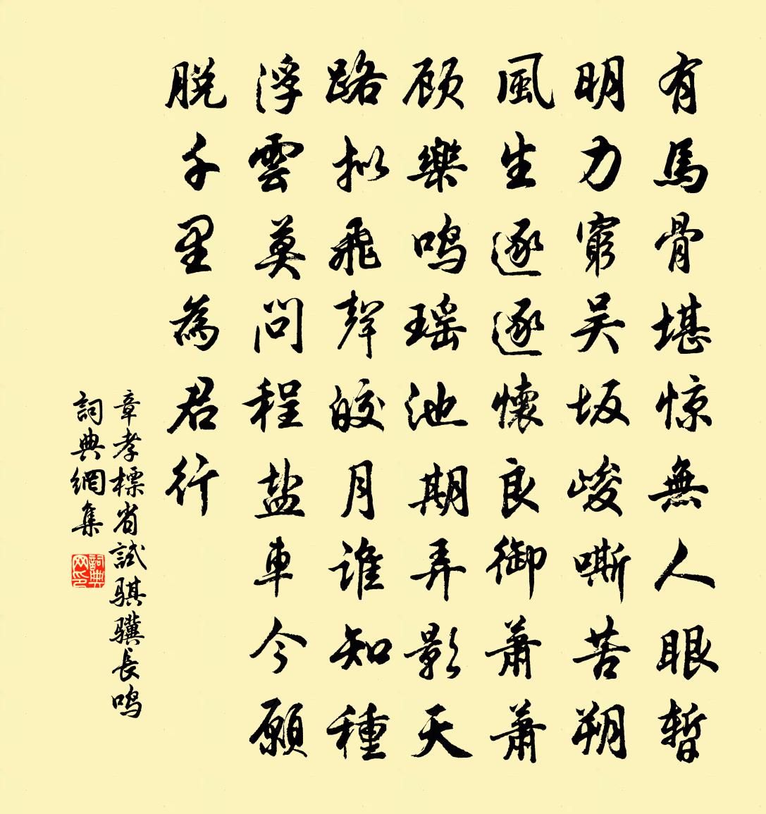 詩詞名句歷史字典書法欣賞書法字典國語詞典說文解字康熙字典古漢語字典標 題 作 者 詩 句 省試騏驥長鳴作者:章孝標 朝代:唐代省試騏驥長鳴原文有馬骨堪驚,無人眼暫明。力窮吳坂峻,嘶苦朔風生。逐逐懷良御,蕭蕭顧樂鳴。瑤池期弄影,天路擬飛聲。皎月誰知種,浮雲莫問程。鹽車今願脫,千里為君行。詩詞問答問:省試騏驥長鳴的作者是誰?答:章孝標問:省試騏驥長鳴寫於哪個朝代?答:唐代問:省試騏驥長鳴是什麼體裁?答:五排章孝標省試騏驥長鳴書法欣賞省試騏驥長鳴書法作品注釋全唐詩:卷506-22詩詞推薦方汝一下第餞詩盈軸余亦繼作劉克莊〔宋代〕紛紛肉馬上青天,驥耳雙垂亦可憐。郊豈因窮吟遂輟,蕒雖不第策猶傳。會須有集鳴當世,肯為無媒怨盛年。鬥氣繞池游佚名〔宋代〕漸春工巧,玉漏花深寒淺。韶景變、融晴蕙風暖。都門十二,三五銀蟾光滿。瑞煙蔥茜,禁城閬苑。棚山雉扇。絳正月九日微雪二首趙蕃〔宋代〕小雨因風凍作花,冰梢爭競出槎牙。攜筇偶作巡檐去,徒倚微吟低帽紗。端平二年端午帖子詞貴妃閣洪咨夔〔宋代〕穿蓮漏永金鋪邃,雪藕衣輕玉殿涼。好把無邪毋不敬,細挑采字壽君王。習家池詩李廌〔宋代〕言登峴椒亭,南望高陽池。習君漢徹侯,種魚千石陂。川光涵翠阜,倒影媚清漪。伊昔典午世,山公已游嬉。子孫乘小舟訪松山法聰上人梅堯臣〔宋代〕我從溪口來,正值山前雨。濕衣逢梵宮,有僧善吳語。天寒蜜已空,軒靜竹可數。歸楫難久留,汀鷗自飛舞。故司徒兼侍中贈太傅北平王輓詞權德輿〔唐代〕授律勛庸盛,居中鼎鼐和。佐時調四氣,盡力淨三河。忽訪天京兆,空傳漢伏波。今朝麟閣上,偏軫聖情多。得句姜特立〔宋代〕得句勝於得好官,平生事業蠹魚間。近來世味尤如蠟,唯有吟詩不奈閒。贊北磵和尚釋心月〔宋代〕調古風高,神清氣逸。聞一唯升素王之堂,見微笑入空王之室。恢恢綽綽兮以一而貫萬,寂寂寥寥兮會萬而歸一。放鷓鴣崔塗〔唐代〕秋入池塘風露微,曉開籠檻看初飛。滿身金翠畫不得,無限煙波何處歸。子固席上雪得芟字晁補之〔宋代〕新霜一夜草如芟,午酌臨軒雪點衫。不怕夷門清著骨,故教詩句聳巉岩。春晴懷故園海棠二首楊萬里〔宋代〕故園今日海棠開,夢入江西錦繡堆。萬物皆春人獨老,一年過社燕方回。似青似白天濃淡,欲墮還飛絮往來。無那春日西湖作齊己〔唐代〕一水繞孤島,閒門掩春草。曾無長者轍,枉此問衰老。惠山泉強至〔宋代〕封寄晉陵船,東南第一泉。出瓶雲液碎,落鼎月波圓。正味雲誰別,繁聲只自憐。要須茶品對,合煮建溪先。題虎邱顧逢〔宋代〕此山雖小眾山尊,半近吳城半近村。一壑風煙龍窟宅,滿堂巾盔佛兒孫。生公說法台空在,陸羽煎茶井不存。喚起贈畫者徐琛陳長方〔宋代〕我行江南江北山,真賞會心那可數。獨愛黃陵古廟前,四水粘天迷浦漵。胸中歷歷著山川,有句如枝不容吐。欲將挽張郴州四首曾豐〔宋代〕輕甘相潤澤,清苦自磨磋。數矣充周賦,優哉中漢科。上分之左竹,公付以南柯。天不憗遺意,其如人望何。游九鎖高似孫〔宋代〕洞門金畫翠琅玕,杏不多花月溜寒。借得御書經自讀,松風淨洗石棋盤。南昌城蔡沈〔宋代〕巍城十八里,雄壯稱洪都。北郭勢迤邐,南浦形縈紆。連亘控西江,囊括盡東湖。灌侯遺故址,李相規舊模。改築送李去病楊元老強至〔宋代〕君王赫怒超前古,威令風馳奮皇武。將士鹹懷敵愾心,桓桓孰可當貔虎。岷峨橫抹西南坤,河池散關當北門。堅城名句推薦銅鑄金鏞振紀綱,聲傳海外播戎羌。曹雪芹《交趾懷古》 玉慘花愁出鳳城,蓮花樓下柳青青。聶勝瓊《鷓鴣天·別情》 涼風起天末,君子意如何。杜甫《天末懷李白》 雲開汶水孤帆遠,路繞樑山匹馬遲。高適《東平別前衛縣李寀少府 / 送前衛縣李宷少府》 家山何在,雪後園林,水邊樓閣。辛棄疾《瑞鶴仙·賦梅》 別浦今朝暗,羅帷午夜愁李賀《七夕》 共眠一舸聽秋雨,小簟輕衾各自寒。朱彝尊《桂殿秋·思往事》 非我而當者,吾師也;是我而當者,吾友也。荀子《荀子·修身》 天地相合,以降甘露,民莫之令而自均。老子《老子·道經·第三十二章》 不忍登高臨遠,望故鄉渺邈,歸思難收。柳永《八聲甘州·對瀟瀟暮雨灑江天》