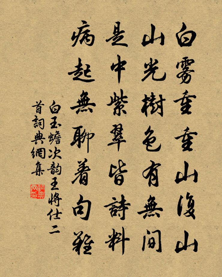 詩詞名句歷史字典書法欣賞書法字典國語詞典說文解字康熙字典古漢語字典標 題 作 者 詩 句 次韻王將仕二首作者:白玉蟾 朝代:宋代次韻王將仕二首原文白霧重重山復山,山光樹色有無間。是中紫翠皆詩料,病起無聊著句難。詩詞問答問:次韻王將仕二首的作者是誰?答:白玉蟾問:次韻王將仕二首寫於哪個朝代?答:宋代問:次韻王將仕二首是什麼體裁?答:七絕白玉蟾次韻王將仕二首書法欣賞次韻王將仕二首書法作品詩詞推薦三吳漫遊集唐方鳳〔宋代〕邊風蕭颯動江城,獨上高樓故國情。磧裹征人三十萬,空教弟子學長生。奉和魏提乾張榘〔宋代〕騎鶴樓前奏宓琴,朅來又作海山吟。碧雲不隔鄉關夢,白髮能催灰客心。愧我抗塵徒走俗,羨君博古更通今。新詩覺林寺王欽若〔宋代〕暫拂塵襟思倍清,竹風山色亂泉聲。安民功淺君恩重,又策羸蹄向古城。送金潮州三首劉克莊〔宋代〕潮人無計駐軒車,來扇仁風僅歲餘。棘院從今添立鵠,金堤亘古免為魚。真堪香火陪韓廟,誰採風謠繼葉渠。曾忝漢宮春慢/漢宮春佚名〔宋代〕春日遲遲。稱遊人、盡日賞燕芳菲。新荷泛水,漸入夏景雲奇。炎光易息,又早是、零落風西。白 * ,黃金菊蕊霜天曉角高觀國〔宋代〕春雲粉色。春水和雲濕。試問西湖楊柳,東風外、幾絲碧。望極。連翠陌。蘭橈雙槳急。欲訪莫愁何處,旗亭在、高宗郊祀前廟朝享太廟三十首真宗〔宋代〕維皇齊精,翮假於廟。觀興之初,惟以潔告。行承祖宗,恤祀昭孝。誠心有孚,介福斯報。丙子歲三月十有二日游嵩山宿峻極中院時天氣李廌〔宋代〕舍鞅陟層巘,老步獨多嘆。笑談谷傳響,松聲遞蕭散。欲尋草堂池,土室無僧贊。九日登高劉禹錫〔唐代〕世路山河險,君門煙霧深。年年上高處,未省不傷心。辰陽即事(一作劉長卿詩,題雲感懷)張謂〔唐代〕青楓落葉正堪悲, * 殘花欲待誰。水近偏逢寒氣早,山深常見日光遲。愁中卜命看周易,病里招魂讀楚詞。自恨答劉長卿蛇浦橋月下重送嚴維〔唐代〕月色今宵最明,庭閒夜久天清。寂寞多年老宦,殷勤遠別深情。溪臨修竹煙色,風落高梧雨聲。耿耿相看不寐,遙長寧公主舊山池丁仙芝〔唐代〕平陽舊池館,寂寞使人愁。座卷流黃簟,簾垂白玉鉤。庭閒花自落,門閉水空流。追想 * 處,應隨仙鶴游。句林逋〔宋代〕秋聲動群木,暮色起千山。送趙鳳台知府釋心月〔宋代〕五月寒雲濕不飛,臨辭無語思依依。此心不許江山隔,時聽除音來竹扉。次韻宋懋宗三月十四日到西池都人盛觀翰林公黃庭堅〔宋代〕金狨系馬曉鶯邊,不比春江上水船。人語車聲喧法曲,花光樓影倒晴天。人間化鶴三千歲,海上看羊十九年。還作乾符丙申歲奉試春漲曲江池(用春字)鄭谷〔唐代〕王澤尚通津,恩波此日新。深疑一夜雨,宛似五湖春。泛灩翹振鷺,澄清躍紫鱗。翠低孤嶼柳,香失半汀蘋。鳳輦友人朱淵出示廷對策不顧忌諱讀之使人凜凜受戴復古〔宋代〕龍墀射策對明君,憂國忠言駭見聞。皎皎一心如白日,寥寥千古再朱雲。時危諸老皆求去,兵滿三邊未解紛。要使題請息齋六言范成大〔宋代〕園丁以時白事,山客終日相陪。竹比平安報到,花依次第折來。秋夜艤舟駱駝橋對月李洪〔宋代〕新秋清夜月當空,弭楫駝橋意象雄。銷恨難求賢士酒,揚塵厭共庶人風。市聲暫息更籌永,漁唱頻驚客夢中,紺碧台州郡治十二詩太守尤延之命賦雙岩堂林憲〔宋代〕兩崖玉巉然,秀色真可餐。嵐煙落窗幾,慘澹雲水閒。幽人美清夜,和月憑欄乾。天空山影直,八表生晴寒。名句推薦餘霞散成綺,澄江靜如練。謝朓《晚登三山還望京邑》 丹灶初開火,仙桃正落花。孟浩然《清明日宴梅道士房 / 宴梅道士山房》 凡所有相。皆是虛妄。若見諸相非相。則見如來。鳩摩羅什譯《金剛經·如理實見》 田家占氣候,共說此年豐。孟浩然《田家元日》 蜀天常夜雨,江檻已朝晴。杜甫《水檻遣心二首》 未覺池塘春草夢,階前梧葉已秋聲。朱熹《偶成》 微雨過,小荷翻。榴花開欲然。蘇軾《阮郎歸·初夏》 日用必須簡省,杜奢端,即以昭儉德。王永彬《圍爐夜話·第八三則》 參差煙樹灞陵橋,風物盡前朝柳永《少年游·參差煙樹灞陵橋》 卦也者,著天下之時也。爻也者,效天下之動也。王通《中說·卷七·述史篇》