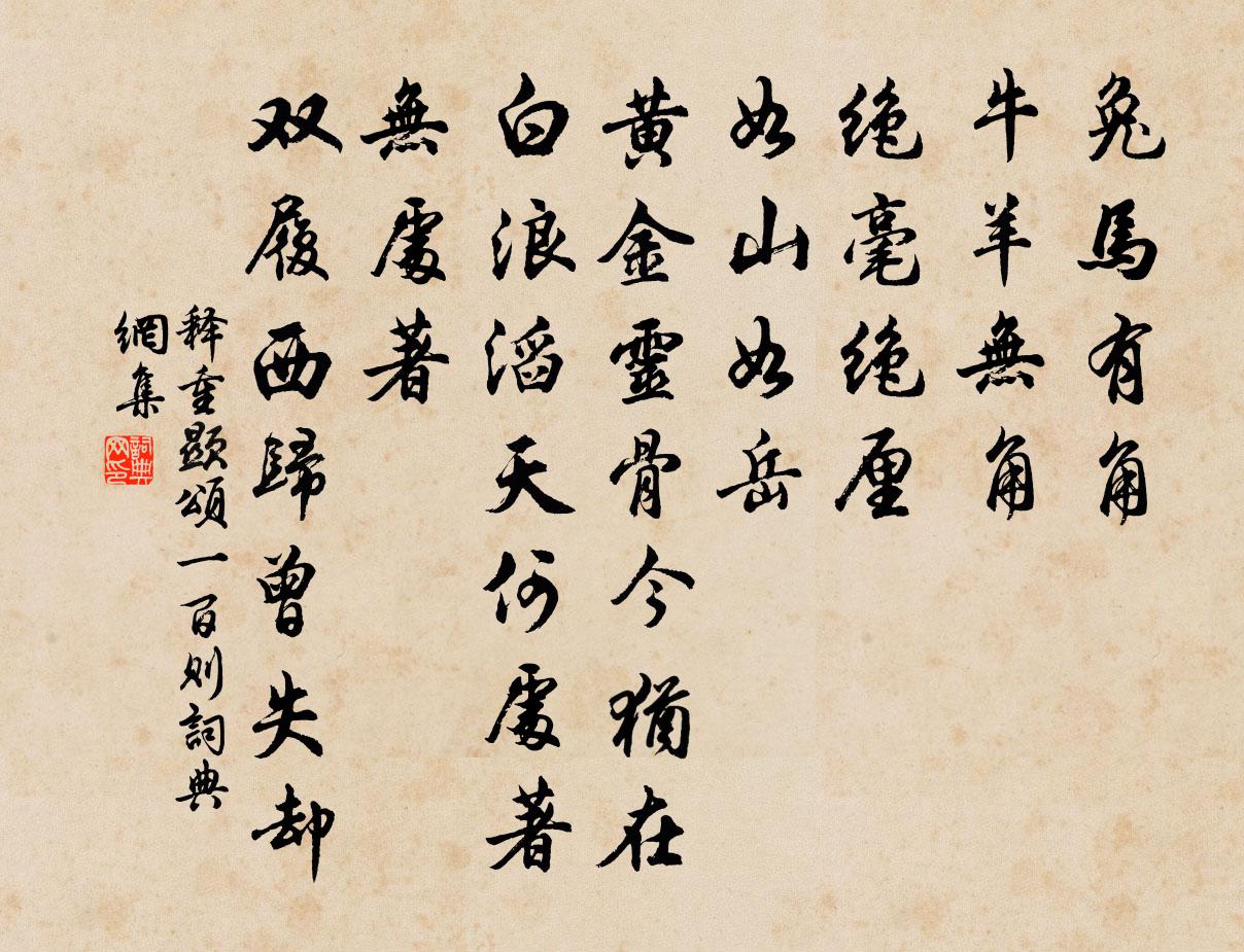 詩詞名句歷史字典書法欣賞書法字典國語詞典說文解字康熙字典古漢語字典標 題 作 者 詩 句 頌一百則作者:釋重顯 朝代:宋代頌一百則原文兔馬有角,牛羊無角。絕毫絕厘,如山如岳。黃金靈骨今猶在,白浪滔天何處著。無處著,雙履西歸曾失卻。詩詞問答問:頌一百則的作者是誰?答:釋重顯問:頌一百則寫於哪個朝代?答:宋代釋重顯頌一百則書法欣賞頌一百則書法作品詩詞推薦出居十六詠著圖書所方岳〔宋代〕鍾乳三千兩,胡椒八百斛。笑殺出中人,破紙塞故屋。定風波令(般涉調)張先〔宋代〕碧玉篦扶墜髻雲。鶯黃衫子退紅裙。妝樣巧將花草競。相併。要教人意勝於春。酒眼茸茸香拂面。□見。丹青寧似懷會稽錢昭度〔宋代〕斗牛星外翻成夢,巢鳥枝南略寄身。越國荷花八百里,別來誰是採蓮人。虎丘樓鑰〔宋代〕望望古招提,茲游恨已遲。池深驚地裂,野曠覺天垂。聽法人千數,談空松一枝。從誰訪遺蹟,惟有石頭知。寄題陳良臣頤軒四首劉子翬〔宋代〕啼鵑底用流血,渴水猶貪飲河。勿謂山雷象淺,人生口禍常多。與參徒辨事釋印肅〔宋代〕仲元亨老,殷勤圓淨。此中大事,雪曲高歌。騎白牛兒,漫空唱唱囉。這家也舂米,那畔爭打禾。且道乘誰力,天送龔實之赴官南安十韻黃公度〔宋代〕氣花合花地,魂銷惜別筵。離亭芳草外,飛花落花前。北闕舊通籍,南州先著鞭。卻詵丹桂早,萊子彩衣鮮。側耳蜉蝣佚名〔先秦〕蜉蝣之羽,衣裳楚楚。心之憂矣,於我歸處。蜉蝣之翼,采采衣服。心之憂矣,於我歸息。蜉蝣掘閱, * 如雪。憶昔陸游〔宋代〕憶昔高皇絀柄臣,招徠賢雋聚朝紳。寧知遺恨忽千載,追數同時無一人。薶骨九原應已朽,殘書數帙尚如新。此身萬年春王哲〔元代〕十化分梨,我於前歲生機構。傳神秀。二人翁母。待教作拿雲手。用破予心,笑破他人口。從今後。令伊依舊。且次韻贈清涼長老蘇軾〔宋代〕過淮入洛地多塵,舉扇西風欲污人。但怪雲山不改色,豈知江月解分身。安心有道年顏好,遇物無情句法新。送我恣逍遙姬翼〔元代〕圖名圖利,爭人競我。開眼後、一場**。誰高誰下,誰強誰弱。閻老子、一般籠里。事事俱休,般般打破。無拘十詩謝寥計使陳造〔宋代〕古今國士遇,揆我不盡無。頑鍾未容器,巧匠徒為模。即今鶚書上,逮此鶴髮余。但恐良夜夢,翩翾只江湖。宮詞王仲修〔宋代〕公卿拜舞進流霞,瑞氣祥煙動日華。殿下排場如綿繡,紫雲樓畔萬株花。送趙鼎臣赴召二首李曾伯〔宋代〕幾載江湖負雋聲,秋風千里起弓旌。石渠喜得今劉向,宣室應知舊賈生。台閣致身將貴顯,朝廷論事且和平。更須與成父自信同舟到饒分路而別以詩送之三首趙蕃〔宋代〕川行歷覽不知勞,我有新詩聽汝抄。今日文離還索句,況堪風雨滿江郊。用韻答游司直見寄洪咨夔〔宋代〕道在皇王帝霸間,古今同是一人寰。不愁垂白三千丈,獨喜飛黃十二閒。晚桂薦花熏鼎古,寒松墮子茗甌斑。山中念奴嬌(中秋)趙彥端〔宋代〕姮娥萬古,算清光常共、水清山綠。我欲蓬萊風露頂,眇視寰瀛一粟。攜手群仙,廣寒遊戲,玉砌琉璃屋。歸來一減字浣溪沙/浣溪沙賀鑄〔宋代〕夢想西池輦路邊。玉鞍嬌馬小輜軿。春風十里斗嬋娟。臨水登山漂泊地,落花中酒寂寥天。個般情味已三年。送區冊序韓愈〔唐代〕陽山,天下之窮處也。陸有丘陵之險,虎豹之虞。江流悍急,橫波之石,廉利侔劍戟,舟上下失勢,破碎淪溺者,名句推薦玄都觀里桃千樹,儘是劉郎去後栽。劉禹錫《元和十年自朗州至京戲贈看花諸君子 / 玄都觀桃花》 黃葉覆溪橋,荒村唯古木。柳宗元《秋曉行南谷經荒村》 觸簾風送景陽鍾,鴛被繡花重。顧敻《虞美人·觸簾風送景陽鍾》 但使情親千里近,須信。無情對面是山河。辛棄疾《定風波·席上送范廓之游建康》 雁行緣石徑,魚貫度飛梁。鮑照《代出自薊北門行》 草木雖無情,因依尚可生李白《樹中草》 傷心闊別三千里,屈指思量四五年。韓偓《寒食日重遊李氏園亭有懷》 夜合花開香滿庭,夜深微雨醉初醒。竇叔向《夏夜宿表兄話舊》 思親堂上茱初插,憶妹窗前句乍裁。秋瑾《九日感賦》 圓者之轉,非能轉而轉,不得不轉也;方者之止,非能止而止,不得不止也。尹文《尹文子·大道上》