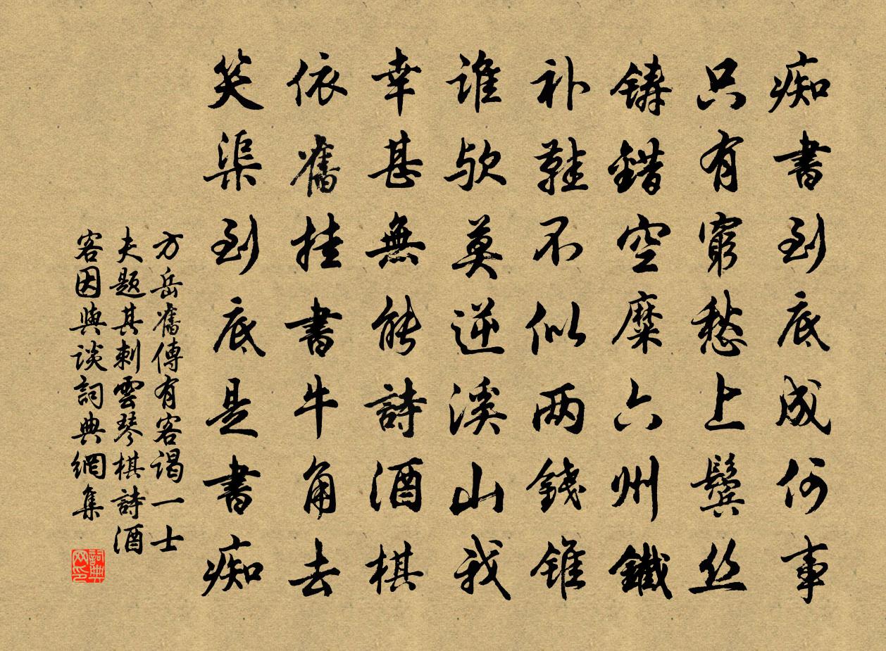 詩詞名句歷史字典書法欣賞書法字典國語詞典說文解字康熙字典古漢語字典標 題 作 者 詩 句 舊傳有客謁一士夫題其刺雲琴棋詩酒客因與談作者:方岳 朝代:宋代原文痴書到底成何事,只有窮愁上鬢絲。鑄錯空糜六州鐵,補鞋不似兩錢錐。誰歟莫逆溪山我,幸甚無能詩酒棋。依舊掛書牛角去,笑渠到底是書痴。詩詞問答問:《舊傳有客謁一士夫題其刺雲琴棋詩酒客因與談》的作者是誰?答:方岳問:該詩寫於哪個朝代?答:宋代書法欣賞舊傳有客謁一士夫題其刺雲琴棋詩酒客因與談書法作品詩文賞析【原題】:舊傳有客謁一士夫題其刺雲琴棋詩酒客因與談笑戲成此詩詩詞推薦山礬花張至龍〔宋代〕漫山白蕊殿春華,多貯清香野老家。頻向風前招蝶使,密通家籍省梅花。杭州春望白居易〔唐代〕望海樓明照曙霞,護江堤白踏晴沙。濤聲夜入伍員廟,柳色春藏蘇小家。紅袖織綾夸柿蒂,青旗沽酒趁梨花。誰開喝石岩李洪〔宋代〕信腳來游喝石岩,老來到處少同參。出家本是丈夫事,歲晚終期卜一庵。大周密〔宋代〕又子規啼,荼謝,寂寂春陰池閣。羅窗人病酒,奈牡丹初放,晚風還惡。燕燕歸遲,鶯鶯聲懶,閒罥鞦韆紅索。三感山十詠旃檀林姚勉〔宋代〕心清聞妙香,宴坐旃檀林。坐香元不斷,莫作死灰心。公子家 / 公子行 / 長安花聶夷中〔唐代〕種花滿西園,花發青樓道。花下一禾生,去之為惡草。送張郎中赴隴右覲省卿公(時張卿公亦充節度留後)岑參〔唐代〕中郎鳳一毛,世上獨賢豪。弱冠已銀印,出身唯寶刀。還家卿月迥,度隴將星高。幕下多相識,邊書醉懶操。孤山寺端上人房寫望林逋〔宋代〕底處憑闌思眇然,孤山塔後閣西偏。陰沉畫軸林間寺,零落棋枰葑上田。秋景有時飛獨鳥,夕陽無事起寒煙。遲留寄桐廬程宰劉過〔宋代〕路入嚴州去,桐廬得暫過。盤餐湯餅賤,機杼綺羅多。令尹喔詩治,居民酌酒歌。吏人公事少,門雀可張羅。泛舟陸游〔宋代〕水鄉元不減吳松,短棹沿洄野興濃。鬱郁冬青森翠葆,離離夜合散紅茸。村深初度穿林笛,寺近先聞出塢鍾。歸路過報恩張九成〔宋代〕籃與訪蕭寺,煙暝漲春空。遠樹樓頭綠,殘霞山外紅。昏鍾發林杪,人語殷橋東。回首都無跡,人生真夢中。雷老欲退普寧二絕句趙蕃〔宋代〕借閣看山且半年,看山未飽此為遷。聞師亦欲拋山去,只恐山靈未許然。次韻斯遠見夢有作六言二首趙蕃〔宋代〕幾欲罷官歸去,未應形役能拘。矗矗奇峰晚對,豈如雲谷同趨。宋宰不赴王倅招有詩次韻虞儔〔宋代〕冷宦門羅雀,高軒間不過。似聞諠棰楚,莫恨笑弦歌。會意庭前柏,輸香水面荷。道人觀物妙,宴坐養天和。六么令(京中清明)佚名〔宋代〕淡煙疏雨,香徑渺啼鴂。新晴畫簾閒卷,燕外寒猶力。依約天涯芳草,染得春風碧。人間陳跡?斜陽今古,幾縷游贈友人呂溫〔唐代〕南山雙喬松,擢本皆千尋。夕流膏露津,朝被青雲陰。負雪出深澗,搖風倚高岑。明堂久不構,雲乾何森森。匠意次韻張老見贈鄭俠〔宋代〕烏鴉螻蟻有君臣,此義如何易世塵。谷為無窮宗社計,肯憂如幻死生身。八千江上賓士路,十二天南黯淡春。歸到送可教僧歸越梅堯臣〔宋代〕萬事厭尋常,羨慕每不足。居南多北思,在遠慚近俗。既來橘變枳,但見空條綠。氣味誰復論,孤根逼岩曲。同王浚賢良賦龜得升字王安石〔宋代〕世傳一尾龜百齡,此龜逮見隋唐興。雖然天倖免焦灼,想屢縮頸愁嚴凝。前年赴滿不量力,欲替鰲負三崚嶒。番禺和劉後村梅花百詠方蒙仲〔宋代〕百年老樹半邊枯,眾卉難攀覺太孤。欲進素馨交茉莉,奈渠浪蕊欠根株。名句推薦建官惟賢,位事惟能。佚名《尚書·周書·武成》 把君詩卷燈前讀, 詩盡燈殘天未明。白居易《舟中讀元九詩》 夜寒茅店不成眠,殘月照吟鞭。吳激《訴衷情·夜寒茅店不成眠》 江南江北愁思,分付酒螺紅方岳《水調歌頭·平山堂用東坡韻》 覆巢之下,復有完卵劉義慶《世說新語·言語》 且趁閒身未老,盡放我、些子疏狂。蘇軾《滿庭芳·蝸角虛名》 守節自誓,親誨之學。歐陽修《畫地學書》 嶺樹重遮千里目,江流曲似九迴腸。柳宗元《登柳州城樓寄漳汀封連四州》 悵恨不逢如意酒。尋思難值有情人。晏幾道《浣溪沙·閒弄箏弦懶系裙》 冰合大河流,茫茫一片愁。納蘭性德《菩薩蠻·白日驚飈冬已半》