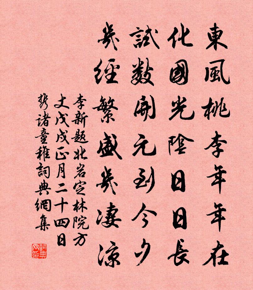 詩詞名句歷史字典書法欣賞書法字典國語詞典說文解字康熙字典古漢語字典標 題 作 者 詩 句 題北岩定林院方丈戊戍正月二十四日攜諸童稚作者:李新 朝代:宋代原文東風桃李年年在,化國光陰日日長。試數開元到今夕,幾經繁盛幾淒涼。詩詞問答問:《題北岩定林院方丈戊戍正月二十四日攜諸童稚》的作者是誰?答:李新問:該詩寫於哪個朝代?答:宋代書法欣賞題北岩定林院方丈戊戍正月二十四日攜諸童稚書法作品詩文賞析【原題】:題北岩定林院方丈戊戍正月二十四日攜諸童稚來游藉草而飲既醉書方丈小垣以去詩詞推薦又次韻宋茂叔送行五絕兼謝修叔趙蕃〔宋代〕平日長嗟取友難,年來頗得見班班。顧憐蹇卡終無及,天馬逍遙十二閒。朝中措吳儆〔宋代〕文章聲價擅南州。人物更風流。豈久徒勞州縣,看看催上瀛洲。朱顏綠鬢,畫堂標王,寶帶垂鏐。睡起八磚影轉,宮詞王仲修〔宋代〕紅乾綠淡有餘香,芳草芊綿苑路長。鶗鴃一聲寒食雨,游蜂應為百花忙。新春真山民〔宋代〕余凍雪初乾,初晴日驟暄。人心新歲月,春意舊乾坤。煙碧柳生色,燒青草返魂。東風無厚薄,隨例到衡門。士馬後見赤松舒道士貫休〔唐代〕滿眼盡瘡痍,相逢相對悲。亂階猶未已,一柱若為支。堰茗蒸紅棗,看花似好時。不知今日後,吾道竟何之。挽程子山侍講李流謙〔宋代〕我昔先君子,為公義林此。論儒摘寡要,太史固坐井。期公非敬知,力行福黎蠢。螭坳千載逢,鳳池一跬近。獨妍元和陳杰〔宋代〕元和天子聖,玉燭萬方同。乾坤一澄霽,草木皆春融。臣度再稽首,臣愬三鞠躬。一雪洗蔡州,敢有貪天功。造塔示眾釋印肅〔宋代〕求人不如求自己,自己肯時無不成。如今寶塔所將圓,諸人盡發一輪心。氣急 * 因悟道,靈山會上沒閒人。大小餞吳長文司理用修持賢業教無欠為韻裘萬頃〔宋代〕君姿正而剛,名節非所欠。臨歧贈一言,惟有學不厭。塞笛釋文珦〔宋代〕孤笛起寒洲,傳聲到暝樓。吹人元不怨,聽者自生愁。萬里家何所,三年戍未休。此時霜月下,白卻少年頭。鷺鷥歐陽修〔宋代〕激石灘聲如戰鼓,翻天浪色似銀山。灘驚浪打風兼雨,獨立亭亭意愈閒。示宋善威無名女鬼〔唐代〕月落三株樹,日映九重天。良夜歡宴罷,暫別庚申年。念奴嬌·赤壁懷古蘇軾〔宋代〕大江東去,浪淘盡,千古風流人物。故壘西邊,人道是,三國周郎赤壁。亂石穿空,驚濤拍岸,捲起千堆雪。(穿晚步松下張鎡〔宋代〕人皆束縛犯申時,我獨園居不必歸。最是蒼寒堂下好,亂松梢上看雲飛。出塞作王維〔唐代〕居延城外獵天驕,白草連天野火燒。暮雲空磧時驅馬,秋日平原好躲雕。護羌校尉朝乘障,破虜將軍夜渡遼。玉靶贈術士羅世忠王之道〔宋代〕春秋有羅國,之子豈其後。害傳錦囊書,相地走淮右。為問何所宗,此法古所授。卜瀍與卜宅,周孔語非謬。用能奉祠後作張元乾〔宋代〕八請犯天顏,今朝出漢關。渾如倦飛鳥,日暮傍巢還。病起小飲陸游〔宋代〕病起新霜滿鬢蓬,憑高一笑與誰同?酒如淥靜春江水,人有鴻荒太古風。野寺鐘來夕陽外,寒山空插亂雲中。一官竹外海棠衛宗武〔宋代〕我有三徑園,今為牛馬皂。傍家尋丈地,昔未長荼蓼。琅玕數十挺,新培歲可考。幻出一庭陰,咫尺成深窈。客來憶仲子姜特立〔宋代〕吟喔五字有規模,妙處時時亦起予。送老百年將付汝,豈知顏如請吾車。名句推薦侵夜鸞開鏡,迎冬雉獻裘。李商隱《陳後宮》 當年志氣俱消盡,白髮新添四五莖。薛逢《長安夜雨》 日照香爐生紫煙,遙看瀑布掛前川。李白《望廬山瀑布》 大禹理百川,兒啼不窺家李白《公無渡河》 等閒變卻故人心,卻道故人心易變。納蘭性德《木蘭花·擬古決絕詞柬友》 休說鱸魚堪膾,盡西風,季鷹歸未?辛棄疾《水龍吟·登建康賞心亭》 暖雨晴風初破凍,柳眼梅腮,已覺春心動。李清照《蝶戀花·暖雨晴風初破凍》 賭勝馬蹄下,由來輕七尺。李頎《古意》 行人與我玩幽境,北風切切吹衣冷。李頎《少室雪晴送王寧》 富貴易生禍端,必忠厚謙恭,才無大患王永彬《圍爐夜話·第六三則》