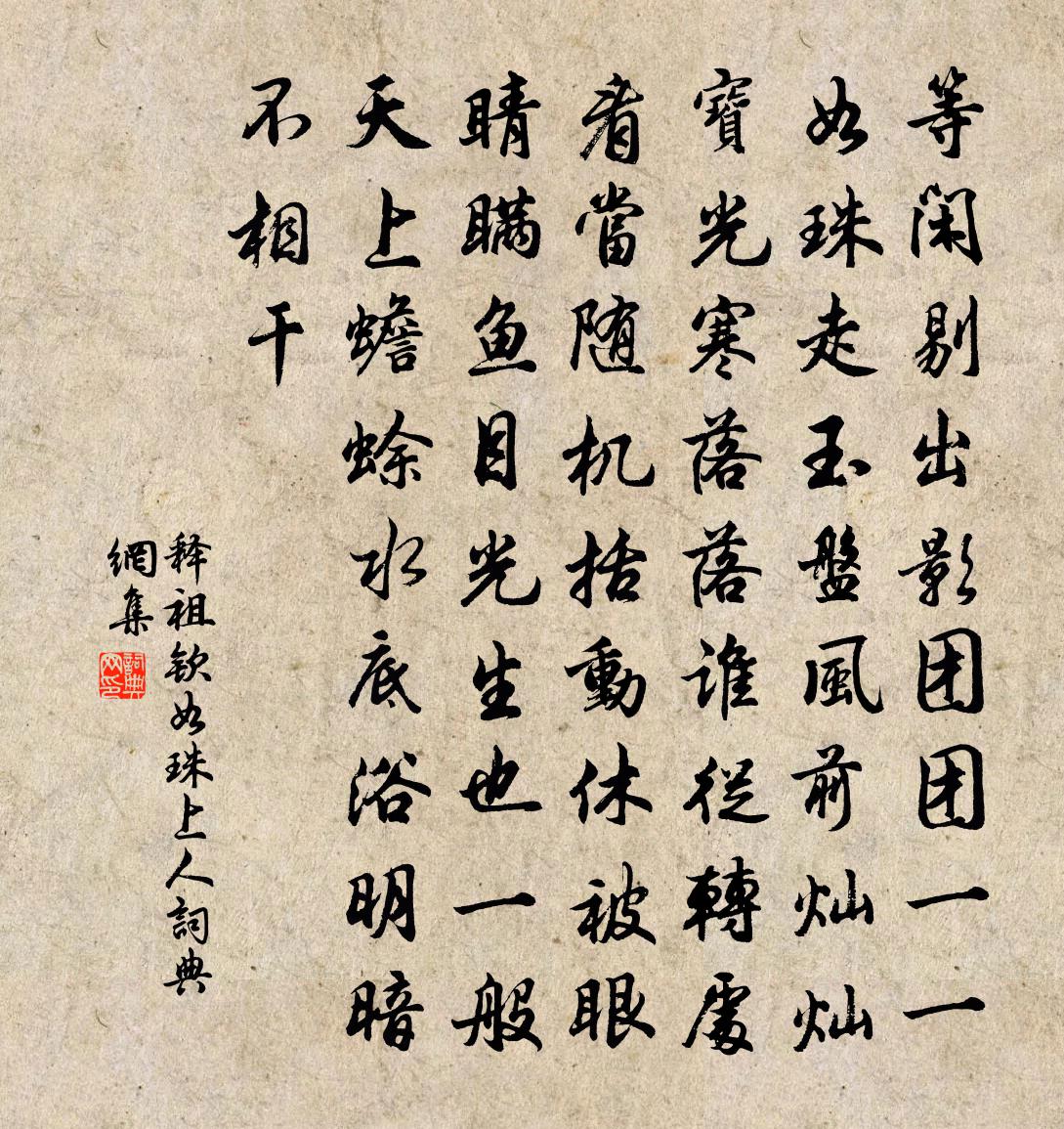 詩詞名句歷史字典書法欣賞書法字典國語詞典說文解字康熙字典古漢語字典標 題 作 者 詩 句 如珠上人作者:釋祖欽 朝代:宋代如珠上人原文等閒剔出影團團,一一如珠走玉盤。風前燦燦寶光寒,落落誰從轉處看。當隨機括動,休被眼睛瞞,魚目光生也一般。天上蟾蜍水底浴,明暗不相干。詩詞問答問:如珠上人的作者是誰?答:釋祖欽問:如珠上人寫於哪個朝代?答:宋代釋祖欽如珠上人書法欣賞如珠上人書法作品詩詞推薦小重山蔡伸〔宋代〕之籌邊閣,誠不負所聞。明年歸,則陳已入道矣。崔守呼之至,即席贈此流水桃花小洞天。壺中春不老,勝塵寰。避亂柯岩綠坡諸公以詩見寄王鎡〔宋代〕柯栝各西東,音書久不通。山河隔今古,天地老英雄。局敗橫難著,愁多酒易中。花前多少恨,無語寄春風。破榴施樞〔宋代〕峰殼盈盈萬顆珠,潤於瑪瑙浸冰壺。吟心先自清如水,嚼了寒霜骨更臞。畏愛吟邵雍〔宋代〕人有正性,事事皆齊。人無正性,事事皆隳。失於用恩,以非為是。失於用威,以是為非。恩威既失,畏愛何知。郊廟歌辭。太清宮樂章。再上佚名〔唐代〕仙宗績道,我李承天。慶深虛極,符光象先。俗登仁壽,化闡蟺涓。五千貽範,億萬斯年。過漢武望仙宮在鄜寺之西三絕句晁說之〔宋代〕山下時時聞鳳簫,山中處處得蟠桃。劉郎仙去何難事,不用飛樓百尺高。金山寺曾鞏〔宋代〕塵外岧巉鷲嶺宮,架虛排險出青紅。林光巧轉滄波上,海色遙涵白日東。夜靜神龍聽呪食,秋深蒼鶻起搏風。連荊觀有唐吟邵雍〔宋代〕天生神武奠中央,不爾群凶未易攘。貞觀若無風凜凜,開元安有氣揚揚。憑同始見山河壯,入夏方知日月長。三百暗香汪元量〔宋代〕館娃艷骨。見數枝雪裡,爭開時節。底事化工,著衣陽和暗偷泄。偏把紅膏染質,都點綴、枝頭如血。最好是、院秋風函谷應詔徐賢妃〔唐代〕秋風起函谷,勁氣動河山。偃松千嶺上,雜雨二陵間。低雲愁廣隰,落日慘重關。此時飄紫氣,應驗真人還。途次長安上都漕傅諫議蘇洵〔宋代〕丈夫正多念,老大不自安。居家不能樂,忽忽思中原。慨然棄鄉廬,劫劫道路間。窮山多虎狼,行路非不難。昔者次友人示詩集姚勉〔宋代〕杖藜看筍數犀株,天墮香雲五色書。落月照人驚夢昨,光風識面記春初。珠駢巧語誰能揀,錦比新詩迥不如。轉讀筇竹杖歌蔡戡〔宋代〕我有一枝筇,夭矯如游龍。由來博望使西域,萬里持寄衰病翁。自蜀歷楚入吳越,名山勝地多留蹤。先排衡山雲,同子瞻送子敦赴河北都運次韻范祖禹〔宋代〕顧公涉滄海,宇宙觀奇偉。十年守沈冥,應笑柱下史。動靜雖有殊,要之蓋棺已。邇來拜東台,岩穴彈冠喜。昂藏自詠宋祁〔宋代〕客舍張羅靜,流年激箭過。愁餘驚斛滿,淚盡覺珠多。鶗{左夬右鳥}悲秋極,芎藭奈疾何。振纓清濁水,持酒短送王宣慰中齋上溫州方回〔宋代〕兩朝參預慶源長,愧我蒹葭玉樹傍。先世幸聯龍虎榜,難兄復接鷺鵷行。江東連帥迎前纛,浙左侯藩餞去艎。每愧蜘蛛和韻李曾伯〔宋代〕物有小而智,虛檐寄微縷。了不介天地,何以芘風雨。蜂蠆嘗自投,螳螂不敢侮。去面類湯綱,取象得羲罟。絲吐辛卯歲應舉過西峽渡林亦之〔宋代〕白鹿山頭雲欲頹,峽門灘下水如雷。錦囊破裂元無用,席帽嶔崎還更來。我自未能逃世俗,人誰便解脫塵埃。扁舟次韻邵子文感春之什郭印〔宋代〕池塘不似昔年春,蝶亂蜂狂更惱人。莫傍花叢看婉娩,且懷詩卷誦清新。山林祗管縈魂夢,寰宇無端變劫塵。遙想前利路運判沖佑李君輓詩二首魏了翁〔宋代〕從橐心知舊,樞庭肺腑親。不從呼爾食,寧獨曳其輪。吳子傑魁士,黃公忠藎臣。所知非所厚,亦足驗為人。名句推薦春風桃李花開日,秋雨梧桐葉落時。白居易《長恨歌》 神人之言微,聖人之言簡,賢人之言明,眾人之言多,小人之言妄。陳繼儒《小窗幽記·集醒篇》 不逆命,何羨壽?不矜貴,何羨名?不要勢,何羨位?不貪富,何羨貨?列子及其弟子《列子·楊朱》 舊時燕子還飛否?今古不勝情。歸莊《錦堂春·半壁橫江矗起》 何日請纓提銳旅,一鞭直渡清河洛。岳飛《滿江紅·登黃鶴樓有感》 鳳林關里水東流,白草黃榆六十秋。張籍《涼州詞三首·其三》 香到酴醾送晚涼,荇風輕約薄羅裳。曲闌憑遍思偏長。葉小鸞《浣溪沙·初夏》 燕子不歸春事晚,一汀煙雨杏花寒。戴叔倫《蘇溪亭》 一年最好,偏是重陽。吳文英《惜黃花慢·菊》 柳如眉,雲似發,鮫綃霧縠籠香雪。魏承班《漁歌子·柳如眉》