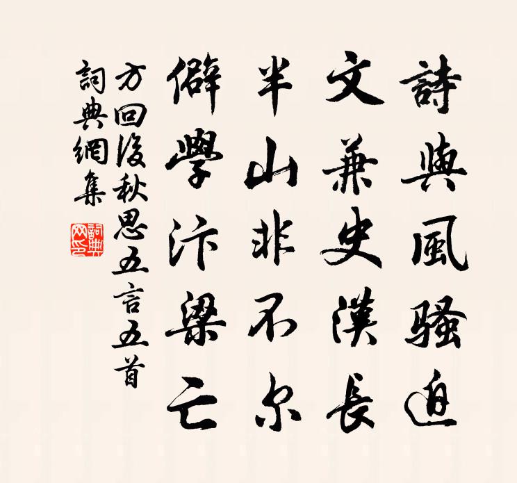 詩詞名句歷史字典書法欣賞書法字典國語詞典說文解字康熙字典古漢語字典標 題 作 者 詩 句 後秋思五言五首作者:方回 朝代:宋代後秋思五言五首原文詩與風騷迫,文兼史漢長。半山非不爾,僻學汴梁亡。詩詞問答問:後秋思五言五首的作者是誰?答:方回問:後秋思五言五首寫於哪個朝代?答:宋代方回後秋思五言五首書法欣賞後秋思五言五首書法作品詩詞推薦朱村道中趙蕃〔宋代〕綠竹人家近小塘,暮秋村釀熟村場。我行甚亟忘休歇,孤負木犀來往香。次韻答邢居實二首陳師道〔宋代〕秋來為客意何如,千里山河信不疏。昔日老人今則少,不妨紅葉閉門書。閒中偶詠陸游〔宋代〕舉世紛紛名利間,天公偏賦此身閒。塵衣濯罷滄浪水,茅舍歸來會計山。鄰舍擎盤分麥飯,野人曳杖叩柴關。酒逋贈胡端本顯伯教諭二首方回〔宋代〕星□□□□諸胡,鄉里人人仰范模。韜養沉潛求大□,□揮□□號通□。□生不出跧吟屋,垂老□□□□□。□□梨花原曾幾〔宋代〕酒渴上安市,甘寒為解園。鵝兒黃不見,空見鷺鷥飛。易元吉抱櫟狨文同〔宋代〕老櫟抱擁腫,金狨立鬅鬙。當年隴山道,似此見危層。和段相公登武擔寺西台溫會〔唐代〕桑台煙樹中,台榭造雲空。眺聽逢秋興,篇辭變國風。坐愁高鳥起,笑指遠人同。始愧才情薄,躋攀繼韻窮。春草楊基〔明代〕嫩綠柔香遠更濃,春來無處不茸茸。六朝舊恨斜陽里,南浦新愁細雨中。近水欲迷歌扇綠,隔花偏襯舞裙紅。平川岩齋吳可〔宋代〕誰知望雲眼,犯此沒馬塵。故山招不歸,定為猿鶴嗔。煌煌帝王州,喜有東山人。頻來雲霧齋,閱公碧璘珣惱四鄰送韓揆之江西(一作送閻伯鈞往江州)李冶〔唐代〕相看指楊柳,別恨轉依依。萬里江西水,孤舟何處歸。湓城潮不到,夏口信應稀。唯有衡陽雁,年年來去飛。次韻賓暘某氏墳庵方回〔宋代〕讀君古墓作,因之懷抱縈。老夫九年前,小雛憐寧馨。一夕病弗起,殤車出北城。卜兆鄰古寺,守訶乏村氓。去歲故李承誠之待制六丈輓詞蘇軾〔宋代〕青青一寸松,中有梁棟姿。天驥墮地走,萬里端可期。世無阿房宮,可建五丈旗。又無穆天子,西征燕瑤池。才大贊護教釋印肅〔宋代〕契那一通,方全六用。護持般若,法身不動。題刊字蔡生方岳〔宋代〕六經四十三萬字,古未版行天所秘。魯才得見易春秋,書到漢時猶墨記。不知何年有爾曹,誤我百世惟寸刀。日傳同錢員外題絕糧僧巨川白居易〔唐代〕三十年來坐對山,唯將無事化人間。齋時往往聞鍾笑,一食何如不食閒?台灣竹枝詞梁啓超〔清代〕韭菜花開心一枝,花正黃時葉正肥。願郎摘花連葉摘,到死心頭不肯離。首句直用原文。偶至郡城姜特立〔宋代〕老矣息奔走,胡為此登途。行李雖草草,客懷亦舒舒。傾我壺中醉,閱我袖間書。在我故云好,愛此暫時娛。感義李覯〔宋代〕懊惱常人只好儒,古來忠義出屠沽,試將朱亥相倫擬,幾個衣冠是丈夫。贈王寂蘇軾〔宋代〕與君暫別不須嗟,俯仰歸來鬢未華。記取江南煙雨里,青山斷處是君家。游李少師園十題松島范祖禹〔宋代〕孤嶼何亭亭,蒼松郁相對。池中蛟龍起,天際風雨會。名句推薦遼東小婦年十五,慣彈琵琶解歌舞。李頎《古意》 險韻詩成,扶頭酒醒,別是閒滋味。李清照《念奴嬌·春情》 統豺虎,御邊幅,號令明,軍威肅。宋江《滿江紅·喜遇重陽》 小荷才露尖尖角,早有蜻蜓立上頭。楊萬里《小池》 雲鬟綠鬢罷梳結,愁如回飆亂白雪。李白《久別離》 民不畏死,奈何以死懼之?老子《老子·德經·第七十四章》 春潮帶雨晚來急,野渡無人舟自橫。韋應物《滁州西澗》 玉可碎而不可改其白,竹可焚而不可毀其節。羅貫中《三國演義·第七十六回》 百里不販樵,千里不販糴。司馬遷《史記·七十列傳·貨殖列傳》 欲買桂花同載酒,終不似,少年游。劉過《唐多令·蘆葉滿汀洲》