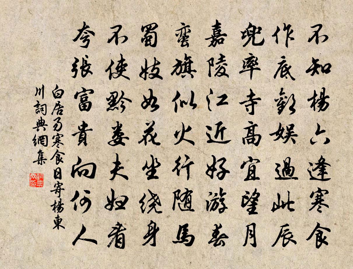 不知楊六逢寒食,作底歡娛過此辰?兜率寺高宜望月,嘉陵江近好遊春。蠻旗似火行隨馬,蜀妓如花坐繞身。