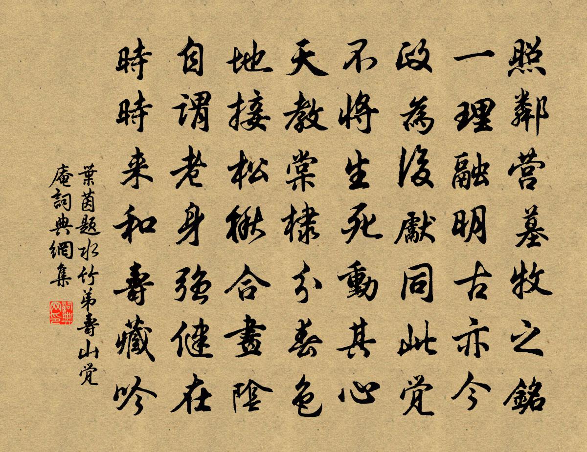 詩詞名句歷史字典書法欣賞書法字典國語詞典說文解字康熙字典古漢語字典標 題 作 者 詩 句 題水竹弟壽山覺庵作者:葉茵 朝代:宋代題水竹弟壽山覺庵原文照鄰營墓牧之銘,一理融明古亦今。政為後先同此覺,不將生死動其心。天教棠棣分春色,地接松楸合畫陰。自謂老身強健在,時時來和壽藏吟。詩詞問答問:題水竹弟壽山覺庵的作者是誰?答:葉茵問:題水竹弟壽山覺庵寫於哪個朝代?答:宋代葉茵題水竹弟壽山覺庵書法欣賞題水竹弟壽山覺庵書法作品詩詞推薦三月二十日詔宴樂遊園賦得風字張說〔唐代〕樂游形勝地,表里望郊宮。北闕連天頂,南山對掌中。皇恩貸芳月,旬宴美成功。魚戲芙蓉水,鶯啼楊柳風。春光雲溪寺曾宋珍〔宋代〕溪水年年自淺深,山雲日日半晴陰。溪山好處劃開眼,看水看出悟此心。暮春泛西湖次口號韻呈程待制十首陳造〔宋代〕重到西湖可便回,前年待得水芝開。憑君問取閒鷗鷺,親見跳珠濺客來。望韓公堆崔滌〔唐代〕韓公堆上望秦川,渺渺關山西接連。孤客一身千里外,未知歸日是何年。第五十五卷題長洲陳明府小亭方乾〔唐代〕坐看孤峭卻勞神,還是微吟到日曛。松鶴認名呼得下,沙蟬飛處聽猶聞。夜闌亦似深山月,雨後唯關滿屋雲。便此奉和魯齋先生涵古齋詩二首金履祥〔宋代〕圓融無際大無餘,萬象森然本不癯。百聖淵源端有在,六經芳潤幾曾枯。人於心上知涵處,古在書中非遠圖。會到送忍禪師歸廬岳(一作送廬岳僧。一作朱慶餘詩)周賀〔唐代〕浪匝湓城岳壁青,白頭僧去掃禪扃。龕燈度雪補殘衲,山日上軒看舊經。泉水帶冰寒溜澀,薜蘿新雨曙煙腥。已知經旬釋文珦〔宋代〕經旬坐春雨,畏濕不下席。曉年籬角萱,怒長忽過尺。仆所藏仇池石希代之寶也王晉卿以小詩借觀,蘇軾〔宋代〕海石來珠宮,秀色如蛾綠。坡陀尺寸間,宛轉陵巒足。連娟二華頂,空洞三茅腹。初疑仇池化,又恐瀛洲蹙。殷勤好事近趙長卿〔宋代〕劍水靄歡聲,喜慶間生人傑。一段蔥蔥佳氣,扇薰風時節。今朝銀艾佐琴堂,爭把壽香爇。去去鳳皇池上,見龜巢玉笥山李與〔宋代〕葛峰相對為文筆,蕭水迴環當墨池。說與晚衙休報事,長官亭上有新詩。贈餘乾袁明府曹松〔唐代〕一雨西城色,陶家心自清。山銜中郭分,雲卷下湖程。公署聞流木,人煙入廢城。難忘楚盡處,新有越吟生。題桃源圖錢選〔宋代〕始信桃源隔幾秦,後來無復問津人。武陵不是花開晚,流到人間卻暮春。次韻慈奧寂照院僧石岩花史浩〔宋代〕谿山朔雪銷籬落,始聞花信驚梅萼。韶華一瞬掉頭去,滿眼園林成翠幄。誰知幽谷猶藏春,萬蔕千跗意態新。霞光小樓陸游〔宋代〕吾州近在西山麓,雪山萬仞臨冰谷。小樓森森閱三伏,清簟疏簾對棋局。肌膚淒凜起芒粟,肝肺崢嶸疊瓊玉。香泉羅提舉見和再用韻四首陳造〔宋代〕斬山木寧為民,焚巫尪恐傷仁。看書飢而不害,公政無慚古人。十月二十二日晚作三首張耒〔宋代〕蓬萬無奧處,北風利戈鋋。空爐有微火,且復與周旋。酒隱柴桑叟,醉吟渭上賢。二士忽已遠,遺風載陳編。偈頌一百四十一首釋師範〔宋代〕摩騰入漢,平地風波。達磨西工業區,重增殃禍。臨洺驛雨中作強至〔宋代〕朔野無花春意薄,斧聲惟見桑枝落。北人是日競條桑,手執懿筐共操作。客亭系馬吟寒廳,細雨纏愁牢似縛。多情貢院題魏扶〔唐代〕梧桐葉落滿庭陰,鎖閉朱門試院深。曾是昔年辛苦地,不將今日負初心。名句推薦問元戎早晚,鳴鞭徑去,解天山箭。元好問《水龍吟·從商帥國器獵於南陽同仲澤鼎玉賦此》 玉輪碾平芳草,半面惱紅妝。陳子龍《訴衷情·春遊》 辛苦遭逢起一經,干戈寥落四周星。文天祥《過零丁洋》 人生得意須盡歡,莫使金樽空對月。李白《將進酒》 當時相候赤欄橋,今日獨尋黃葉路。周邦彥《玉樓春·桃溪不作從容住》 牛羊自歸村巷,童稚不識衣冠。王維《田園樂七首·其四》 女蘿發馨香,菟絲斷人腸。李白《古意》 能令暫開霽,過是吾無求。韓愈《洞庭湖阻風贈張十一署·時自陽山徙掾江陵》 同惡相助,同好相留,同情相成,同欲相趨,同利相死。司馬遷《史記七十列傳·吳王濞列傳》 壯年何事憔悴,華發改朱顏。蘇舜欽《水調歌頭·滄浪亭》
