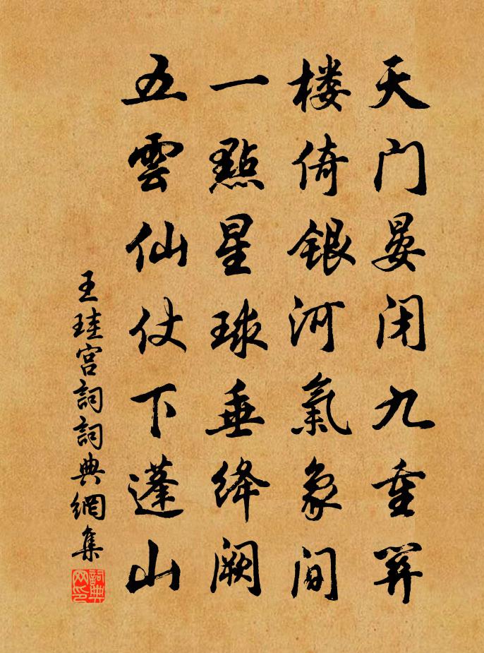 詩詞名句歷史字典書法欣賞書法字典國語詞典說文解字康熙字典古漢語字典標 題 作 者 詩 句 宮詞作者:王珪 朝代:唐代宮詞原文天門晏閉九重關,樓倚銀河氣象間。一點星球垂絳闕,五雲仙仗下蓬山。詩詞問答問:宮詞的作者是誰?答:王珪問:宮詞寫於哪個朝代?答:唐代王珪宮詞書法欣賞宮詞書法作品詩詞推薦徒步訪李宣叔宣叔有詩依韻答梅堯臣〔宋代〕渡河誰道去,我重子云才。鴻雁汀洲去,牛羊井落徠。乍行初覺倦,暫語不能該。日色看看暮,將歸意復徊。寄節維那釋智愚〔宋代〕幾度忘言話克賓,叢林音響許誰聞。海山秋夜對孤月,應記北高峰頂雲。句胡銓〔宋代〕眼明漸見天涯驛,腳力將窮地盡州。上官昭容書樓歌呂溫〔唐代〕漢家婕妤唐昭容,工詩能賦千載同。自言才藝是天真,不服丈夫勝婦人。歌闌舞罷閒無事,縱恣優遊弄文字。玉樓偈頌一百一十七首釋紹曇〔宋代〕截流機,分涇渭。清濁淺深,窮源倒底。三腳驢子弄蹄行,踏過何曾沾著水。芝峰家醜外揚,也是碓坊洿米。低聲江上阻風宋琬〔清代〕睡起無聊倚舵樓,瞿塘西望路悠悠。長江巨浪征人淚,一夜西風共白頭。次韻洪谷瑞見和蘇籀〔宋代〕此間空洞最無奇,整整從繩僅滿規。併譜沈薌及苓藿,公言羊質錄鴞鴟。禿巾鮑肆穿芒屩,爭席畦丁與馬醫。海浸偈三首釋道如〔宋代〕一二三,四五六,碧眼胡僧數不足。泥牛入海過新羅,木馬追風到天竺。天竺茫茫何處尋,補陀岩上問觀音。普賢郊廟歌辭。釋奠武成王樂章。迎俎酌獻佚名〔唐代〕五齊潔,九牢碩。梡橛循,罍斝滌。進具物,揚鴻績。和奏發,高靈寂。虔告終,繁祉錫。昭秩祀,永無易。友人官滿陳郁〔宋代〕三年官滿冰霜潔,一日春回宇宙寬。曾向廳前種楊格,綠陰留與後人看。自述陸游〔宋代〕睡美不知旦,氣衰先覺秋。有時浮小艇,隨意宿滄洲。未恨名風漢,惟求拜醉侯。更須多種竹,搔首送悠悠。句王貽永〔宋代〕河朔雪深思愛月,並門春暖詠甘棠。和仲文西湖野步至新堰二首梅堯臣〔宋代〕決決堰根水,層層湖上田。寒魚猶著底,白鷺已發前。履惜春泥滑,衣從澀蔓牽。偶來成野望,歸興自留連。偶作方乾〔唐代〕直為篇章非動眾,遂令軒蓋不經過。未妨溪上泛漁艇,又為門前張雀羅。夜學事須憑雪照,朝廚爭奈絕煙何。若於送明甫初筮十首劉克莊〔宋代〕先緒微如線,未知誰亢宗。翁猶慚父祖,汝可復慚翁。禹廟施樞〔宋代〕袞服嚴常祀,平萬萬世功。圭璋藏道室,弓劍莽幽宮。石定今猶在,梅梁事莫窮。幽尋須作計,多恨雨匆匆。送智道者仲並〔宋代〕胸中歷歷幾山川,竹杖芒鞋四十年。赤手旋為新活計,白頭猶作舊因緣。如如炒境無多事,了了真心不礙禪。安坐宴湖上呈穉卿韓維〔宋代〕熠熠螢光草際流,及時高宴落霞洲。繁弦急管宜清月,細蕊濃芳艷晚秋。飛鷺欲來迎畫舫,跳鱗如喜脫金鉤。知公七夕王之望〔宋代〕西風只繁暑,夜氣初宜秋。所居稍虛豁,得以消我憂。獨眠堂中央,一榻無衾裯。開軒敞南北,涼飈入翛翛。是日淮南送友人歸滄州李頻〔唐代〕風色忽西轉,坐為千里分。高帆背楚落,寒日逆淮曛。斷燒緣喬木,盤雕隱片雲。鄉關百戰地,歸去始休軍。名句推薦土花曾染湘娥黛,鉛淚難消。納蘭性德《採桑子·土花曾染湘娥黛》 本是同根生,相煎何太急?曹植《七步詩》 桃花落,閒池閣。山盟雖在,錦書難托。陸游《釵頭鳳·紅酥手》 力勝貧,謹勝禍,慎勝害,戒勝災。劉向《說苑·談叢》 花影不離身左右,鳥聲只在耳東西。曹雪芹《紅樓夢·第二十八回》 半死梧桐老病身,重泉一念一傷神。白居易《為薛台悼亡》 綠樹村邊合,青山郭外斜。孟浩然《過故人莊》 遊子春衫已試單,桃花飛盡野梅酸。吳濤《絕句·遊子春衫已試單》 宿醉離愁慢髻鬟,六銖衣薄惹輕寒,慵紅悶翠掩青鸞韓偓《浣溪沙·宿醉離愁慢髻鬟》 昔去雪如花,今來花似雪。范雲《別詩》