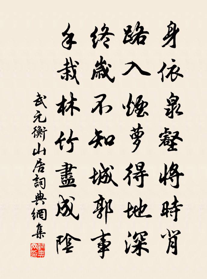 詩詞名句歷史字典書法欣賞書法字典國語詞典說文解字康熙字典古漢語字典標 題 作 者 詩 句 山居作者:武元衡 朝代:唐代山居原文身依泉壑將時背,路入煙蘿得地深。終歲不知城郭事,手栽林竹盡成陰。詩詞問答問:山居的作者是誰?答:武元衡問:山居寫於哪個朝代?答:唐代問:山居是什麼體裁?答:七絕武元衡山居書法欣賞山居書法作品注釋全唐詩:卷317-73詩詞推薦夜坐讀書聞瓶梅之香口占五絕趙蕃〔宋代〕一從叢桂落秋風,佳處長孤阿堵中。及至梅花又冰雪,一枝雖少與多同。送表侄達師歸鄱陽徐鉉〔唐代〕故鄉禾黍世親稀,中表相尋只有師。惆悵離懷向何許,鄱陽湖上葉飛時。鷓鴣天臧魯子〔宋代〕虎踞龍蟠萬古雄。橫飛一節大江東。今歸定作鸞坡客,筆底山川寫不窮。吟絮柳,賦東風。年年春在建章宮。天教賀聖朝王哲〔元代〕仲冬佳節,靈童來報,陽氣初升。黃芽齊吐,玉漿澆溉,榮布層層。甲方瓊秀,庚方金彩,相間星能。把明珠祥艷題天童舒坦〔宋代〕日日青鞋踏白沙,未應泛艇即靈槎。雨溪清越鳴哀玉,風蔓蜿蜓動暗蛇。曉潤芝{上竹下差}挑秀茁,午香茶灶煮瓶梅宋伯仁〔宋代〕南枝斜插古軍持,瘦影參差落硯池。莫道人家窗戶暖,等閒忘卻隴頭時。洋州三十景無言亭鮮于侁〔宋代〕葉上花露泣,軒前紅日長。游風復為誰,時送席間香。夜讀王承家縣丞詩編樓鑰〔宋代〕鍊句工深與味長,固知家學富青箱。莫言一臠能嘗鼎,更欲為余傾錦囊。法喜涇長老請贊釋大觀〔宋代〕有準繩,無捉措。開口錯商量,鐵蒺藜確確。日冷月熱,涇清渭濁,昨夜鳳巢生鸑鷟。夢回劉克莊〔宋代〕跳出槐安有底忙,何須更待熟黃粱。牙籤載返善和宅,手板抽回政事堂。效玉川生稱銳漢,愛楊處士號憨郎。山中水殿拋球曲二首李謹言〔唐代〕侍宴黃昏曉未休,玉階夜色月如流。朝來自覺承恩最,笑倩傍人認繡球。堪恨隋家幾帝王,舞裀揉盡繡鴛鴦。如今滿路花/促拍滿路花方千里〔宋代〕鶯飛翠柳搖,魚躍浮萍破。班班紅杏子,交榴火。池台晝永,繚繞花陰裹。山色遙供座。枕簟清涼,北窗時喚高臥致仕後歲事有望欣然賦詩陸游〔宋代〕聖時恩厚賜餘生,日與鄉閭樂太平。已棄胡床無長物,尚攜拄杖有同行。新裁烏帽人爭看,小摘青蔬手自烹。買得喜見周司法和詩有贈仍用元韻趙蕃〔宋代〕路絕嶺梅贈,江搖沅茝春。敢雲傾蓋故,喜甚誦詩新。刀筆非吾事,文章可致身。江陵法曹掾,寧久滯斯人。襄王不許請隧佚名〔先秦〕晉文公既定襄王於郟,王勞之以地,辭,請隧焉。王弗許,曰:“昔我先王之有天下也,規方千里,以為甸服,以挽雲屋徐侍郎王義山〔宋代〕闔朝奔逸盪無關,夜半瀟瀟風雨寒。世亂爭先尋活路,時貧輸與做窮官。平生自謂學無事,一死諒非君所難。到此陌上花八首晁補之〔宋代〕雲母蠻箋作信來,佳人陌上看花回。妾行不似東風急,為報花須緩緩開。琴操十首。拘幽操韓愈〔唐代〕(文王羑里作。古琴操云:殷道溷溷,浸濁煩兮。朱紫相合,不別分兮。迷亂聲色,信讒言兮。炎炎之虐,使我愆花石詩十一章鄧肅〔宋代〕皇帝之圃浩無涯,日月所照同一家。北連幽薊南交趾,東極蟠木西流沙。清明日舟中書事二首張耒〔宋代〕巢烏噪處綠楊村,寒食人家晝掩門。麥隴曉風收宿潤,煙林午日漲黃昏。名句推薦鐘山抱金陵,霸氣昔騰發。李白《登梅岡望金陵贈族侄高座寺僧中孚》 日入室中暗,荊薪代明燭。陶淵明《歸園田居·其五》 春欲盡,日遲遲,牡丹時歐陽炯《三字令·春欲盡》 我最憐君中宵舞,道男兒到死心如鐵。辛棄疾《賀新郎·同父見和再用韻答之》 雪月最相宜,梅雪都清絕。張孝祥《卜運算元·雪月最相宜》 玉人垂釣理纖鉤。月明池閣夜來秋。吳文英《浣溪沙·秋情》 天下無難事,只怕有心人。曹雪芹《紅樓夢·第四十九回》 崑山玉碎鳳凰叫,芙蓉泣露香蘭笑。李賀《李憑箜篌引》 故人南燕吏,籍籍名更香。岑參《至大梁卻寄匡城主人》 近鄉情更怯,不敢問來人。宋之問《渡漢江》