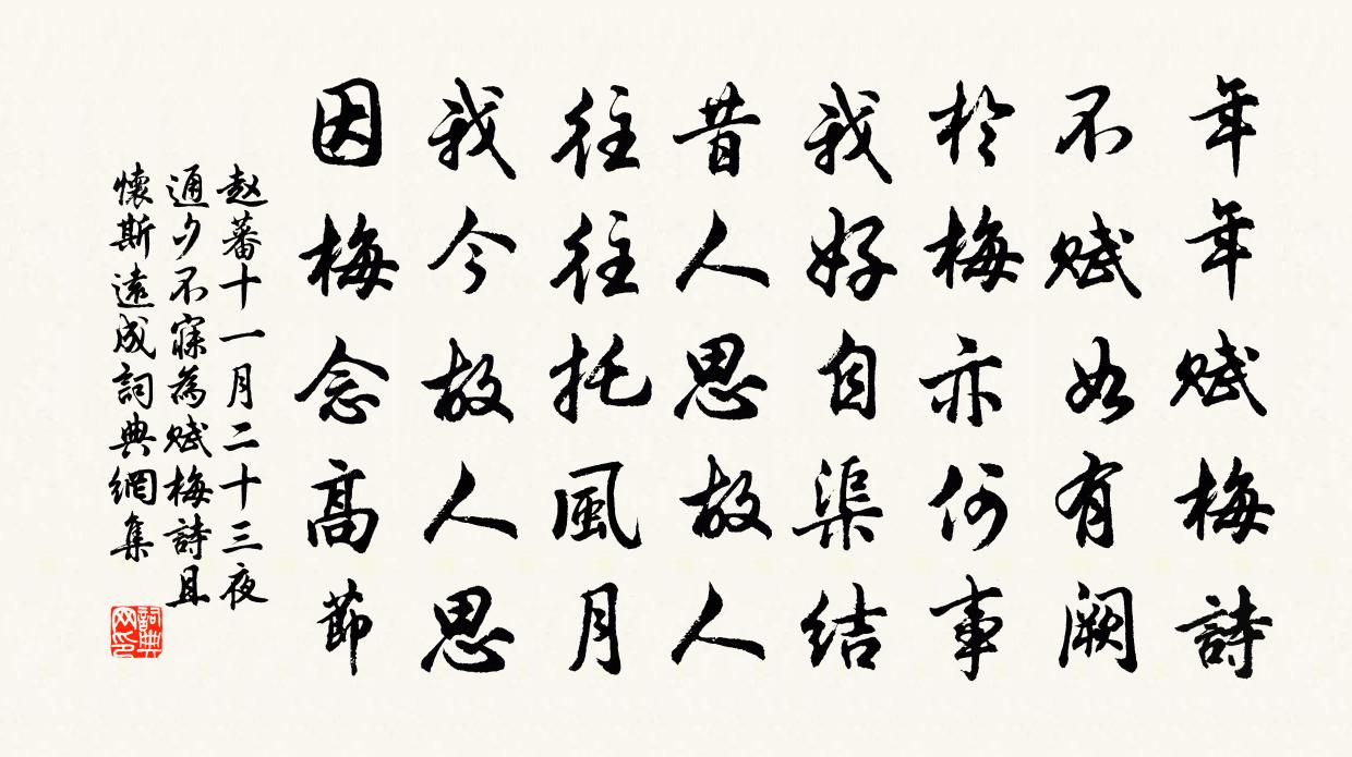詩詞名句歷史字典書法欣賞書法字典國語詞典說文解字康熙字典古漢語字典標 題 作 者 詩 句 十一月二十三夜通夕不寐為賦梅詩且懷斯遠成作者:趙蕃 朝代:宋代原文年年賦梅詩,不賦如有闕。於梅亦何事,我好自渠結。昔人思故人,往往托風月。我今故人思,因梅念高節。詩詞問答問:《十一月二十三夜通夕不寐為賦梅詩且懷斯遠成》的作者是誰?答:趙蕃問:該詩寫於哪個朝代?答:宋代書法欣賞十一月二十三夜通夕不寐為賦梅詩且懷斯遠成書法作品詩文賞析【原題】:十一月二十三夜通夕不寐為賦梅詩且懷斯遠成父友弟及五首而曉書呈在伯詩詞推薦後三日再賦陳與義〔宋代〕天生癭木不須栽,說與兒童是酒杯。落日留霞知我醉,長風吹月送詩來。一官擾擾身增病,萬事悠悠首獨回。不奈謁金門孫光憲〔唐代〕留不得!留得也應無益。白綢春衫如雪色。揚州初去日。輕別離,甘拋擲,江上滿帆風疾。卻羨彩鴛三十六,孤鸞詠懷阮籍〔魏晉〕湛湛長江水,上有楓樹林。皋蘭被徑路,青驪逝駸駸。遠望令人悲,春氣感我心。三楚多秀士,朝雲進荒淫。朱華白水橋斷碑張祁〔宋代〕出郭悠悠信馬蹄,荒煙衰草不勝悲。江南舊事無人記,時有龜趺載斷碑。留別友人書齋喻坦之〔唐代〕相見不相睽,一留日已西。軒涼庭木大,巷僻鳥巢低。背俗修琴譜,思家話藥畦。卜鄰期太華,同上上方梯。【雙調】折桂今張可久〔元代〕小金山拂闌乾仙袂飄飄,堂占波心,纜解松腰。露滿螺杯,風香翠袖,月冷鸞簫。比江上金山小小,望天邊銀海迢游天竺釋紹嵩〔宋代〕天竺秋重入,翛然適此心。路尋流水遠,門閉野雲深。澹濘生真趣,幽閒且自任。殘陽應更好,蟬合伴清吟。暮春泛西湖次口號韻呈程待制十首陳造〔宋代〕湖山引興尚能長,小貸詩愁放酒狂。蝴蝶應憐落春後,無聊時近綠樽傍。朴上人訪筠翁於溪草堂袖詩贈雨中告別將有雁李彌遜〔宋代〕一壑悠然聽雨眠,君來著語破雲煙。肯隨鷗狎清江上,欲趁鴻飛白日邊。童子不應我一指,學人正自少三拳。急行詠余雪詩沈約〔南北朝〕陰庭覆素芷。南階褰綠葹。玉台新落構。青山已半虧。聞曾幼度近況於陳擇之作二詩覓使寄之趙蕃〔宋代〕夜醉江天閣,賦詩殊未央。自茲悲契闊,誰復慰淒涼。有抱何由寫,因詩得寄將。丁寧贛江水,莫憚溯流長。憶天台山劉昭禹〔唐代〕常記游靈境,道人情不低。岩房容偃息,天路許相攜。霞散曙峰外,虹生涼瀑西。何當塵役了,重去聽猿啼。讀蘇武傅劉宰〔宋代〕李陵衛律兩降人,大義相規幾盡誠。陵語不傅傅衛律,要令千載識交情。念奴嬌·炎精中否黃中輔〔宋代〕炎精中否?嘆人材委靡,都無英物。胡馬長驅三犯闕,誰作長城堅壁?萬國奔騰,兩宮幽陷,此恨何時雪?草廬三次宣州太守韻林宗放〔宋代〕雙旌迎曉指林廬,五馬逢辰政得輿。西掖舊裁天子詔,名山今睹帝王書。胸中霽朋何明甚,筆底清風更穆如。袞職泛湖有作強至〔宋代〕不比危湍急瀨船,平湖慢槳恰相便。蓬飄萍泛真吾事,舞袖歌鬟付少年。郊廟歌辭。武后大享拜洛樂章。顯和(受圖)武則天〔唐代〕顧德有慚虛菲,明祇屢降禎符。汜水初呈秘象,溫洛薦表昌圖。玄澤流恩載洽,丹襟荷渥增愉。贈輕車崔顥〔唐代〕悠悠遠行歸,經春涉長道。幽冀桑始青,洛陽蠶欲老。憶昨戎馬地,別時心草草。烽火從北來,邊城閉常早。平生倪文舉寺簿輓詩三首曾協〔宋代〕盛德逾人遠,高談造理深。保身元有道,應世了無心。別日更寒暑,交情隔古今。紙窗風雪夜,猶記掉頭吟。縣署叢竹梅堯臣〔宋代〕裊裊幽亭竹,團團自結叢。寒生綠樽上,影入翠屏中。陶柳應慚弱,潘花只競紅。方持雪霜操,不敢倚春風。名句推薦長江春水綠堪染,蓮葉出水大如錢。張籍《春別曲》 光陰荏苒,日月如梭。施耐庵《水滸傳·第六十二回》 此身行作稽山土,猶吊遺蹤一泫然。陸游《沈園二首》 詩言志,歌永言,聲依永,律和聲。佚名《尚書·虞書·舜典》 任憑弱水三千,我只取一瓢飲。曹雪芹《紅樓夢·第九十一回》 我也不登天子船,我也不上長安眠。唐寅《把酒對月歌》 窮巷多怪,曲學多辯。商鞅《商君書·更法》 琴書倦,鷓鴣喚起南窗睡。謝逸《千秋歲·詠夏景》 如絲苣甲飣春盤,韭葉金黃雪未乾。張耒《春日·如絲苣甲飣春盤》 曉雞驚樹雪,寒鶩守冰池。李商隱《幽居冬暮》