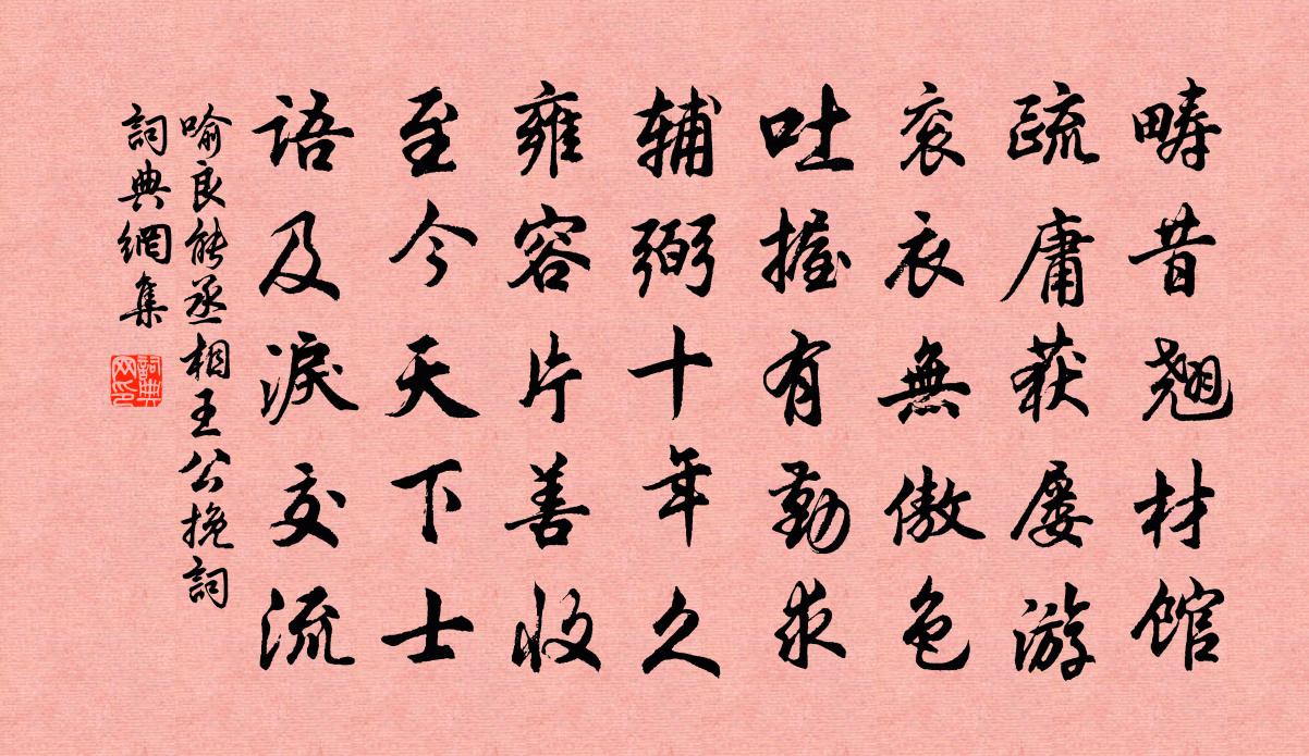 詩詞名句歷史字典書法欣賞書法字典國語詞典說文解字康熙字典古漢語字典標 題 作 者 詩 句 丞相王公輓詞作者:喻良能 朝代:宋代丞相王公輓詞原文疇昔翹材館,疏庸獲屢游。袞衣無傲色,吐握有勤求。輔弼十年久,雍容片善收。至今天下士,語及淚交流。詩詞問答問:丞相王公輓詞的作者是誰?答:喻良能問:丞相王公輓詞寫於哪個朝代?答:宋代喻良能丞相王公輓詞書法欣賞丞相王公輓詞書法作品詩詞推薦句周文璞〔宋代〕戲賡和靖句。送懶散先生東歸晁說之〔宋代〕先生身乾若浮查,舌響霜鍾激水車。平生樂逐胡雁起,倏游吳會忽京華。公卿到門問窮達,未易可置吾齒牙。今我佛光炤公首依於梁渚今往下竺參北峰印禪師二釋文禮〔宋代〕揀境分明妙藥方,餘之分別更須忘。晚風吹落殘紅片,休向枝頭覓舊香。失調名蘇軾〔宋代〕高安更過幾重山。頌古十首釋端裕〔宋代〕劫火洞然俱敗壞, * 愈光輝。王孫醉寢迷春夢,不覺鶯啼柳絮飛。天津感事二十六首邵雍〔宋代〕隋唐而下貴公卿,近世風波走利名。借問天津橋下水,當時湍急作何聲。送顏復兼寄王鞏蘇軾〔宋代〕彭城官居冷如水,誰從我游顏氏子。我衰且病君亦窮,衰窮相守正其理。胡為一朝舍我去,輕衫觸熱行千里。問君送夏肯父赴補杜范〔宋代〕之子問行李,策足游上都。晚風吹客袂,話別聊躊躇。朝家渴多士,璧水來英儒。子志橫四海,亦復隨群趨。磨礪寄楊六(楊攝萬年縣尉,余為贊善大夫)白居易〔唐代〕青宮官冷靜,赤縣事繁劇。一閒復一忙,動作經時隔。清觴久廢酌,白日頓虛擲。念此忽踟躕,悄然心不適。豈無示徒三戒釋原妙〔宋代〕舉足動步,無益於人,戒之莫行。讀文君白頭吟蕭澥〔宋代〕不雇此身輕夜馳,晚年吟苦亦奚為。從來簪折瓶沈事,已在雙鬟暗合時。至啟至數日前久疏投刺略遂登門方媿非才過叨李至〔宋代〕相留不稱主人心,多病虛勞酒滿斟。廳事便臨芳草逕,庖廚只就綠槐陰。玫瑰出檻參差拆,薜荔依牆積漸深。卻恨尚書省受誓誡貽太廟裴丞儲光羲〔唐代〕皇家有恆憲,齋祭崇明祀。嚴車伊洛間,受誓文昌里。沉沉雲閣見,稍稍城烏起。曙色照衣冠,虛庭鳴劍履。裴回寄題朱元晦武夷精舍十二仁智堂楊萬里〔宋代〕學子可憐生,遠來參老子。仁智若為談,指似秋山水。登高臨大江方回〔宋代〕客思忽不樂,登高臨大江。風湍睇遙席,雲岫思幽窗。淮蔞昔未茁,廬瀑今已淙。我本休官人,曷為棲是邦。中腸偈傾一百三十三首釋法薰〔宋代〕南斗七,北斗八。風來樹動,魚行水濁。諸人三十年後眼開,莫道南山有口無舌。韓宗彥寺丞通判鄧州梅堯臣〔宋代〕往歲陪祠泰壇下,始一相見如相知。我今入幙君有待,喜得款語勝前時。便嗟陳事日侵汨,雖欲數面曾無期。忽聞春日絕句陸游〔宋代〕吏來屢敗喔詩興,雨作常妨載酒行。忽見家家插楊柳,始知今日是清明。句周必正〔宋代〕摛雲搖碧露繁星。和劉後村梅花百詠方蒙仲〔宋代〕少陵前僅陸君時,騷里居多摭茝蘺。未必梅花非有待,不妨敲琢古人遺。名句推薦歌鐘不盡意,白日落昆明。李白《經亂離後天恩流夜郎憶舊遊書懷贈江夏韋太守良宰》 春至花如錦,夏近葉成帷。李爽《芳樹》 不剪春衫愁意態。過收燈、有些寒在。史達祖《夜行船·正月十八日聞賣杏花有感》 今年元夜時,月與燈依舊。歐陽修《生查子·元夕》 離宮絕曠,身體摧藏,志念沒沉,不得頡頏。王昭君《怨詞》 群芳爛不收,東風落如糝歐陽修《春日西湖寄謝法曹歌》 故園腸斷處,日夜柳條新。宋之問《途中寒食題黃梅臨江驛寄崔融》 江山如有待,花柳自無私。杜甫《後游》 天地無全功,聖人無全能,萬物無全用。故天職生覆,地職形載,聖職教化,物職所宜。列子及其弟子《列子·天瑞》 殘酒憶荊高,燕趙悲歌事未消。陳維崧《南鄉子·邢州道上作》