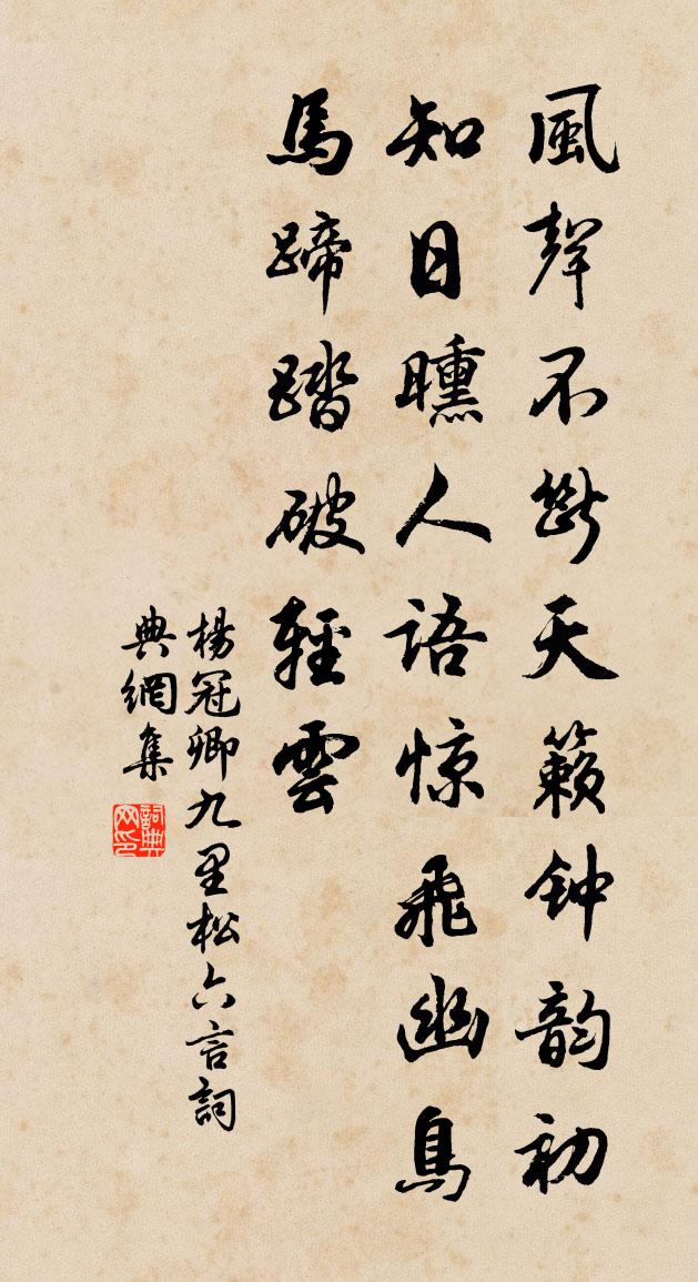 詩詞名句歷史字典書法欣賞書法字典國語詞典說文解字康熙字典古漢語字典標 題 作 者 詩 句 九里松六言作者:楊冠卿 朝代:宋代九里松六言原文風聲不斷天籟,鍾韻初知日曛。人語驚飛幽鳥,馬蹄踏破輕雲。詩詞問答問:九里松六言的作者是誰?答:楊冠卿問:九里松六言寫於哪個朝代?答:宋代楊冠卿九里松六言書法欣賞九里松六言書法作品詩詞推薦紹熙四年加上壽聖皇太后尊號八首佚名〔宋代〕熙肅琨庭,載升金記。迺導迺陪,威儕濟濟。天步繼臨,孝誠行矣。聲容也昭,中外悅喜。吾兄文夫宦遊天台余將官於江左不勝感離之情王淹〔宋代〕送君南浦上,風煙慘前知。當時長江水,已與滄溟期。海經遠山外,人在高樓時。潮來君莫忘,中有清淚滋。次韻趙表之道中見梅之作二首李彌遜〔宋代〕近水疏籬竹半侵,枝南枝北弄晴陰。不因老眼分明見,辜負凌寒一寸心。使南海道長沙,題道林嶽麓寺唐扶〔唐代〕道林嶽麓仲與昆,卓犖請從先後論。松根踏雲二千步,始見大屋開三門。泉清或戲蛟龍窟,殿豁數盡高帆掀。即今夏雲峰佚名〔宋代〕瓊結苞,酥凝蕊,粉心輕點胭脂。疑是素娥妝罷,玉翠低垂。化工深意,巧付與、別個標儀。怎奈向,風寒景里,會獨木和尚釋雲岫〔宋代〕坐致太平元是我,埋兵挑戰卻輸君。鐵浮圖下曾相見,燈盞花開五夜春。賢者之孝二百四十首霍去病林同〔宋代〕不早知此體,元來托大人。低頭拜縣吏,誰擬霍將軍。已亥雜詩 81龔自珍〔清代〕歷劫如何報佛恩,塵塵文字以為門。遙知法會靈山在,八部天龍禮我言。和晁美叔蘇軾〔宋代〕反觀皆自直,相詆竟誰諛。事過始堪笑,夢中今了無。珍材尚空谷,疲馬正長途。未識造化意,茫然同一爐。初夏已晚山即事張嵲〔宋代〕山雲倏忽自晴陰,積雨門楥蔓草侵。一帶清川供極目,千重濁嶂伴微吟。雄鳩鳴處園林密,白鳥飛來溝水深。麥秀偈二首釋慧南〔宋代〕得不得,傅不得,歸根得旨復何言。憶得首山曾漏泄,新婦騎驢阿家牽。次韻和永叔雨中寄原甫舍人梅堯臣〔宋代〕賴得春巢燕未歸,高檐終日雨衰衰。細籠芳草踏青後,欲打梨花寒食時。美景已嗟空過盡,名園猶許悞相隨。錦鞍皇帝閣端午帖子詞宋庠〔宋代〕吹律蕤賓動,乘離玉燭明。薦盤荊俗黍,頒餌漢祠羹。頌古四十五首釋如珙〔宋代〕心燈不可付,祖印亦難傳。野鴨飛過去,搊得鼻頭穿。送和斜川詩二首王銍〔宋代〕兩腳垂天際,愁雲慘不休。尋幽抱奇癖,欲繼斜川游。中原苦兵革,誰能障倒流。野老且吞聲,蹤跡逐閒鷗。策杖孟門行崔顥〔唐代〕黃雀銜黃花,翩翩傍檐隙。本擬報君恩,如何反彈射。金罍美酒滿座春,平原愛才多眾賓。滿堂儘是忠義士,何意朱槿花薛濤〔唐代〕紅開露臉誤文君,司蒡芙蓉草綠雲。造化大都排比巧,衣裳色澤總薰薰。步虛蕊珠七言程公許〔宋代〕玄蓋之天高崒嵂,自滿天眼支一脈。嶙剛四面森翠壁,中有瑤柱倚天立。窈窈鬱郁仙者宅,涵雲蓄霧九鎖隔。石扉寧宗皇帝輓詩二首洪咨夔〔宋代〕虛已堯黃屋,清心漢弋綈。乾符開太一,坤軫拓全齊。鎮國天球在,賓空寶仗迷。歷年施澤久,四海哭遺黎。端師子贊釋紹曇〔宋代〕爪牙雖弄未全真,駁綠斑釐著一身。彩好不曾哮吼得,聽聞將謂嚇村人。名句推薦國無常強,無常弱。奉法者強,則國強;奉法者弱,則國弱。韓非及後人《韓非子·有度》 女慕貞潔,男效才良。周興嗣《千字文·全文》 劉郎已恨蓬山遠,更隔蓬山一萬重!李商隱《無題·來是空言去絕蹤》 薄衾小枕涼天氣,乍覺別離滋味。柳永《憶帝京·薄衾小枕涼天氣》 跨馬出郊時極目,不堪人事日蕭條杜甫《野望》 白雲一片去悠悠,青楓浦上不勝愁。張若虛《春江花月夜》 君家玉女從小見,聞道如今畫不成。黃庭堅《謝張仲謀端午送巧作》 花不語,水空流。年年拚得為花愁。晏幾道《鷓鴣天·守得蓮開結伴遊》 斑竹枝,斑竹枝,淚痕點點寄相思。劉禹錫《瀟湘神·斑竹枝》 明犯強漢者,雖遠必誅。班固《漢書·傳·傅常鄭甘陳段傳》