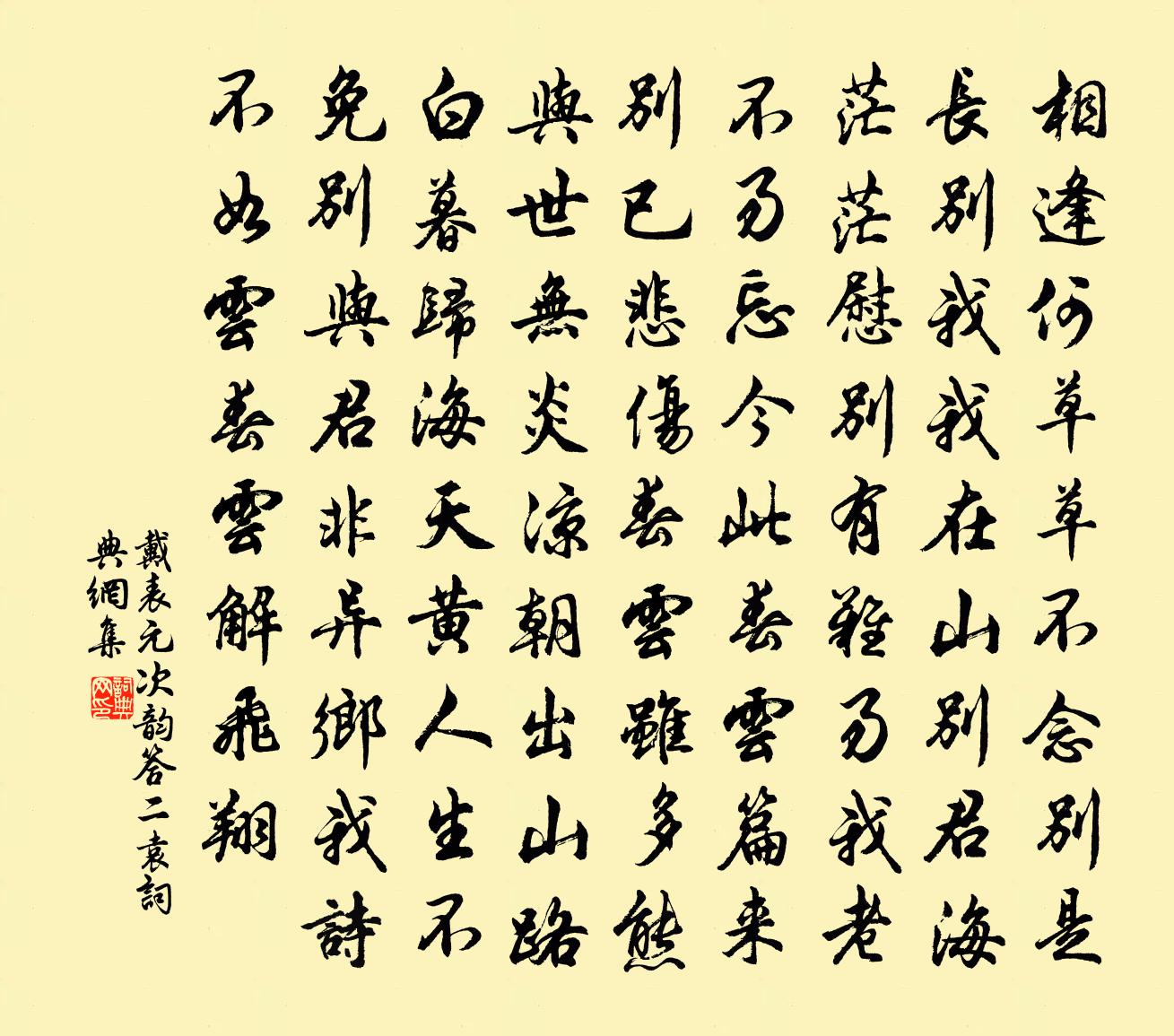 詩詞名句歷史字典書法欣賞書法字典國語詞典說文解字康熙字典古漢語字典標 題 作 者 詩 句 次韻答二袁作者:戴表元 朝代:宋代次韻答二袁原文相逢何草草,不念別是長。別我我在山,別君海茫茫。慰別有難易,我老不易忘。今此春雲篇,來別已悲傷。春雲雖多熊,與世無炎涼。朝出山路白,暮歸海天黃。人生不免別,與君非異鄉。我詩不如雲,春雲解飛翔。詩詞問答問:次韻答二袁的作者是誰?答:戴表元問:次韻答二袁寫於哪個朝代?答:宋代戴表元次韻答二袁書法欣賞次韻答二袁書法作品詩詞推薦示逸二首趙蕃〔宋代〕菊種初猶落,及今當梢滋。晴多須灌溉,草蔓合耘治。夏欲助茗椀,秋當浮酒卮。落英如可拾,更得慰長飢。本農張詠〔宋代〕奢競苦不息,生民只有冤。誰搜元化窟,鑿斷麗華根。使絕侵奪苦,著為明聖恩。何煩重師古,即此是羲軒。書懷寄郭正宋祁〔宋代〕僑籍依三輔,愁顛遍二毛。星灰對遒盡,淚卷掩劬勞。並歡絲兼路,都捐筆與刀。思旌初不定,離緒僅堪繰。醜是雨中寄東溪韋處士王建〔唐代〕雨中溪破無乾地,浸著床頭濕著書。一個月來山水隔,不知茅屋若為居。縱筆陸游〔宋代〕老眼輕千乘,枯腸卻八珍。直令身潦倒,未害膽輪囷。酒里遺浮世,書中見古人。平生笑園綺,老蹋帝城塵。日出堂上飲王安石〔宋代〕日出堂上飲,日西未雲休。主人笑而歌,客子嘆以愀。指此堂上柱,始生在岩幽。雨露飽所滋,凌雲亦千秋。所託和方機宜陳宓〔宋代〕絕頂樵翁總是仙,花紅草綠自年年。瓊樓玉宇成虛誕,盤石長松足醉眠。小竇偏能施雨澤,深崖常恐出雲煙。遊人送堵修遠歸湖城楊冠卿〔宋代〕雲臥江村煙樹林,懸知出岫本無心。亭臯若也有歸雁,得句不妨頻寄音。送關壽卿校書出守簡州范成大〔宋代〕東壁星宮館列仙,一麾苦欲近田園。宅家但寶千金鑒,臣輩何辭萬里船?京洛知心塵鞅里,江吳攜手暮帆邊。聲名冬日放言二十一首張耒〔宋代〕吾腹如鴟夷,但滿貯醇酒。外圓故不滯,中靜一無有。紛紛千百輩,納若一塵垢。下而至真源,保之故難朽。相和歌辭棹歌行駱賓王〔唐代〕寫月圖黃罷,凌波拾翠通。鏡花搖芰日,衣麝入荷風。葉密舟難盪,蓮疏浦易空。鳳媒羞自托,鴛翼恨難窮。秋帳宿樊溪張耒〔宋代〕黃州望樊山,秀色如可攬。扁舟橫江來,山腳系吾纜。大川失洶湧,淺水澄可鑑。北風吹疏雨,夜枕舟屢撼。齊安玉樓春錢惟演〔宋代〕錦籜參差朱欄曲。露濯文犀和粉綠。未容濃翠伴桃紅,幾許纖枝留鳳宿。嫩似春荑明似玉。一寸芳心誰管束。勸君句周林〔宋代〕殷紅片片點蒼苔。緣識宋太宗〔宋代〕玄元一氣不相監,清靜如存意馬銜。大隱居鄽迷小道,絕巔頂上白雲岩。歲晚言事寄鄉中親友方乾〔唐代〕急景蒼茫晝若昏,夜風乾峭觸前軒。寒威半入龍蛇窟,暖氣全歸草樹根。蠟燼凝來多碧焰,香醪滴處有冰痕。尺書錦堂春(中秋)詹玉〔宋代〕露掌秋深,花簽漏永,那堪比夕新睛。正纖塵飛盡,萬籟無聲。金鏡開奩弄影,玉壺盛水侵棱。縱簾斜樹隔,燭暗【商調】二朗神高明〔元代〕秋懷從別後,正七夕穿針在畫樓,暮雨過紗窗涼已透。夕陽影里,見一簇寒蟬衰柳。水綠香人自愁,況輕拆鸞交暗香(送杜景齋歸永嘉)張炎〔宋代〕猗蘭聲歇。抱孤琴思遠,幾番彈徹。洗耳無人,寂寂行歌古時月。一笑東風又急。黯消凝、恨聽啼鴂。想少陵、還還龜溪成拙句呈給事劉兄王洋〔宋代〕上春日暮暮春頭,翠淺芳濃草色柔。五十日天和暖候,一帆風地往來舟。棋神得雋驚逢敵,酒病尋醫尚入流。只有名句推薦重重疊疊上瑤台,幾度呼童掃不開。蘇軾《花影》 曉鏡但愁雲鬢改,夜吟應覺月光寒。李商隱《無題·相見時難別亦難》 瀑布風前千尺影,疑瀉銀河一派。朱栴《念奴嬌·雪霽夜月中登樓望賀蘭山作》 野曠天清無戰聲,四萬義軍同日死。杜甫《悲陳陶》 林表明霽色,城中增暮寒。祖詠《終南望余雪》 天南地北雙飛客,老翅幾回寒暑。元好問《摸魚兒·雁丘詞 / 邁陂塘》 篇之彪炳,章無疵也;章之明靡,句無玷也;句之清英,字不妄也。劉勰《文心雕龍·章句》 先到為君,後到為臣。佚名《增廣賢文·上集》 戒慎乎其所不睹,恐懼乎其所不聞。子思《禮記·中庸》 何期小會幽歡,變作離情別緒。柳永《晝夜樂·洞房記得初相遇》