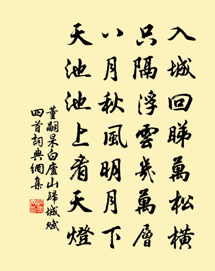 詩詞名句歷史字典書法欣賞書法字典國語詞典說文解字康熙字典古漢語字典標 題 作 者 詩 句 白廬山歸城賦四首作者:董嗣杲 朝代:宋代白廬山歸城賦四首原文入城回睇萬松橫,只隔浮雲幾萬層。八月秋風明月下,天池池上看天燈。詩詞問答問:白廬山歸城賦四首的作者是誰?答:董嗣杲問:白廬山歸城賦四首寫於哪個朝代?答:宋代董嗣杲白廬山歸城賦四首書法欣賞白廬山歸城賦四首書法作品詩詞推薦詩陸機〔魏晉〕石龜尚懷海。我寧忘故鄉。題吹衣亭鄧肅〔宋代〕馬上衣衫涴塵土,斂板權門腰傴僂。冷風天上呼不來,厚顏如甲汗如雨。星郎高韻凌雲煙,天籟喚歸酌流泉。人間頌古三首釋從瑾〔宋代〕睦州擔板漢,從來見一邊。淺深三尺水,上下兩重天。題畫草蟲扇子蘇頌〔宋代〕蠉飛蠕動誠微物,尺素輕盈誰畫出。一朝君手將動搖,猶似吟風欲跳逸。竹梢草際弄輕翰,水墨淺深見纖質。昔人白雁黃庚〔宋代〕征鴻素縞過南樓,衣褐同群孰與儔。雲外排行分玉李,天邊印字帶銀鉤。高飛遠寒疑雲鶴,低落平沙類雲鷗。夜月次韻方秘正陳造〔宋代〕靜女無媒未易昏,幽人樂地但琴樽。詩聲況自推侯喜,牆仞懸知陋叔孫。拜手行申不敏謝,慕賢正黯索居魂。拘拘送徐漕李處權〔宋代〕都門雪罷看楊柳,濯濯風流已不群。千里澄清方有道,十年出處不忘君。新詩舊自開錦段,醉面向人生纈紋。我欲再和商卿孫應時〔宋代〕近識城南吳市仙,千岩活句得真專。令人向壁臥三日,悔我讀書空十年。樽酒細論還得否,風帆欲去獨依然。從今韓氏與閒即事葛紹體〔宋代〕堂深暑不到,閒意一爐香。棋斗過河急,琴彈流水長。古瓶疎牖下,怪石小池旁。忠獻畫圖在,英聲不可忘。次韻四首寄德基兼呈侍郎公李處權〔宋代〕書文車軌幾時同,諸道惟聞羽檄通。豈較北南聊暫寓,若論賢聖且時中。門前楊柳方垂雨,溪上桃花尚舞風。誰見和韻送逸軒劉民文天祥〔宋代〕少日屠龍事已勞,送人千里發江濤。蓬萊地近風方細,閶闔門開日正高。春里看花須款款,雨中剪韭且陶陶。金吾又贈劉潛歸陶丘石延年〔宋代〕春老有時回,人老不再少。草白有時榮,發白不再好。人生不如春,發生不如草。可堪送別春草前,青春未老人先哀二僧劉克莊〔宋代〕送迎懶更下禪床,撐拄猶堪坐道場。大眾□□□□病,小師忽報惠休亡。庵荒空復留遺偈,□□□□□厚藏。吾老金石台林夢英〔宋代〕雲作岩扉風自關,清陰半壑樹中間。傍廂更著茅亭好,放入西南一面山。崑山龔立道昱有月石硯屏斗南君玉諸人皆有詩孫應時〔宋代〕窗間明月鎮長在,此寶如今更有無。看取光輝生筆硯,可無文字繼歐蘇。雨杜甫〔唐代〕行雲遞崇高,飛雨靄而至。潺潺石間溜,汩汩松上駛。亢陽乘秋熱,百穀皆已棄。皇天德澤降,焦卷有生意。前雨次韻葉希虞秘校同游天竺寺五絕句蘇頌〔宋代〕山半僧軒四面開,下看城市一浮埃。此間真趣誰能辨,飛鳥空中自往來。秋懷三十六首邵雍〔宋代〕淡煙羃疏林,輕風裊寒雨。日暮人已歸,群雞猶啄黍。此心固不動,此事極難處。一言以蔽之,尚恐費言語。舟中晚起白居易〔唐代〕日高猶掩水窗眠,枕簟清涼八月天。泊處或依沽酒店,宿時多伴釣魚船。退身江海應無用,憂國朝廷自有賢。且向太師平章喬文惠公輓歌詞三首杜范〔宋代〕奕世諸賢輔,清朝得老成。諫兵秦蹇叔,憂國漢蕭生。更化人皆仰,調元位獨亨。天遲諸葛死,尚欲致昇平。名句推薦馬嘶人散後,秋風換、故園夢裡。吳文英《丁香結·夷則商秋日海棠》 重見金英人未見,相思一夜天涯遠晏幾道《蝶戀花· * 開時傷聚散》 秋風夜渡河,吹卻雁門桑。王昌齡《塞下曲·秋風夜渡河》 曲終漏盡嚴具陳,月沒星稀天下旦。佚名《雞鳴歌》 鄉書何處達?歸雁洛陽邊。王灣《次北固山下》 遠岫出山催薄暮,細風吹雨弄輕陰。李清照《浣溪沙·小院閒窗春色深》 行高者,名自高。人所重,非貌高。李毓秀《弟子規·泛愛眾》 親朋無一字,老病有孤舟。杜甫《登岳陽樓》 一壺濁酒喜相逢,古今多少事,都付笑談中。羅貫中《三國演義·第一回》 白頭燈影涼宵里,一局殘棋見六朝。錢謙益《金陵後觀棋絕句六首·選一》