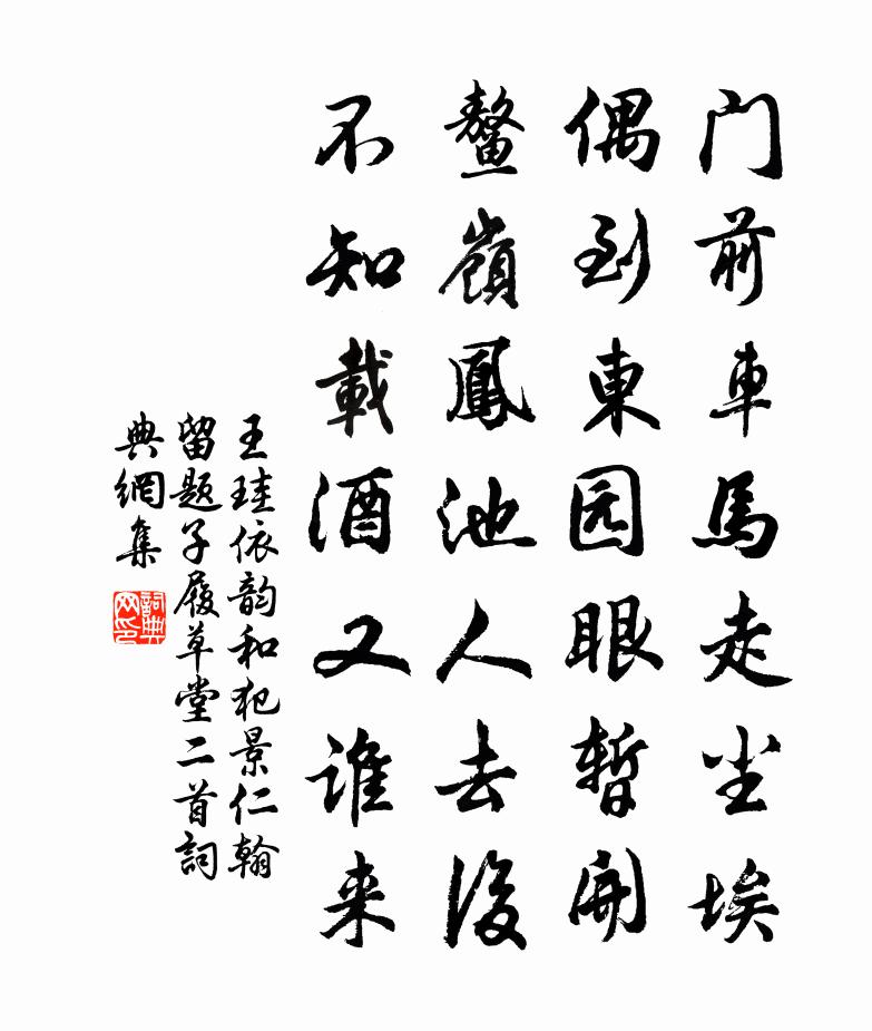 詩詞名句歷史字典書法欣賞書法字典國語詞典說文解字康熙字典古漢語字典標 題 作 者 詩 句 依韻和犯景仁翰留題子履草堂二首作者:王珪 朝代:唐代原文門前車馬走塵埃,偶到東園眼暫開。鰲嶺鳳池人去後,不知載酒又誰來。詩詞問答問:《依韻和犯景仁翰留題子履草堂二首》的作者是誰?答:王珪問:該詩寫於哪個朝代?答:唐代書法欣賞依韻和犯景仁翰留題子履草堂二首書法作品詩詞推薦元日次良翰韻黃公度〔宋代〕老去低徊強北游,春來訊息望南州。別離況復年華換,富貴難令少壯留。行李未知何處定,屠蘇還解憶人不。可堪贈郭翰二首織女〔唐代〕河漢雖雲闊,三秋尚有期。情人終已矣,良會更何時。朱閣臨清溪,瓊宮銜紫房。佳情期在此,只是斷人腸。病中上錢尚父羅隱〔唐代〕左腳方行右臂攣,每慚名跡污賓筵。縱饒吳土容衰病,爭奈燕台費料錢。藜杖已乾難更把,竹輿雖在不堪懸。深恩寧宗郊前朝獻景靈宮二十四首真宗〔宋代〕桂宮耽耽,藻們穆穆。天回兗彩,風韶璜玉。鹹英皦亮,容典炳煜。假我上靈,景命有僕。和安國送茶張栻〔宋代〕官焙蒼雲小臥龍,使君分餉自題封。打門驚起曲肱夢,公案從今又一重。九日(以下補遺)杜牧〔唐代〕金英繁亂拂闌香,明府辭官酒滿缸。還有玉樓輕薄女,笑他寒燕一雙雙。逸賢峒胡銓〔宋代〕好竹平生志頗堅,誰知島上有淇園。溪邊六逸李太白,林下七賢楊巨源。空翠有時穿犖确,圓機終日轉潺湲。從來愍嘆孫嵩〔宋代〕救地扶天力不支,猶為落落怪男兒。泥中龍逝江神駭,波際鯨枯海若悲。恨入煙雲連嘆縣,魂隨霜雪薄燕垂。可憐南充大兄嘗夢見予作詩見寄次韻和呈晁說之〔宋代〕仙山能夢我,書帙正思君。一德誰榮滯,群兒謾戚欣。過秦何必論,喻蜀卻須文。未落豐碑筆,唯貪辨惑勤。聽兒德胙讀書呈邱景實知一教授王邁〔宋代〕我被儒官誤,如今又教渠。但令識數字,不要讀多書。帝憚汲生戇,人嫌賈誼疏。君看朱紫貴,不害腹空虛。雜書幽居事陸游〔宋代〕抱瓮窮園叟,還山老布衣。死邊常得活,鬧處偶容歸。釣恐魚吞餌,棋憂客墮機。此心君會否?洗盡百年非。蘭亭四威儀釋普濟〔宋代〕住,晉朝古寺,無米無鹽無醋。歲歲遍乞諸鄰,三百六十餘度。送汪汝馮沿檄造朝曾協〔宋代〕春風扇微和,散入桃李場。枯卉受彼佛,處處生輝光。有客事行役,起柁凌官塘。浮家入煙浪,琴書粲成行。旁有次韻李參政龍鶴山廬魏了翁〔宋代〕莫使兒輩覺,從渠青紫紛。馬前金罷亞,鳥外玉奫淪。章解元輓詩虞儔〔宋代〕詩禮傳家舊,田園晚歲豐。月評猶未改,露挽遽成空。曲巷連桑蔭,幽岩長桂叢。南坡吾獨往,無復訪鄰翁。賀新郎劉鎮〔宋代〕翠葆搖新竹。正榴花、枝頭葉底,斗紅爭綠。誰在紗窗停針線,閒理竹西舊曲。又還是、蘭湯新浴。手弄合歡雙彩吏隱堂李伯玉〔宋代〕吏隱先尋一著高,盡輸酒聖與詩豪。君方無事同犀首,我縱有官如馬曹。把似啜茶看孟子,何如痛飲讀離騷。胸中七夕溫庭筠〔唐代〕鳴機札札停金梭,芙蓉澹蕩生池波。神軒紅粉陳香羅,鳳低蟬薄愁雙蛾。微光奕奕凌天河,鸞咽鶴唳飄颻歌。彎橋春寒六首陳造〔宋代〕清明寒食經旬是,笑問風寒更幾餘。小杏惜香春恰恰,新楊弄影午疏疏。息軒方岳〔宋代〕種田盡辦瓮頭春,倦矣風波謾損神。萬事不償雙短鬢,百年等是一微塵。祗今蝸戰誰知誤,凡我同盟人認真。夢亦名句推薦衰柳寒蟬一片愁,誰肯教白衣送酒?盧摯《沉醉東風·重九》 臨官莫如平,臨財莫如廉。劉向《說苑·政理》 秋蕭索。梧桐落盡西風惡。黃機《憶秦娥·秋蕭索》 恐是仙家好別離,故教迢遞作佳期。李商隱《辛未七夕》 存亡在虛實,不在於眾寡。韓非及後人《韓非子·安危》 江心雲帶蒲帆重,樓上風吹粉淚香。嚴仁《鷓鴣天·惜別》 以反求諸己為要法,以言人不善為至戒。胡宏《知言·文王》 欲知卻老延齡藥,百草摧時始起花。蘇軾《趙昌寒菊》 落紅不是無情物,化作春泥更護花。龔自珍《己亥雜詩·其五》 從前種種,譬如昨日死;從後種種,譬如今日生袁黃《了凡四訓·立命之學》
