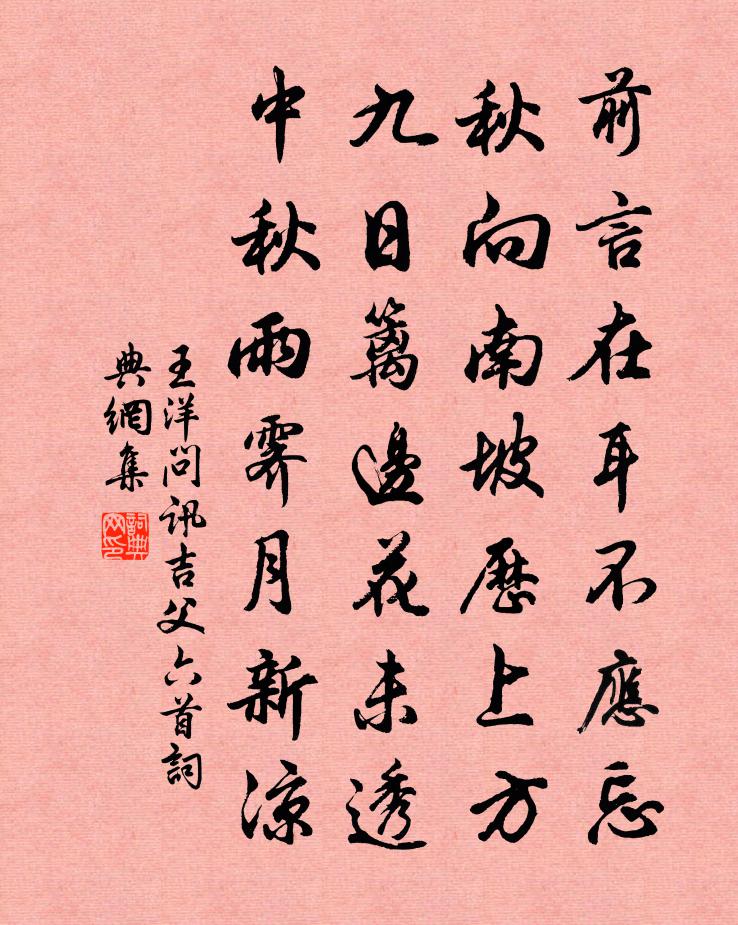 詩詞名句歷史字典書法欣賞書法字典國語詞典說文解字康熙字典古漢語字典標 題 作 者 詩 句 問訊吉父六首作者:王洋 朝代:宋代問訊吉父六首原文前言在耳不應忘,秋向南坡歷上方。九日籬邊花未透,中秋雨霽月新涼。詩詞問答問:問訊吉父六首的作者是誰?答:王洋問:問訊吉父六首寫於哪個朝代?答:宋代王洋問訊吉父六首書法欣賞問訊吉父六首書法作品詩詞推薦思家信不至姚勉〔宋代〕又得秋風入芰荷,尚無黃耳到如何。慈親想自精神健,嬌女應添智慧多。蹤跡自嗟成漫浪,利名底苦欲奔波。幾時贈遠顧況〔唐代〕暫出河邊思遠道,卻來窗下聽新鶯。故人一別幾時見,春草還從舊處生。頌古三十八首釋慧方〔宋代〕插鍬叉手異何同,要顯全機立大功。雖然有數通呈了,留得高傳振祖風。閣皁陶弼〔宋代〕萬仞天然皁閣形,陰陽不似眾山青。一區海上神仙宅,數曲人間水墨屏。華表鶴歸春谷響,玉京龍起夜潭腥。可憐金州行衙二首張嵲〔宋代〕寥寥空館風號木,浩浩長雲雪過窗。故國幾重輕靄外,歸心一夜滿寒江。河傳·柳拖金縷孫光憲〔五代〕柳拖金縷,著煙濃霧,濛濛落絮。鳳皇舟上楚女,妙舞,雷喧波上鼓。龍爭虎戰分中土,人無主,桃葉江南渡。襞紅線毯白居易〔唐代〕紅線毯,擇繭繅絲清水煮,揀絲練線紅藍染。染為紅線紅於藍,織作披香殿上毯。披香殿廣十丈余,紅線織成可殿九日宴集和徐通判韻晏殊〔宋代〕散插黃花兩佩萸,粉饘蓬餌酹觴初。清歌咽後雲生袂,妙舞翻時雪滿裾。上客采香逢木密,佳人投釣得王餘。秋光屬疾五首宋祁〔宋代〕天假支離養,人懷寂寞慚。衰容行得老,苦節遂無甘,飛鳥惟宜下,疲驢詎可驂。吾生知所守,嘲客勿多談。敘別唐彥謙〔唐代〕譙樓夜促蓮花漏,樹陰搖月蛟螭走。蟠拏對月吸深杯,月府清虛玉兔吼。翠盤擘脯胭脂香,碧碗敲冰分蔗漿。十載奉酬襲美先輩初夏見寄次韻陸龜蒙〔唐代〕積雨晦皋圃,門前煙水平。蘋蘅增遙吹,枕席分余清。村旆詫酒美,賒來滿鋞程。未必減宣子,何羨謝公榮。借宅長沙早春雪後臨湘水,呈同游諸子劉長卿〔唐代〕汀洲暖漸淥,煙景淡相和。舉目方如此,歸心豈奈何。日華浮野雪,春色染湘波。北渚生芳草,東風變舊柯。江山句李建中〔宋代〕晴山雲罨畫,孤嶼水含稜。紹興以後祀五方帝六十首佚名〔宋代〕[姑洗為羽]燁燁其光,炳炳其靈。窅其如容,剡其如聲。扇以景風,導以朱游。我德匪類,神其安留。送龍巖林主學劉克莊〔宋代〕官冷君行勿鄙夷,儒風未有盛斯時。進青衿子陳新義,為紫陽公廣舊規。然否聽人來議政,尊嚴無士敢嘲師。虀鹽醉蓬萊(壽史帥)黃機〔宋代〕政槐雲濃翠,榴火殷紅,暑風涼細。紫府神仙,向人間遊戲。瑞節珠幢,瓊纓寶佩,炯冰壺標緻。經濟規模,登庸山中曹松〔唐代〕此地似商嶺,雲霞空往還。衰條難定鳥,缺月易依山。野色耕不盡,溪容釣自閒。分因多臥退,百計少相關。和楊子聰會薰尉家梅堯臣〔宋代〕薰生方好雅,茲日為掃扉。森爾延嘉賓,歡然去塵機。有客振雙袂,敢言陽春暉。聊停玉麈尾,為歌金縷衣。古辭倚樓陸游〔宋代〕樓上憑闌小立時,淡煙漠漠雨絲絲。年光日日有佳處,不解春寒偏入詩。冰程珌〔宋代〕白日黃流漲渭城,三更風紫盡成冰。莫言此物渾無用,曾向滹沱滿漢兵。名句推薦我欲穿花尋路,直入白雲深處,浩氣展虹霓。黃庭堅《水調歌頭·遊覽》 生當作人傑,死亦為鬼雄。李清照《夏日絕句》 蕭條庭院,又斜風細雨,重門須閉。李清照《念奴嬌·春情》 雲里帝城雙鳳闕,雨中春樹萬人家。王維《奉和聖制從蓬萊向興慶閣道中留春雨中春望之作應制》 夢魂慣得無拘檢,又踏楊花過謝橋。晏幾道《鷓鴣天·小令尊前見玉簫》 曾苦傷春不忍聽,鳳城何處有花枝李商隱《流鶯》 日邊訊息空沈沈。畫眉樓上愁登臨。鄭文妻《憶秦娥·花深深》 人悄悄,簾外月朧明。岳飛《小重山·昨夜寒蛩不住鳴》 賴其力者生,不賴其力者不生。墨子《墨子·32章 非樂(上)》 道可道,非常道;名可名,非常名。劉安及其門客《淮南子·道應訓》