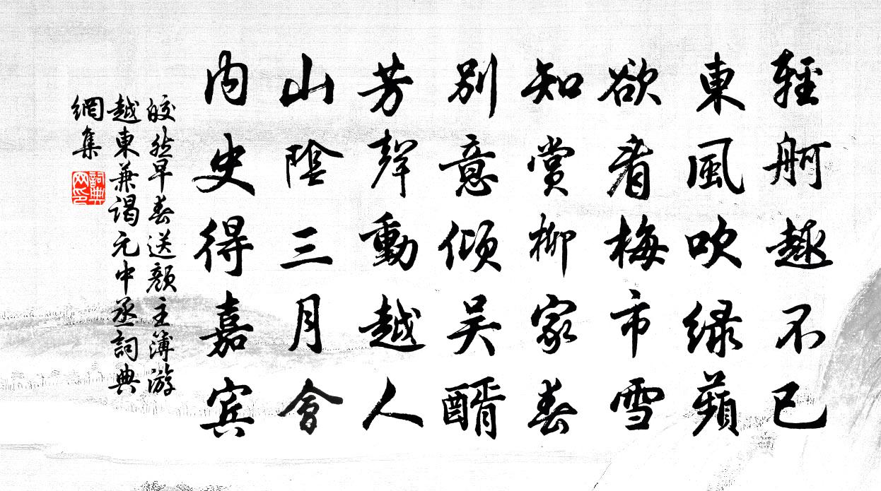 詩詞名句歷史字典書法欣賞書法字典國語詞典說文解字康熙字典古漢語字典標 題 作 者 詩 句 早春送顏主簿游越東,兼謁元中丞作者:皎然 朝代:唐代原文輕舸趣不已,東風吹綠蘋。欲看梅市雪,知賞柳家春。別意傾吳醑,芳聲動越人。山陰三月會,內史得嘉賓。詩詞問答問:《早春送顏主簿游越東,兼謁元中丞》的作者是誰?答:皎然問:該詩寫於哪個朝代?答:唐代書法欣賞早春送顏主簿游越東,兼謁元中丞書法作品注釋全唐詩:卷818-49詩詞推薦觀潮閣王奕〔宋代〕南岸客來過北岸,浙山盡處見閩山。清秋井邑棋枰里,落日汀洲畫軸間。糖多令/唐多令周密〔宋代〕絲雨織鶯梭。浮錢點細荷。燕風輕、庭宇正清和。苔面唾茸堆繡徑,春去也、奈春何。宮柳老青娥。題紅隔翠波。酬樂天待漏入閣見贈(時樂天為中書舍人予任翰林士)元稹〔唐代〕未勘銀台契,先排浴殿關。沃心因特召,承旨絕常班。颭閃才人袖,嘔鴉軟舉鐶。宮花低作帳,雲從積成山。密視大司成顏幾聖率同舍招游裴園,泛舟繞孤山賞楊萬里〔宋代〕船開便與世塵疏,飄若乘風度太虛。坐上偶然遺餅餌,波間無數出龜魚。黃叔敏許惠水梔子鄭會〔宋代〕八觚台子淨無塵,六尺屏風一欠伸。忽憶西家水梔子,多時愁殺讀騷人。頌古三十一首釋梵琮〔宋代〕乞兒無縷又無襤,餿飯殘羹勿處檐。拈起多年破蓆袋,人前更不懼羞慚。夜池元稹〔唐代〕荷葉團圓莖削削,綠萍面上紅衣落。滿池明月思啼螿,高屋無人風張幕。舟中徐似道〔宋代〕紅漆樓船黑占牌,漁翁一見便驚猜。生怕打官水交道,撐入蘆花喚不來。句王鎬〔宋代〕山色兩間供步障,松陰半畝當郵亭。憶淵明二首馮時行〔宋代〕五音不害道,其如哇淫何。聊以寫我心,素琴時按摩。澹泊有妙意,豈憂焚天和。賢哉等溟鴻,竟免嬰禍羅。端午詞御閣晏殊〔宋代〕獻壽競為長命縷,迎祥還佩赤靈符。端門漏永晨曦上,颯颯薰風繞帝梧。妙智洞陳堯叟〔宋代〕追憶經行三十年,漫山桃李競爭妍。於今棠棣花成萼,我已童 * 酒紅。念奴嬌佚名〔宋代〕萬里秋容浩蕩。題趙大年小景舒岳祥〔宋代〕三株五株依岸柳,一隻兩隻釣魚船。水天鵯鴨斜飛去,細草平沙興渺然。與山莊子仁侄東園看梅四首楊萬里〔宋代〕仰樹看花不見梅,聞香疑有別園開。更行數步偶回首,卻被青松映出來。歲暮陸游〔宋代〕歲暮風霜慘,村深草棘稠。力衰行每蹇,衣薄鼻多鼽。久矣當長往,悠然尚小留。兒童報炊熟,得飽且忘憂。褒城縣雨中張嵲〔宋代〕嶺雲方笠覆,檐雨已盆傾。山氣晝侵幔,灘聲夜入城。子真空舊隱,褒姒謾垂名。訪古多磨滅,秋風山樹赬。過蠡湖牟融〔唐代〕東湖煙水浩漫漫,湘浦秋聲入夜寒。風外暗香飄落粉,月中清影舞離鸞。多情袁尹頻移席,有道喬仙獨倚闌。幾度詠史詩石城胡曾〔唐代〕古郢雲開白雪樓,漢江還繞石城流。何人知道寥天月,曾向朱門送莫愁。句孟不疑〔唐代〕白日故鄉遠,青山佳句中。名句推薦學而時習之,不亦說乎?佚名《論語十則》 為惜故人去,復憐嘶馬愁。高適《送魏八》 十年磨一劍,霜刃未曾試。賈島《劍客 / 述劍》 夫死戰場子在腹,妾身雖存如晝燭。張籍《征婦怨》 能勝強敵者,先自勝者也。商鞅《商君書·畫策》 聖人不貴尺之壁,而重寸之陰劉安及其門客《淮南子·原道訓》 天與短因緣,聚散常容易。晏幾道《生查子·狂花頃刻香》 悠悠天宇曠,切切故鄉情。張九齡《西江夜行》 故音樂者,所以動盪血脈,通流精神而和正心也。司馬遷《史記·樂書》 今我來思,雨雪霏霏。佚名《採薇》
