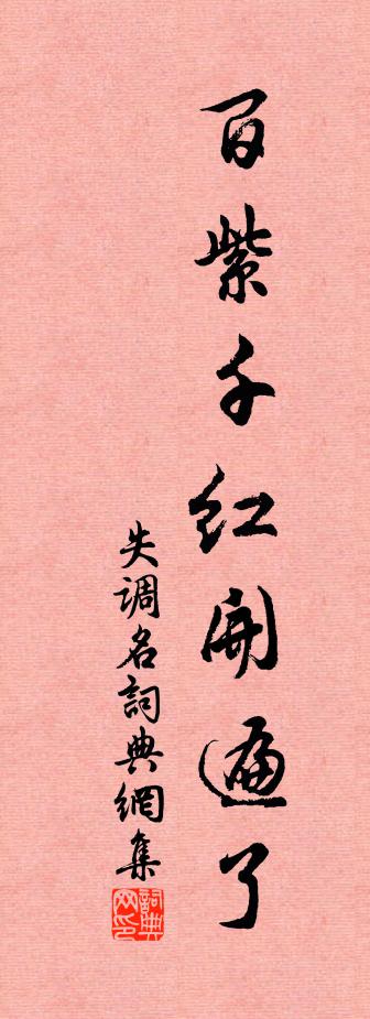 詩詞名句歷史字典書法欣賞書法字典國語詞典說文解字康熙字典古漢語字典標 題 作 者 詩 句 失調名作者:佚名 朝代:宋代失調名原文百紫千紅開遍了。詩詞問答問:失調名的作者是誰?答:佚名問:失調名寫於哪個朝代?答:宋代問:失調名是什麼體裁?答:詞問:佚名的名句有哪些?答:佚名名句大全佚名失調名書法欣賞失調名書法作品詩詞推薦送趙司馬赴蜀州宋之問〔唐代〕餞子西南望,煙綿劍道微。橋寒金雁落,林曙碧雞飛。職拜輿方遠,仙成履會歸。定知和氏璧,遙掩玉輪輝。即事十首劉克莊〔宋代〕香火萬家市,煙花二月時。居人空巷出,去寒海神祠。秋懷元好問〔金代〕涼葉蕭蕭散雨聲,虛堂淅淅掩霜清。黃華自與西風約,白髮先從遠客生。吟似候蟲秋更苦,夢和寒鵲夜頻驚。何時偈頌一百零二首釋紹曇〔宋代〕撞煙樓,不知羞。闢蟭螟眼,輥百花毬。四七二三阿轆轆,不思萬里有崖州。又和喜雨四首劉克莊〔宋代〕茅檐臥聽雨聲寒,晨起油雲遍海山。州牧憂勤真可記,田家苦樂最相關。親祈閟宇神其吐,誰道靈湫鬼所寰。但願贈李李堂石介〔宋代〕顓頊宅帝丘,放勛葬成陽。有虞漁雷澤,三帝聲汪洋。聖人遺風烈,生民多材良。吾宋八十年,賢傑近相望。黃州和叔粲滄浪亭鄭俠〔宋代〕高亭殖殖水冷冷,笑指鷗鳧坐晚汀。遠不聞聲千櫓去,矯如爭秀數峰青。煙雲窗牖紛紛雨,露月蒹葭點點星。最好潼關使院懷王七季友岑參〔唐代〕王生今才子,時輩鹹所仰。何當見顏色,終日勞夢想。驅車到關下,欲往阻河廣。滿日徒春華,思君罷心賞。開門送陳擇之張栻〔宋代〕君能千里來,乃作觸熱去。涼秋幸非遙,歸計無已遽。向來文字間,講論有平素。及茲共王事,益得君佳處。幾微奉和江沖陶居二十韻汪炎昶〔宋代〕青冥風露淒,玉笙浮縹緲。石蘚蝕秋花,羅月淡清曉。挽鄭令人二首劉克莊〔宋代〕乃翁自是里名儒,箴史遺言幼染濡。設饌禮如初作婦,貤封誼不忍先姑。色絲尤妙於前制,彤管從刪以後無。一事英宗皇帝輓詞五首王珪〔唐代〕一夜催仙杖,悲聲到九宸。玉階猶報曉,金殿不知春。碧海無來使,青宮有舊臣。華封曾未幸,應誤祝堯人。送陳侯之任同州王禹偁〔宋代〕丈夫貴自奮,何必恃貽謀。當年功不立,古人重為憂。太師忠順公,沒世有餘休。令子一何賢,恥隨資蔭流。碌碌感遇十二首·其一張九齡〔唐代〕蘭葉春葳蕤,桂花秋皎潔。欣欣此生意,自爾為佳節。誰知林棲者,聞風坐相悅。草木有本心,何求美人折。和黃漕雪中將至長沙張栻〔宋代〕吾道元如砥,人間謾畏途。未容舟泝峽,且泛雪平湖。子孝寧投杼,天回看脫弧。不應從我懶,欲老豆麻區。麗春杜甫〔唐代〕百草競春華,麗春應最勝。少須好顏色,多漫枝條剩。紛紛桃李枝,處處總能移。如何貴此重,卻怕有人知。和洪秀才八首胡寅〔宋代〕有煩推後覺,未克繼先猷。痼疾資醫緩,心專慕弈秋。遠遊方策足,參倚在凝眸。更仗磋磨力,時時警惰游。暑退姜特立〔宋代〕歸臣林間十二春,心安日日是良辰。家居佛界清涼國,人住仙宮自在身。無事入山尋阮客,有時擊壤助堯民。雖無青布道人李復〔宋代〕逸意閒雲野鶴孤,藥苗山葉綴衣裾。新蒸石卵將留飯,戲酌銅盤便得魚。療疾但分庵畔草,吐言不出世間書。五年琴操越裳操曹勛〔宋代〕彼雲雨兮,曾莫之私。黍稷繁蕪兮,草木其宜。田野不辟兮,其誰荒之。遠人之思兮,其誰來之。其勤其施,惟先名句推薦人之情多矯,世之俗多偽,豈可信乎?來俊臣《羅織經·閱人卷第一》 淥水淨素月,月明白鷺飛。李白《秋浦歌十七首》 漸老多憂百事忙,天寒日短更心傷。李覯《秋晚悲懷》 乍見翻疑夢,相悲各問年。司空曙《雲陽館與韓紳宿別》 性孤高似柏,阿嬌金屋。陸容《滿江紅·詠竹》 別有世間曾未見,一行一步一花新。吳承恩《西遊記·第三十八回》 無心非,名為錯。有心非,名為惡。李毓秀《弟子規·信》 秦中已久烏頭白,卻是君王未備知。李商隱《人慾》 玉爐香,紅蠟淚,偏照畫堂秋思。溫庭筠《更漏子·玉爐香》 右手畫圓,左手畫方,不能兩成。韓非及後人《韓非子·功名》
