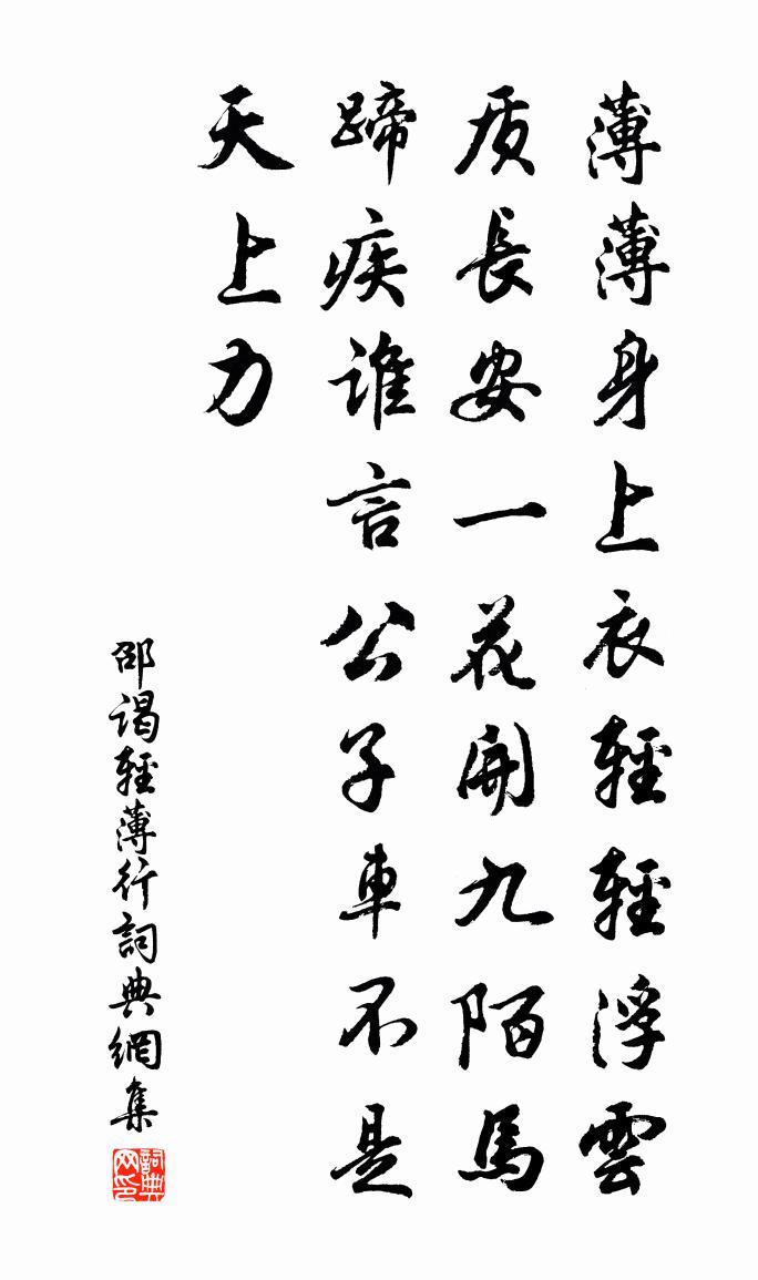 詩詞名句歷史字典書法欣賞書法字典國語詞典說文解字康熙字典古漢語字典標 題 作 者 詩 句 輕薄行作者:邵謁 朝代:唐代輕薄行原文薄薄身上衣,輕輕浮雲質。長安一花開,九陌馬蹄疾。誰言公子車,不是天上力。詩詞問答問:輕薄行的作者是誰?答:邵謁問:輕薄行寫於哪個朝代?答:唐代問:輕薄行是什麼體裁?答:樂府邵謁輕薄行書法欣賞輕薄行書法作品注釋全唐詩:卷605-23詩詞推薦巫山一段雲 遠浦歸帆李齊賢〔元代〕南浦寒潮急,西岑落日催。雲帆片片趁風開。遠映碧山來。出沒輕鷗舞,奔騰陣馬回。船頭浪吐雪花堆。晝鼓殷春偈釋守芝〔宋代〕翠岩路嶮巇,舉步涉千溪。更有洪源水,滔滔在嶺西。溪上孫岩〔宋代〕溪翁生計獨熙然,新買南鄰舴艋船。日載鸕鶿三十尾,魚為租入水為田。為章道祖頗及葛藤滄浪亭葛立方〔宋代〕滄浪亭下水連溪,影倒虛檐鳳翅齊。白小牽風動晨鏡,碧圓著雨響秋鼙。魚舟點點依苹渚,雁齒依依跨柳堤。舊日送汪以南教授方回〔宋代〕郡文學掾未宜卑,四七元勛所願為。歸興忽如憶鱸膾,閒心肯復戀皋比。鄭虔粱肉非無分,薛令桑榆竟自奇。想見淨明戴復古〔宋代〕林巒相掩映,岩谷獨玲瓏。下置維摩室,上通龍伯宮。靈珠四時雨,秋水一簾風。甚欲觀新月,山高腳力窮。柳梢青(釣台。紹興甲子赴試南宮登此,今三十三年矣)袁去華〔宋代〕一水縈迴。參天古木,夾岸蒼崖。三十三年,客星堂上,幾度曾來。眼看變化雲雷。分白首、煙波放懷。細細平章入華子崗是麻源第三谷五言謝靈運〔南北朝〕南州實炎德,桂樹凌寒山。銅陵映碧潤,石磴瀉紅泉。既枉隱淪客,亦棲肥遯賢。險徑無測度,天路非術阡。遂登閱古樓乾隆〔清代〕寶笈三希萃法珍,好公天下壽貞珉。樓飛四面開屏障,神聚千秋作主賓。不雜嬴劉夸博廣,略存魏晉要精真。遊絲天台福聖觀張無夢〔宋代〕天台瀑布落青天,觀在天台瀑布邊。道士只今燒藥處,仙翁曾是種芝田。龍居古洞遺殘雨,鶴出高巢點破煙。暫別紫參歌錢起〔唐代〕遠公林下滿青苔, * 偏宜間石開。往往幽人尋水見,時時仙蝶隔雲來。陰陽雕刻花如鳥,對鳳連雞一何小。春風不出門白居易〔唐代〕不出門來又數旬,將何銷日與誰親。鶴籠開處見君子,書卷展時逢古人。自靜其心延壽命,無求於物長精神。能行奉和聖制經孔子舊宅張九齡〔唐代〕孔門太山下,不見登封時。徒有先王法,今為明主思。恩加萬乘幸,禮致一牢祠。舊宅千年外,光華空在茲。春野五首宋庠〔宋代〕夕藹收芳甸,春蒿偏宿荄。朝虹先雨出,寒雁後陽來。遠木芊芊茂,幽花脈脈開。欣逢老農語,爭席坐林隈。黃瓜乾隆〔清代〕菜盤佳品最燕京,二月嘗新豈定評。壓架綴籬偏有致,田家風景繪真情。與青原正庵老劉過〔宋代〕倦行老矣偏東南,最後青原識正庵。無法更求身外說。有祥應向意中參。春風繞寺雨花墜,石鼎烹花泉味甘。暫癰詠門龍昌期〔宋代〕樞動本為榮辱主,常因戶外細推尋。乾坤出入無窮象,夷鍬關防有限心。揜到善人非遠大,開當古道自高深。九成和太守虞儔〔宋代〕豈弟循良守,功成意益謙。尋求七字律,想見一生廉。活火烹茶蕊,消愁媚酒帘。南樓月華好,吹笛指須纖。清平樂 此篇促游山劉敏中〔元代〕今晨過望。盡得山形狀。石險路危心欲盪。手撥白雲又上。半空仰見仙庵。山靈許我高探。倦處旋傾春酒,不愁冒次韻五季夷時同宿蔣山韓元吉〔宋代〕亭亭石塔寶公龕,賸喜僧床得對談。坎壈詞場君亦滯,驅馳世路我何堪。軍書又見紛南北,敵勢由來說二三。淮岸名句推薦君子素其位而行,不願乎其外。子思《中庸·第十四章》 仁者見之謂之仁,知者見之謂之知佚名《易傳·繫辭傳上·第五章》 雲移雉尾開宮扇,日繞龍鱗識聖顏。杜甫《秋興八首》 莫飲卯時酒,昏昏醉到酉。佚名《增廣賢文·上集》 命室攜童弱,良日登遠遊陶淵明《酬劉柴桑》 獨上小摟春欲暮,愁望玉關芳草路。韋莊《木蘭花·獨上小樓春欲暮》 花明玉關雪,葉暖金窗煙。李白《折楊柳》 去日兒童皆長大,昔年親友半凋零。竇叔向《夏夜宿表兄話舊》 寄相思,寒雨燈窗,芙蓉舊院。吳文英《宴清都·秋感》 與君別,相思一夜梅花發房舜卿《有所思》