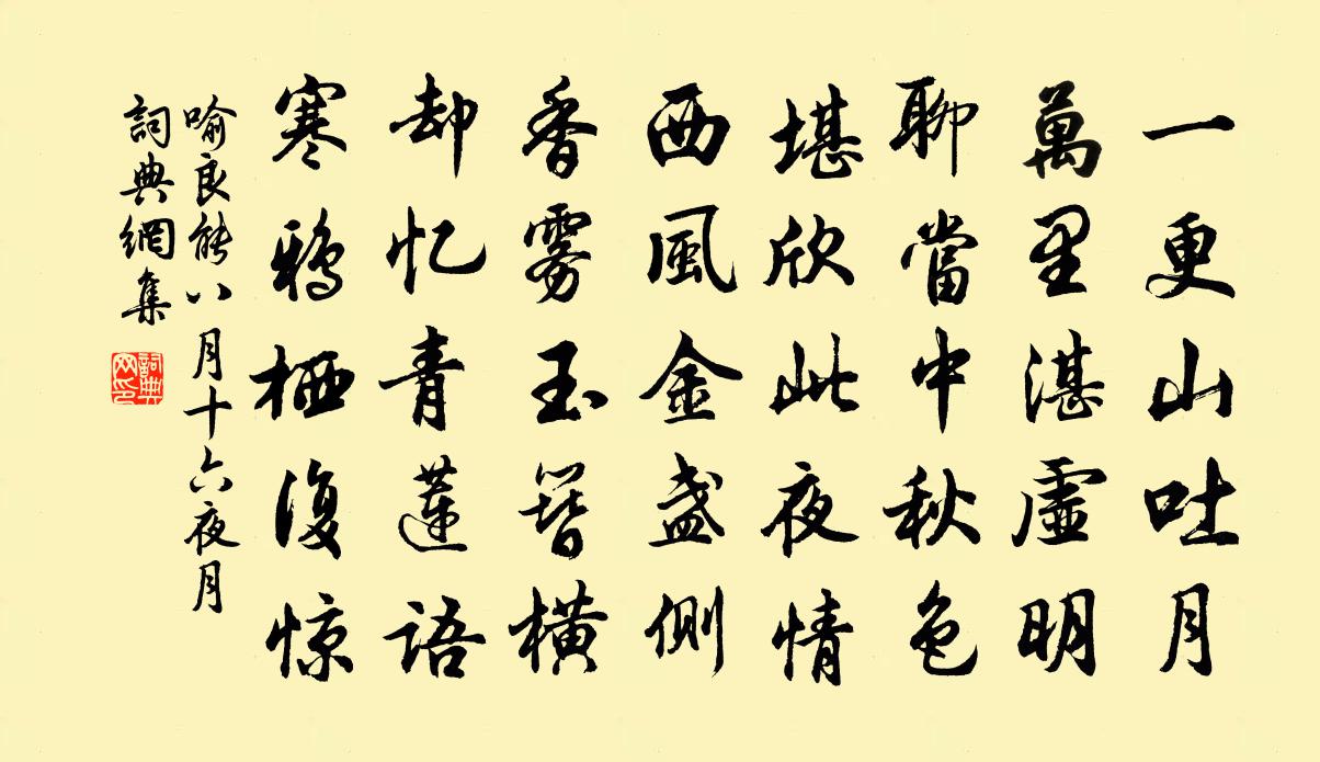 詩詞名句歷史字典書法欣賞書法字典國語詞典說文解字康熙字典古漢語字典標 題 作 者 詩 句 八月十六夜月作者:喻良能 朝代:宋代八月十六夜月原文一更山吐月,萬里湛虛明。聊當中秋色,堪欣此夜情。西風金盞側,香霧玉簪橫。卻憶青蓮語,寒鴉棲復驚。詩詞問答問:八月十六夜月的作者是誰?答:喻良能問:八月十六夜月寫於哪個朝代?答:宋代喻良能八月十六夜月書法欣賞八月十六夜月書法作品詩詞推薦答客宋祁〔宋代〕賤子空虛甚,何煩跪自陳。摧藏不鳴雁,排迮後來薪。櫛短三秋發,途奔四海塵。安能得所欲,況是數奇人。鷓鴣天 集句趙可〔元代〕十頃平波溢岸清。草香沙暖水雲晴。輕衫短帽垂楊里,楚潤相看別有情。揮彩筆,倒銀瓶。花枝照眼句還成。老來石鼓詩佚名〔先秦〕我車既攻。我馬既同。我車既好。我馬既(左馬右阜)。君子爰獵。爰獵爰游。麀鹿速速。君子之求。彎彎鹵弓。轅固劉克莊〔宋代〕非竇太皇崇老子,呵公孫子詫周公。漢廷可是無驍勇,刺彘須煩九十翁。宋頌九首六合雷聲石介〔宋代〕撫我則懷,並人肯來。降旗出城,並門夜開。並上既平,吾王休哉。送郭秀才顧況〔唐代〕故人曾任丹徒令,買得青山擬獨耕。不作草堂招遠客,卻將垂柳借啼鶯。挽吳公祥承事詩虞儔〔宋代〕故國衣冠後,傳家禮法尊。擊鮮更下舍,容駟閌高門。河潤金揮橐,風流酒滿樽。平生陰德事,五世眼中孫。出嶺題石灰鋪陶弼〔宋代〕馬度嚴關口,生歸喜復嗟。天文離捲舌,人影背含沙。江勢一雨曲,梅梢三四花。登高休問路,雲下是吾家。保叔塔楊蟠〔宋代〕寂寥千古事,今日有誰登。落日雲間合,空中露幾層。唐多令劉辰翁〔宋代〕日落紫霞洲。蘭舟穩放流。玉虹仙、如在黃樓。何必錦袍吹玉笛,聽欸乃、數聲秋。赤壁舞濤頭。周郎還到不。倚訪南湖晦崖講主釋智愚〔宋代〕講堂迷卻散花人,百萬茫茫徒苦辛。絕處逢生機路活,定應尊者是前身。閒坐白居易〔唐代〕婆娑放雞犬,嬉戲任兒童。閒坐槐陰下,開襟向晚風。漚麻池水裡,曬棗日陽中。人物何相稱,居然田舍翁。建除詩權德輿〔唐代〕建節出王都,雄雄大丈夫。除書加右職,騎吏擁前驅。滿月張繁弱,含霜耀鹿盧。平明躍騕褭,清夜擊珊瑚。定遠奉酬魯望惜春見寄皮日休〔唐代〕十五日中春日好,可憐沉痼冷如灰。以前雖被愁將去,向後須教醉領來。梅片盡飄輕粉靨,柳芽初吐爛金醅。病中西江月(十二首)張伯端〔宋代〕妄想不須強滅,真如何必希求。本源自性佛齊修。迷悟豈拘先後。悟則剎那成佛。迷則萬劫淪流。若能一念契真修示梅山寧老二首趙蕃〔宋代〕梅山不見梅夫子,宗派仍亡宗上人。梅句不刊宗有集,山應生喜亦生嗔。送會侍者開應庵塔銘釋鹹傑〔宋代〕三十餘年沙魘,一十五處脫空。欲彰從前家醜,何妨刻石流通。漢高帝試劍石薛紹彭〔宋代〕豐沛布衣吳芮客,回首鹹秦坐悽惻。漫隨霸楚西道遷,未甘漢地山河窄。隨身三尺青龍子,曾斷當塗素靈死。手提送桃岩成上人歸本寺嚴維〔唐代〕長老歸緣起,桃花憶舊岩。清晨雲抱石,深夜月籠杉。道具門人捧,齋糧谷鳥銜。餘生願依止,文字欲三緘。夾得胡仲芳詩次韻項安世〔宋代〕天遣清明作小寒,人從赤壁上青山。頗宜書更形骸外,賴有詩猶意氣間。一日水程無幾住,百篇火急莫令慳。杖藜名句推薦安得倚天劍,跨海斬長鯨。李白《臨江王節士歌》 得黃金百,不如得季布一諾司馬遷《史記·季布欒布列傳》 都緣自有離恨,故畫作遠山長。歐陽修《訴衷情·眉意》 秋色雁聲愁幾許,都在斜陽。吳文英《浪淘沙·九日從吳見山覓酒》 總是愁媒,欲訴誰消遣蘇軾《蝶戀花·蝶懶鶯慵春過半》 莫道讒言如浪深,莫言遷客似沙沉。劉禹錫《浪淘沙九首》 人有氣、有生、有知,亦且有義,故最為天下貴也。荀子《荀子·王制》 雪似梅花,梅花似雪。似和不似都奇絕。呂本中《踏莎行·雪似梅花》 共說春來春去事,多時。一點愁心入翠眉。晏幾道《南鄉子·花落未須悲》 食其食者不毀其器,食其實者不折其枝劉安及其門客《淮南子·說林訓》