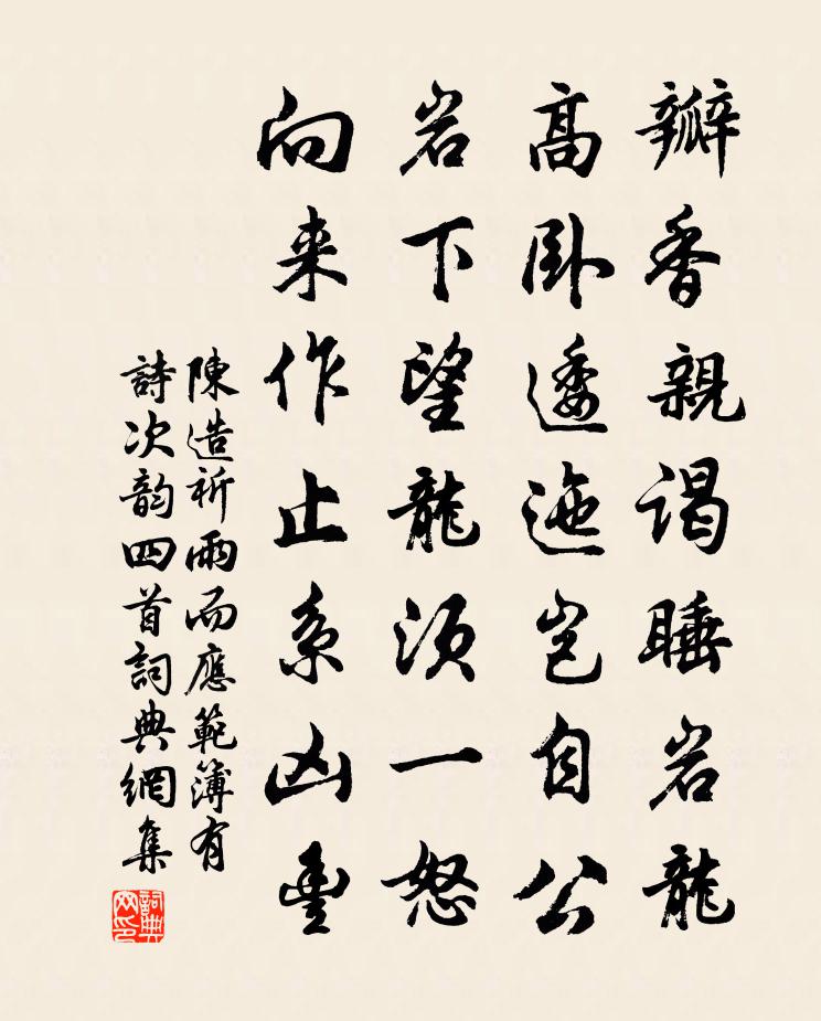 詩詞名句歷史字典書法欣賞書法字典國語詞典說文解字康熙字典古漢語字典標 題 作 者 詩 句 祈雨而應范簿有詩次韻四首作者:陳造 朝代:宋代祈雨而應范簿有詩次韻四首原文瓣香親謁睡岩龍,高臥逶迤豈自公。岩下望龍鬚一怒,向來作止系凶豐。詩詞問答問:祈雨而應范簿有詩次韻四首的作者是誰?答:陳造問:祈雨而應范簿有詩次韻四首寫於哪個朝代?答:宋代陳造祈雨而應范簿有詩次韻四首書法欣賞祈雨而應范簿有詩次韻四首書法作品詩詞推薦念奴嬌(叔母生日劉左史光祖以余春時所與為壽詞韻見貺馥用韻謝之)魏了翁〔宋代〕夢中猶記,來時路、五馬踟躕攢立。江北城南春澹沲,山鎖一天晴日。伊軋徵車,徊徨去意,只有東風識。如今還游山黃滔〔唐代〕洞門穿瀑布,塵世豈能通。曾有游山客,來逢採藥翁。異花尋復失,幽徑躡還窮。擬作經宵計,風雷立滿空。送李伯珍主管西歸楊萬里〔宋代〕淡墨題名冠子衿,一星州縣嘆游沉。向來寄我南樓賦,不減古人東武吟。幾閣文書聊韞玉,蘭台筆札即紬金。李家月夜盧殷〔唐代〕露下涼生簟,無人月滿庭。難聞逆河浪,徒望白榆星。樹繞孤棲鵲,窗飛就暗螢。移時宿蘭影,思共習芳馨。頌古十五首釋慧遠〔宋代〕見處孤危立處高,急如石火利如刀。到家問路家何在,掀倒棋盤脫布袍。張孝顯晨訪懋忠堂因拉陳昇可王囦道同飲徑醉岳珂〔宋代〕凌晨有客來款門,盥櫛下榻呼冠巾。怪生鵲喜繞庭樹,迎客不但填河津。清尊湛湛開北牖,頤指市奴駿奔走。烹鮮湖嶼李石〔宋代〕我昔泛洞庭,白波大如屋。水天兩相際,渺渺浸坤軸。小舟掀簸中,嘔眩篷底伏。忽然得島嶼,便欲縋船宿。西歸陳晦父赴十三韻戴表元〔宋代〕古人取遠士,得一以為豪。江左貢千百,選掄今始勞。占對混童廝,趨蹌偕吏曹。以茲寓繩準,棄髓索皮毛。遂乃朱買臣徐鈞〔宋代〕長歌負擔久棲棲,一旦高車守會稽。衣錦還鄉成底事,只將富遺耀前妻。畫花歌與曾舜賢趙崇嶓〔宋代〕小曾與花為莫逆,夢作花神住花國。分將天巧入畫圖,花不役君君自役。東風一夜入芳叢,春在煙塵霧雨中。披香到雪峰陳宓〔宋代〕幾載游山成負約,千年有寺未曾登。卻因名利經行此,羞對林間問我僧。三月三日宴王明府山亭(得哉字)高瑾〔唐代〕暮春元巳,春服初裁。童冠 * ,於洛之隈。河堤草變,鞏樹花開。逸人談發,仙御舟來。間關黃鳥,瀺灂丹腮。采菖蒲釋文珦〔宋代〕雁盪高寒處,穿雲採得來。豈能同野草,容易有花開。瘦節偏宜石,纖叢不受埃。幽人知爾性,曉澗汲泉杯。次韻和正仲種菜種麥二首舒岳祥〔宋代〕稻畦已改翻泥細,麥承初分趁勢斜。觳觫倦耕眠樹下,畢逋得食下天涯。嫩晴微雨周時序,臘雪春風潤土砂。避地偶書楊簡〔宋代〕無聲之樂聞四方,純德孔明即就將。哀樂相生不可見,衾衾非燠箑非涼。秋毫莫大泰山小,殤子上壽彭祖夭。入門再依韻梅堯臣〔宋代〕一嫁異域去,不復臨鏡台。念昔辭家時,豈為單于來。適遐固亦命,配醜非由媒。始欲並日月,今嗟隨風埃。仆侍定風波蘇軾〔宋代〕莫聽穿林打葉聲,何妨吟嘯且徐行。竹杖芒鞋輕勝馬,誰怕?一蓑煙雨任平生。料峭春風吹酒醒,微冷,山頭斜照木蘭花慢(客贈牡丹)劉克莊〔宋代〕維摩居士室,晨有鵲、噪檐聲。排闥者誰歟,冶容袨服,寶髻珠瓔。疑是毗耶城裡,那天魔、變作散花人。姑射神沁園春 留別張周卿韻魏初〔元代〕自揣平生,百無一能,此心拙誠。甚年來行役,交情契闊,東奔西走,水送山迎。遙望神州,故人千里,何幸今年贈別饒雲叟赴萬州教官鄧深〔宋代〕話別喔詩當酒甌,竹萌成筍麥方秋。數聲春後呼風鳥,百丈朝來送浪舟。已得通津好訊息,何妨舊物小淹留。到官名句推薦落梅庭榭香,芳草池塘綠。晏幾道《生查子·落梅庭榭香》 春風得意馬蹄疾,一日看盡長安花。孟郊《登科後》 清明過了,不堪回首,雲鎖朱樓。朱淑真《眼兒媚·風日遲遲弄輕柔》 會挽雕弓如滿月,西北望,射天狼。蘇軾《江城子·密州出獵》 草秀故春色,梅艷昔年妝。李世民《元日》 遙看孟津河,楊柳郁婆娑。佚名《折楊柳歌辭五首》 回首暮雲遠,飛絮攪青冥。蘇軾《水調歌頭·昵昵兒女語》 有花堪折直須折,莫待無花空折枝。無名氏《雜詩》 一春不識西湖面。翠羞紅倦。許棐《後庭花·一春不識西湖面》 行出於己,名生於人。佚名《逸周書·卷六·諡法解》