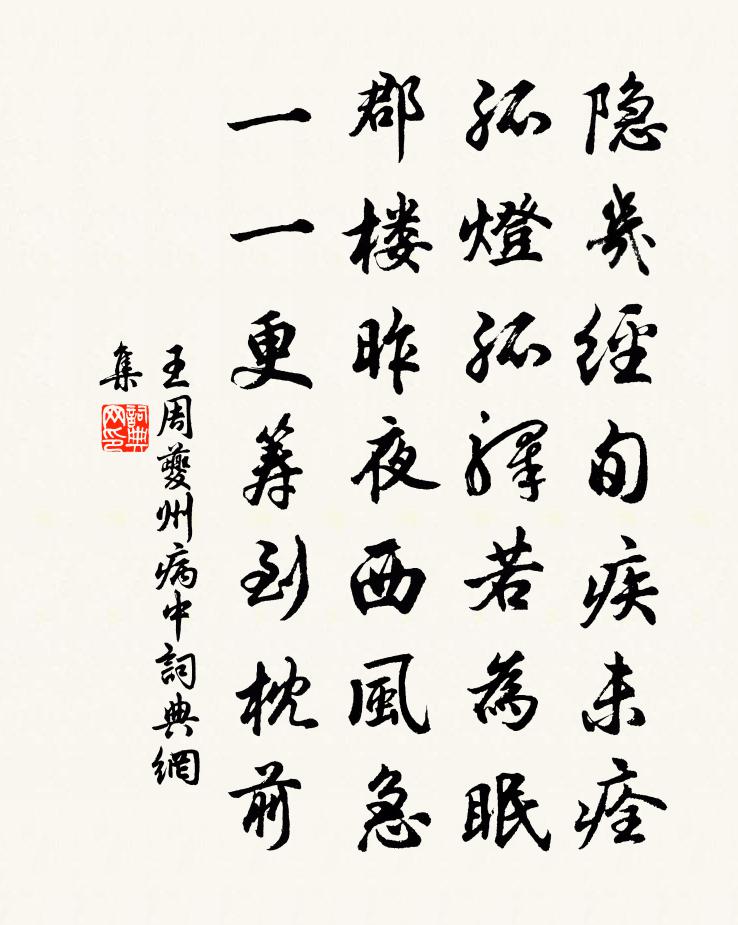 詩詞名句歷史字典書法欣賞書法字典國語詞典說文解字康熙字典古漢語字典標 題 作 者 詩 句 夔州病中作者:王周 朝代:唐代夔州病中原文隱几經旬疾未痊,孤燈孤驛若為眠。郡樓昨夜西風急,一一更籌到枕前。詩詞問答問:夔州病中的作者是誰?答:王周問:夔州病中寫於哪個朝代?答:唐代問:夔州病中是什麼體裁?答:七絕王周夔州病中書法欣賞夔州病中書法作品注釋全唐詩:卷765-23詩詞推薦紫騮馬徐陵〔南北朝〕玉鐙繡纏鬃。金鞍錦覆幪。風驚塵未起。草淺埒猶空。角弓連兩兔。珠彈落雙鴻。日斜馳逐罷。連翩還上東。臘月王禹偁〔宋代〕臘月滁州始覺寒,年豐歲暮郡齋閒。官供好酒何憂雪,天與新詩合看山。日照野塘梅欲綻,燒回荒逕草猶斑。吏人蔡忠惠家觀墨跡劉克莊〔宋代〕維蔡郡之望,過者必式閭。嚴嚴端明廳,遺像猶肅如。頗聞手澤富,儻許窺珍儲。主人命發笥,棐幾同卷舍。比顏寄柳塘汪叔畊三首詹初〔宋代〕不聞爾言久,因覺我言非。欲得爾之善,真期爾指歸。燕貢士蘇轍〔宋代〕泮水生芹藻,乾旄在浚城。桑鴞同變響,苹鹿共和鳴。秋晚槐先墮,霜多桂向榮。清尊助勸駕,急管發歡聲。勇銳送范少約二首項安世〔宋代〕久從雲共商,稍與霰相和。初看稀可數,漸覺多難奈。如塵塞道起,似塊當空墮。練搗萬家砧,糠揚千廩簸。學舞元十八從事南海欲出廬山臨別舊居有戀泉聲之什…伸別情白居易〔唐代〕賢侯辟士禮從容,莫戀泉聲問所從。雨露初承黃紙詔,煙霞欲別紫霄峰。傷弓未息新驚鳥,得水難留久臥龍。我正乞巧同蘧庵先生賦陳維崧〔清代〕碧雲耿耿,見銀河低瀉。人在針樓曝衣罷。告天孫、臣本屠釣江東,疏拙甚,願以蛛絲巧借。天孫含笑答:見事卿游華藏寺強至〔宋代〕我今作邑水雲鄉,一到猶疑換俗腸。況在塵區正紛汩,乍來法界得清涼。松筠鎖霧姿逾秀,樓閣摩霄勢欲翔。更即春行即興李華〔唐代〕宜陽城下草萋萋,澗水東流復向西。芳樹無人花自落,春山一路鳥空啼。壬午六月八日書懷戴表元〔宋代〕懷人故國鱗鴻絕,避地春園草樹長。四壁空存醫俗具,千金難售賣獃方。共兒坐誦修吳語,有客行歌銜楚裝。昨夜酬邵堯夫見示安樂窩中打乖吟司馬光〔宋代〕安東窩中自在身,猶嫌名字落紅塵。醉吟終日不知老,經史滿堂誰道貧。長掩柴荊避寒暑,只將花卉記冬春。料非碧角簟曹松〔唐代〕細皮重疊織霜紋,滑膩鋪床勝錦茵。八尺碧天無點翳,一方青玉絕纖塵。蠅行只恐煙粘足,客臥渾疑水浸身。五月城南雜詠二十首采菱舟張栻〔宋代〕散策下亭阿,水清魚可數。卻上采菱舟,乘風過南浦。時世裝,儆戎也乾隆〔清代〕城中好高髻,鄉間一尺長。元和亦有時世裝,因之流行遍四方,不為怡容為戚態,望而可知非兆祥。所以少傅作詩和彥達新居胡寅〔宋代〕喜居夏屋成,竹樹讙燕雀。門徑眇雲水,亦見輪蹄錯。君本有用才,魏匏自濩落。平生五車勤,歲晏一簞樂。永言次韻王適上元夜二首蘇轍〔宋代〕宿雨初乾試火城,端居無計伴遊行。厭看門外繁星動,想見僧窗一點明。老罷逢春無樂事,夢回孤枕有鄉情。重因宮詞四首吳百生〔宋代〕中使質明催,珠宮寶扇回。髻雲雙鳳擁,歌雪百花堆。競立徼殊寵,群趨獨魁。壽陽春夜額,帖盡一庭梅。楊帥二首項安世〔宋代〕更須石叟共甘公,酌得民言帝自同。四海人才容接里,百城生聚撫摩中。似聞聖世開皇極,欲倚名賢鎮士風。看把讀書堂毛德琦〔清代〕才高誠與命相妨,泥飲方知醉是鄉。率土盡傳供奉曲,匡山尚有讀書堂。松元猶染宮袍濕,岩壑常沾翰墨香。回憶名句推薦綠池芳草滿晴波,春色都從雨里過。高啟《春暮西園》 北極朝廷終不改,西山寇盜莫相侵。杜甫《登樓》 都雲作者痴,誰解其中味。曹雪芹《紅樓夢·第一回》 正護月雲輕,嫩冰猶薄。辛棄疾《瑞鶴仙·賦梅》 彩扇紅牙今都在,恨無人、解聽開元曲。蔣捷《賀新郎·夢冷黃金屋》 花明玉關雪,葉暖金窗煙。李白《折楊柳》 星河秋一雁,砧杵夜千家。韓翃《酬程延秋夜即事見贈》 歲雲暮矣多北風,瀟湘洞庭白雪中。杜甫《歲晏行》 黃河遠上白雲間,一片孤城萬仞山。王之渙《涼州詞二首·其一》 北風利如劍,布絮不蔽身。白居易《村居苦寒》