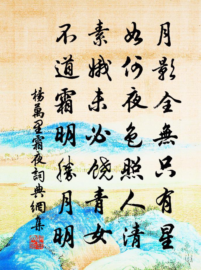 詩詞名句歷史字典書法欣賞書法字典國語詞典說文解字康熙字典古漢語字典標 題 作 者 詩 句 霜夜作者:楊萬里 朝代:宋代霜夜原文月影全無只有星,如何夜色照人清。素娥未必饒青女,不道霜明勝月明。詩詞問答問:霜夜的作者是誰?答:楊萬里問:霜夜寫於哪個朝代?答:宋代問:楊萬里的名句有哪些?答:楊萬里名句大全楊萬里霜夜書法欣賞霜夜書法作品詩詞推薦夢李白誦竹枝詞三疊黃庭堅〔宋代〕命輕人鮓瓮頭船,日瘦鬼門關外天。北人墮淚南人笑,青壁無梯聞杜鵑。復病三首蘇轍〔宋代〕一病五十日,復爾當解官。不才歸亦樂,無食去猶難。黽勉人應笑,低徊意已闌。舊師摩詰老,把卷靜中看。燕羅隱〔唐代〕不必嫌漂露,何妨養羽毛。漢妃金屋遠,盧女杏梁高。野迥雙飛急,煙晴對語勞。猶勝黃雀在,棲息是蓬蒿。句蔡肇〔宋代〕原同籍堤輩,終老韓公門。答司馬諫議書王安石〔宋代〕某啟:昨日蒙教,竊以為與君實游處相好之日久,而議事每不合,所操之術多異故也。雖欲強聒,終必不蒙見察,摸魚兒(仲宣樓賦)陳策〔宋代〕倚危梯、酹春懷古,輕寒才轉花信。江城望極多愁思,前事惱人方寸。湖海興。算合付元龍,舉白澆談吻。憑高試念奴嬌·春雪詠蘭陳子龍〔明代〕問天何意,到春深、千里龍山飛雪?解佩凌波人不見,漫說芷珠宮闕。楚殿煙微,湘潭月冷,料得都攀折。嫣然幽過三鶴山二絕洪咨夔〔宋代〕造物工夫拙剪裁,群芳各自得春開。梨花嫁與東風去,隨後荼蘼作媵來。山居雜詩九十首曹勛〔宋代〕偶讀禪門禮,老賾存清規。魚鼓鐘磬間,細行兼威儀。能居三板頭,可當一住持。破衲受用薄,後來有不知。文宣王及其弟子贊宋高宗〔宋代〕侁侁申周,四科與儔。逸駕文圃,鼓枻儒流。冠佩既燕,言動允休。邵陵得封,可想清修。喜雨上主人尚書徐夤〔唐代〕 * 攘袂敕神龍,雨我公田兆歲豐。幾日淋漓侵暮角,數宵滂沛徹晨鐘。細如春霧籠平野,猛似秋風擊古松。門下徹雲澗鄭露〔唐代〕延綿不可窮,寒光徹雲際。落石早雷鳴,濺空春雨細。閒居雜詠三十二首博學陳淳〔宋代〕泛觀事物間,是理真卓卓。無一非吾事,要在博所學。游西湖五首滕岑〔宋代〕豐樂樓頭沸管弦,拍床喚酒記當年。而今寂寞空欄楯,樓下漣漪自宛然。紅荳蔻花范成大〔宋代〕綠葉焦心展,紅苞竹籜披。貫珠垂寶珞,剪彩倒鸞枝。且入花欄品,休論藥裹宜。南方草木床,為爾首題詩。淳熙四年二月既望靜江守臣張某奉詔勸農於郊張栻〔宋代〕尊君親上,其篤勿忘。小心畏忌,率於憲章。行役縣西喜雨寄任公漸大夫黃庭堅〔宋代〕行役勞人望縣齋,心如枯井喜塵埃。青燈簾外蕭蕭雨,破夢山根殷殷雷。新麥欲連天際好,濃雲猶傍日邊來。田歌送徐叔智運使奉祠歸吳中范成大〔宋代〕手種湖邊花百畝,東風日夜催歸去。當年辛苦種花時,不道白頭猶未歸。君如肯過城南陌,但向水雲紅處覓。煩呼和趙帥壽張漕韻二首陳傅良〔宋代〕使者耕時出省春,聯翩珠玉又前陳。先聲所暨搖山嶽,落筆相豪泣鬼神。嘉與九城俱晏粲,訖無一事尚棼泯。獨慚頌古三十一首釋玿〔宋代〕唇上必並班豹剝,舌頭當的帝都丁。自古上賢猶不識,造次凡流豈可明。名句推薦秋菊堪餐,春蘭可佩,留待先生手自栽。辛棄疾《沁園春·帶湖新居將成》 勝日尋芳泗水濱,無邊光景一時新。朱熹《春日》 青山綠水,白草紅葉黃花。白樸《天淨沙·秋》 窮冬烈風,大雪深數尺,足膚皸裂而不知。宋濂《送東陽馬生序》 蒼旻霽涼雨,石路無飛塵。岑參《暮秋山行》 新啼痕壓舊啼痕,斷腸人憶斷腸人。王實甫《十二月過堯民歌·別情》 不讓則不和,不和不可以遠征。左丘明《左傳·定公·定公五年》 悲吟雨雪動林木,放書輟劍思高堂。李白《留別於十一兄逖裴十三游塞垣》 芙蓉如面柳如眉,對此如何不淚垂。白居易《長恨歌》 早須清黠虜,無事莫經秋岑參《送人赴安西》