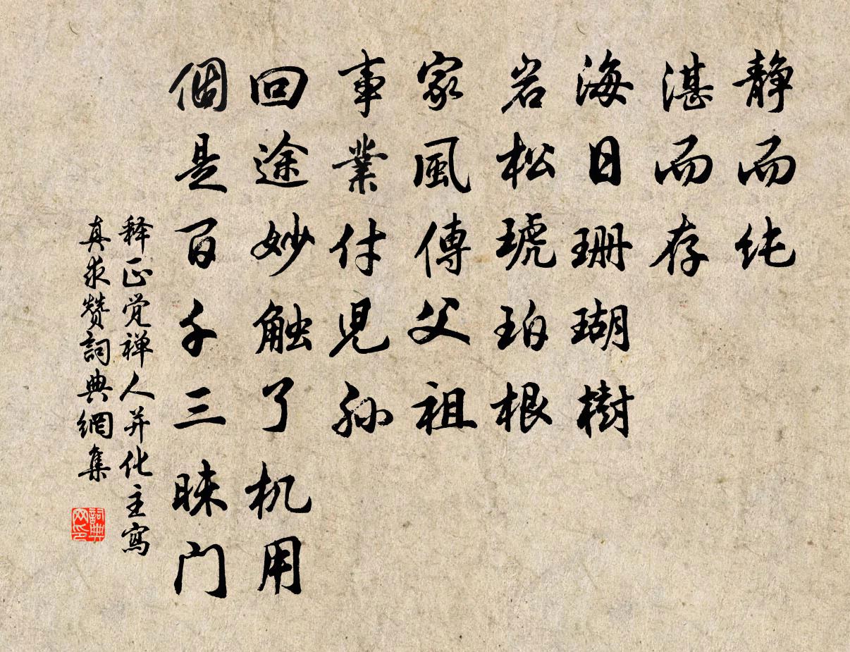 詩詞名句歷史字典書法欣賞書法字典國語詞典說文解字康熙字典古漢語字典標 題 作 者 詩 句 禪人並化主寫真求贊作者:釋正覺 朝代:宋代禪人並化主寫真求贊原文靜而純,湛而存。海日珊瑚樹,岩松琥珀根。家風傳父祖,事業付兒孫。回途妙觸了機用,個是百千三昧門。詩詞問答問:禪人並化主寫真求贊的作者是誰?答:釋正覺問:禪人並化主寫真求贊寫於哪個朝代?答:宋代釋正覺禪人並化主寫真求贊書法欣賞禪人並化主寫真求贊書法作品詩詞推薦嚴先輩送鯉魚趙蕃〔宋代〕嚴郎得魚不敢食,走送茅齋嫌步遲。卻愧家貧慣粗糲,無人為我膾銀絲。和李誠之待制燕別西湖〈並敘〉蘇轍〔宋代〕熙寧六年九月,天章閣待制李公,自登州來守此邦。愛其山川泉石之勝,怡然有久留之意。此邦之人,安公之惠,朱可肥陳西老徐靈淵攜酒餞別飲罷以周興嗣千徐照〔宋代〕歲晚花風霧寒,花用事有青花女。滕六花更無賴,冰花斗欲舞。狹坐夜生棱,叉袖手難距。百草盡晦寂,蟲虺亦蟄贈華山何學士致仕魏野〔宋代〕累表乞眠雲,明君始許君。三峰同鶴住,半俸與僧分。益壽藥誰得,朝元香 * 。承家多令子,冠蓋世紛紛。仲秋太常寺觀公輅車拜陵苗仲方〔唐代〕南宮初開律,金風已戒涼。拜陵將展敬,車輅儼成行。士庶觀祠禮,公卿習舊章。郊原佳氣引,園寢瑞煙長。鹵簿閒居陸游〔宋代〕小隱輕華屋,深山自結茅。亂苔侵石磴,疏竹映花梢。李振引諺佚名〔唐代〕百歲奴事三歲主。觸目陳師道〔宋代〕果下翩翩跨紫騮,踏花濺水見風流。可無雙璧千金聚,付與狂兒取次游。送周壽元翁西上賀鑄〔宋代〕露草蔓前庭,微蟲思明月。宵分耿不寐,懷我友生別。舟師望箕宿,綴幔須明發。蠲首托歸風,安知川路闊。夫君武夷精舍十詠仁智堂袁樞〔宋代〕此身本無累,動靜隨所寓。結廬在岩谷,自適山水趣。朝來挹雲氣,日夕沐風露。坐觀天地心,詎忘仁智慮。天台道中林憲〔宋代〕月色在野水,雲痕澹前林。籃輿轉松竹,襟袖翠靄深。燈火見仍隱,機杼有遺音。境靜眾今息,泠然發微吟。驕雲感物陸游〔宋代〕小園清曉岸綸巾,物態年光日日新。綠葉自生黃自落,不應秋至始愁人。吳松道中二首晁補之〔宋代〕曉路雨蕭蕭,江鄉葉正飄。天寒雁聲急,歲晚客程遙。鳥避征帆卻,魚驚盪槳跳。孤舟宿何許,霜月系楓橋。句釋惠崇〔宋代〕遺偈傳諸國,留真在一峰。次韻胡完夫蘇軾〔宋代〕青衫別淚尚斕斑,十載江湖困抱關。老去上書還北闕,朝來拄笏望西山。相從杯酒形骸外,笑說平生醉夢間。萬事採菊韓竹坡〔宋代〕擷我百結衣,為君采東籬。半日不盈掬,明朝還滿枝。悠然何處是,千古正如斯。禪人寫真求贊釋正覺〔宋代〕風日麵皮,秋山眉目。閒情肖水雲,野性從麋鹿。憨憨少室九年,草草曹溪一宿。窮根徹源,出髓敲骨。和李僕射秋日病中作張籍〔唐代〕由來病根淺,易見藥功成。曉日杵臼靜,涼風衣服輕。猶疑少氣力,漸覺有心情。獨倚紅藤杖,時時階上行。舟次山陽呈王宗說寺丞梅堯臣〔宋代〕遠客雖有樂,莫如逢故人。夜懷夷門時,月照楚水濱。自居扁舟上,隨處與船鄰。宜將到此日,因使報朋親。轉應曲·寒夢王敬之〔清代〕寒夢。寒夢。夢被詩魔調弄。醒來吟落燈花,燈暗紙窗月斜。月斜。月斜。巷口柝聲敲歇。名句推薦大風起兮雲飛揚。威加海內兮歸故鄉。安得猛士兮守四方!劉邦《大風歌》 白頭宮女在,閒坐說玄宗。元稹《行宮》 同來何事不同歸。賀鑄《半死桐·重過閶門萬事非》 酒未開樽句未裁,尋春問臘到蓬萊。曹雪芹《訪妙玉乞紅梅》 仁者,人也,親親為大。義者,宜也,尊賢為大。子思《中庸·第二十章》 自是人生長恨水長東。李煜《相見歡·林花謝了春紅》 惜別浮橋駐馬時,舉頭試望南山嶺。李頎《少室雪晴送王寧》 戒惕弗棄,智勇弗顯。來俊臣《羅織經·事上卷第二》 濃霧知秋晨氣潤,薄雲遮日午陰涼,不須飛蓋護戎裝。范成大《浣溪沙·江村道中》 一別都門三改火,天涯踏盡紅塵。蘇軾《臨江仙·送錢穆父》