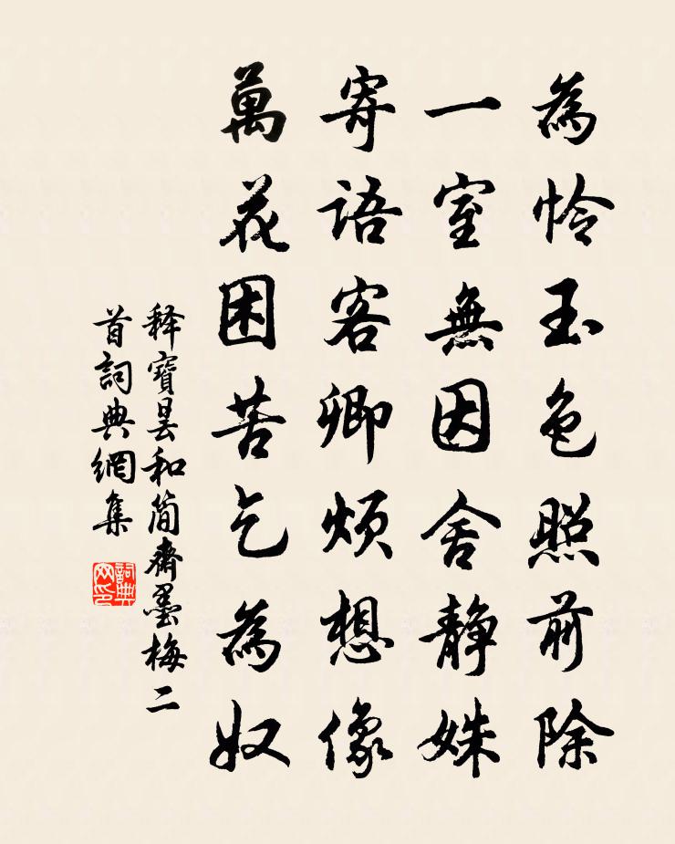 詩詞名句歷史字典書法欣賞書法字典國語詞典說文解字康熙字典古漢語字典標 題 作 者 詩 句 和簡齋墨梅二首作者:釋寶曇 朝代:宋代和簡齋墨梅二首原文為憐玉色照前除,一室無因舍靜姝。寄語客卿煩想像,萬花困苦乞為奴。詩詞問答問:和簡齋墨梅二首的作者是誰?答:釋寶曇問:和簡齋墨梅二首寫於哪個朝代?答:宋代釋寶曇和簡齋墨梅二首書法欣賞和簡齋墨梅二首書法作品詩詞推薦宴坐庵范成大〔宋代〕粥魚吼罷鼓逢逢,臥聽飢鼯上曉釭。一點斜光明紙帳,悟知檐雀已穿窗。卜運算元·不是愛風塵嚴蕊〔宋代〕不是愛風塵,似被前緣誤。花落花開自有時,總賴東君主。去也終須去,住也如何住!若得山花插滿頭,莫問奴歸奉陪段相公晚夏登張儀樓姚康〔唐代〕登覽值晴開,詩從野思來。蜀川新草木,秦日舊樓台。池景搖中座,山光接上台。近秋宜晚景,極目斷浮埃。木犀答二吳書王遂〔宋代〕過盡人間百草芳,尚留寒菊對風光。月華已下中天白,香樹初搖滿院涼。金粟遠看千盡影,犀皮近種百年香。聖朝送杜侍御純陝西轉運陳師道〔宋代〕饋糧千里古無策,木牛流馬功不極。邊頭數米換黃金,將軍汗馬未伏櫪。黠羌人面作胡語,鳥雀貪生爾如許。熊虎宮詞王仲修〔宋代〕西池曼衍魚龍戲,燕罷迴鑾近夕陽。路遠不乘雙鳳輦,玉鞍珠轡御龍驤。寄雪蓬姚監丞蔡槃〔宋代〕憶昔青燈夜對床,斷猿聲里早梅香。一從去棹沖寒雪,幾度憑闌到夕陽。秋思漸於蟬外覺,別愁偏向雁邊長。梧桐登蜀阜二首錢時〔宋代〕秋暮如京歲暮還,春來更墮藥瓢間。眼前有底閒風月,忍得經年不上山。大道歌白玉蟾〔宋代〕烏飛金,兔走玉,三界一粒粟。山河大地幾年塵,陰陽顛倒入玄谷。人生石火電光中,數枚客鵲枝頭宿。桑田滄海贈夢得白居易〔唐代〕心中萬事不思量,坐倚屏風臥向陽。漸覺詠詩猶老醜,豈宜憑酒更粗狂。頭垂白髮我思退,腳蹋青雲君欲忙。只有送楊伯子劉過〔宋代〕天下少奇士,況乎吾一州。逢人問姓字,知子有源流。蘭砌多黃口,蓬山半白頭。誠齋知未可,喚作小坡休。詠梅五十首呈史尚書釋紹嵩〔宋代〕洞水悲鳴無歇時,人稀景靜雪消遲。東風信有芳菲意,昨日梅花開一枝。枕上鄭剛中〔宋代〕三面屏圍屈曲山,篆爐灰冷柏無煙。霜鐘不管春陽薄,聲到寒窗各夢邊。寄題祝秘校航齋曹勛〔宋代〕密密簾垂映柁樓,濟川聊此艤虛舟。群經列坐供游息,巨浪掀天得罷休。猿鶴依棲知有地,兒童遺墜且無憂。業成聞官軍破吉浪戎小而固,慮史氏遺忽,因記為薛能〔唐代〕和吹度穹旻,虛徐接建寅。不辭加一歲,唯喜到三春。燎照雲煙好,幡懸井邑新。禎祥應北極,調燮驗平津。樹欲瘴霧楊萬里〔宋代〕午時猶未識金烏,對面看人一似無。臘月黃茅猶爾許,不知八月卻何如。送水雲歸吳章妙懿〔宋代〕一從騎馬逐鈴鑾,過了千山又萬山。君已歸裝向南去,不堪腸斷唱陽關。樵隱釋紹曇〔宋代〕斫得塊柴擔不起,和雲颺下枕頭邊。夢魂不涉人間世,肯把黃梅破缽傳。早鶯齊己〔唐代〕何處經年閟好音,暖風催出囀喬林。羽毛新刷陶潛菊,喉舌初調叔夜琴。藏雨並棲紅杏密,避人雙入綠楊深。曉來送將官梁左藏赴莫州蘇軾〔宋代〕燕南垂,趙北際,其間不合大如礪。至今父老哀公孫,烝土為城鐵作門。城中積穀三百萬,猛士如雲驕不戰。一朝名句推薦垂楊拂綠水,搖艷東風年。李白《折楊柳》 君言不得意,歸臥南山陲。王維《送別》 原濁者,流不清;行不信者,名必耗。墨子《墨子·02章 修身》 無為其所不為,無欲其所不欲。孟子《孟子·盡心章句上·第十七節》 群燕辭歸鵠南翔,念君客游多斷腸。曹丕《燕歌行》 道傍榆莢仍似錢,摘來沽酒君肯否。岑參《戲問花門酒家翁》 馬嘶芳草遠,高摟簾半掩。顧敻《醉公子·岸柳垂金線》 今日清明節,園林勝事偏。賈島《清明日園林寄友人》 我軍青坂在東門,天寒飲馬太白窟。杜甫《悲青坂》 黃金燃桂盡,壯志逐年衰。孟浩然《秦中感秋寄遠上人 / 秦中寄遠上人》