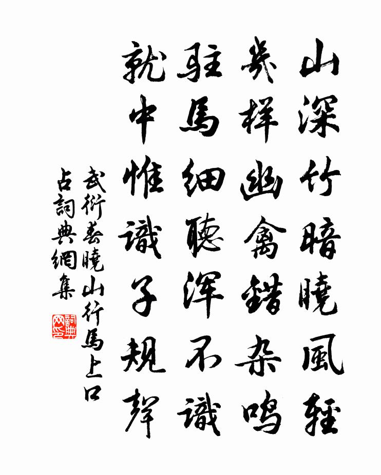 詩詞名句歷史字典書法欣賞書法字典國語詞典說文解字康熙字典古漢語字典標 題 作 者 詩 句 春曉山行馬上口占作者:武衍 朝代:宋代春曉山行馬上口占原文山深竹暗曉風輕,幾樣幽禽錯雜鳴。駐馬細聽渾不識,就中惟識子規聲。詩詞問答問:春曉山行馬上口占的作者是誰?答:武衍問:春曉山行馬上口占寫於哪個朝代?答:宋代武衍春曉山行馬上口占書法欣賞春曉山行馬上口占書法作品詩詞推薦句釋洪英〔宋代〕天際雪埋千尺石,洞門凍折數株松。歲暮雜憶陳維崧〔清代〕江南憶,懊惱十西湖。秋月春花錢又趙,青山綠水越連吳。往事只模糊。和陶淵明飲酒二十首方回〔宋代〕華鬢極老態,醜面乏妍姿。插花已不可,可插唯菊枝。□□偶有酒,此事竟大奇。連作數日飲,詩亦未暇為。次韻杜安行嘉陵春日書事十首郭印〔宋代〕江路曾浮宅,懸崖兩壁青。晴煙籠小艇,落照射高亭。花簇紅妝岸,鷗群白點汀。何時篷底臥,半夜酒初醒。題衢州順溪館曾從龍〔宋代〕紅照西沉暫解鞍,偶然假館豈求安。新豐獨酌誰為侶,坐對窗前竹一竿。青溪二首馬之純〔宋代〕人道青溪有九曲,如今一曲僅能存。江家宅畔成花圃,東府門前作菜園。登閣尚堪觀疊嶂,泛舟猶可醉芳樽。料應藺相如徐鈞〔宋代〕缶擊何分秦勝負,璧還不是趙存亡。最憐恃勇偏輕舉,直挾君王冒虎狼。好事近(用前韻答鄧端友使君)向子諲〔宋代〕風勁入平林,掃盡一林黃葉。惟有長松千丈,掛娟娟霜月。使君和氣動江城,疑是芳菲節。忽到小園遊戲,見南枝田翁杜荀鶴〔唐代〕白髮星星筋力衰,種田猶自伴孫兒。官苗若不平平納,任是豐年也受飢。楊仲遠輓詩魏了翁〔宋代〕屬我銘先竁,元符事益光。十年黃壤夢,再世短松崗。樓外焄蒿集,閣前名節香。吳鉤無處掛,芻束寄諸郎。導引佚名〔宋代〕乘雲英聖,千載仰皇靈。垂法藹朝經。禹金熔范肖儀刑。日角煥珠庭。琳宮翠殿鳳文屏。迎奉慶安寧。孝思瞻謁薦詠十里塘姜店水亭前竹林楊萬里〔宋代〕一見此君面,荒村不是村。斜陽與可筆,棲雀子猷魂。客思方無那,詩愁得共論。問渠能飲否,把酒酹霜根。十月已酉西山訖事悼亡二首徐瑞〔宋代〕我已空諸幻,君今斷後緣。圓明應頓悟,成壞不須憐。玉宇行孤明,冰溪破冥煙。兒曹修非薦,再拜酹寒泉。絕句洞庭老人〔宋代〕八十滄浪一老翁,蘆花江上水連空。世間多少乘除事,良夜月明收釣筒。皇帝閣春帖子許應龍〔宋代〕金華彩勝年年巧,柏酒椒盤歲歲新。恭願吾皇千萬壽,四時無日不陽春。夜宿房溪,飲野人張珦家桂葉鹿蹄酒。其法以楊萬里〔宋代〕桂葉揉青作麴投,鹿蹄煮醁趁涼篘。落杯瑩滑冰中水,過口森嚴菊底秋。玉友黃封猶退舍,齏湯蜜汁更論籌。野人送緣有禪師與雷處士入武夷山貫休〔唐代〕師與雷居士,尋山道入閩。應將熊耳印,別授武夷君。崖罅仙棺出,江垠毒草分。他年相覓在,莫苦入深雲。偈頌十六首釋如淨〔宋代〕善行者不移雙足,善入者不動雙扉。清秋夜冷波心月,誰問安禪友亦稀。擬漢宮詞三首陳師道〔宋代〕帳底吹煙香自薰,鏡前含笑意生春。經年不道君恩薄,郤是恩深更誤人。挽鮑監鎮沈說〔宋代〕一紙辟書馳,華年發軔時。排云何不到,殞露遽如斯。幼子不知父,偏親反哭兒。有書來謁些,忍淚看埋碑。名句推薦下附上以成志,上恃下以成名。來俊臣《羅織經·治下卷第三》 思則有備,有備無患左丘明《左傳·襄公·襄公十一年》 但去莫復問,白雲無盡時。王維《送別》 歸鴻聲斷殘雲碧。背窗雪落爐煙直。李清照《菩薩蠻·歸鴻聲斷殘雲碧》 但箭雁沈邊,梁燕無主。劉辰翁《蘭陵王·丙子送春》 盤飧市遠無兼味,樽酒家貧只舊醅。杜甫《客至》 聖賢之所美,莫美乎聰明;聰明之所貴,莫貴乎知人。劉劭《人物誌·序》 一條藤徑綠,萬點雪峰晴。李白《冬日歸舊山》 生年不滿百,常懷千歲憂。佚名《生年不滿百》 水風輕,蘋花漸老,月露冷、梧葉飄黃。柳永《玉蝴蝶·望處雨收雲斷》