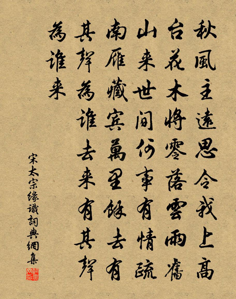 詩詞名句歷史字典書法欣賞書法字典國語詞典說文解字康熙字典古漢語字典標 題 作 者 詩 句 緣識作者:宋太宗 朝代:宋代緣識原文秋風主遠思,令我上高台。花木將零落,雲雨舊山來。世間何事有情疏,南雁藏賓萬里余。去有其聲為誰去,來有其聲為誰來。詩詞問答問:緣識的作者是誰?答:宋太宗問:緣識寫於哪個朝代?答:宋代宋太宗緣識書法欣賞緣識書法作品詩詞推薦送萬巨韓翃〔唐代〕漢相見王陵,揚州事張禹。風帆木蘭楫,水國蓮花府。百丈清江十月天,寒城鼓角曉鍾前。金爐促膝諸曹吏,玉管送胡季昭謫象州劉夢才〔宋代〕紹興寶慶百年余,古往今來說二胡。論事直須彈懇切,立朝端不忍阿諛。兩賢幸屬吾州有,萬事何曾公議無。象郡題度支雜事典庭中柏樹駱浚〔唐代〕乾聳一條青玉直,葉鋪千疊綠雲低。爭如燕雀偏巢此,卻是鴛鴦不得棲。玉樓春佚名〔宋代〕玉階瓊室冰壺帳。憑地水晶簾不上。兒家住處隔紅塵,雲氣悠揚風淡盪。有時閒把蘭舟放。霧鬢風鬟乘翠浪。夜深道者遺記佚名〔唐代〕武之在卯,堯王八季。我棄其寢,我去其扆。深深然,高高然。人不吾知,又不吾謂。由今之後,二百餘祀。焰焰水調歌頭 黃州快哉亭贈張偓佺蘇軾〔宋代〕落日繡簾卷,亭下水連空。知君為我新作,窗戶濕青紅。長記平山堂上,欹枕江南煙雨,杳杳沒孤鴻。認得醉翁語夢稚子司馬光〔宋代〕窮泉織骨已成塵,幽草閒化二十春。昔日相逢猶是夢,今宵夢裡更非真。近榆亭陳造〔宋代〕天亦積氣爾,種榆誰所傳。人間自得得,何適而非仙。少陵健於辭,暇計然不然。長翁名亭意,系影更可憐。春晚五首曹勛〔宋代〕新荷帖水翠田田,綠滿花梢午影圓。飯了從容春事靜,螭頭閒掬水濺濺。三友堂釋智愚〔宋代〕清客蒼官會此君,歲寒不減舊精神。有時品字論交態,各有丰標遠襲人。殘句滄海何曾斷地脈蘇軾〔宋代〕滄海何曾斷地脈,白袍端合破天荒。泛吳松江王禹偁〔宋代〕葦篷疏薄漏斜陽,半日孤吟未過江。唯有鷺鶿知我意,時時翹足對船窗。行雲歐陽修〔宋代〕疊疊煙波隔夢思,離愁幾日減要圍。行雲自亦傷無定,莫就行雲托信歸。城南二首曾鞏〔宋代〕水滿橫塘雨過時,一番紅影雜花飛。送春無限情惆悵,身在天涯未得歸。江寺晚眺釋斯植〔宋代〕盡日無多事,閒行一徑陰。人歸秋寺晚,月滿夜堂深。海闊頻生霧,城荒遠見林。青山與華發,空愧百年心。逍遙詠宋太宗〔宋代〕昔日神仙皆燒煉,不說根由人豈見。本是凡情枉謾勞,何年待得成九轉。秋郊作韋應物〔唐代〕清露澄境遠,旭日照林初。一望秋山淨,蕭條形跡疏。登原忻時稼,採菊行故墟。方願沮溺耦,淡泊守田廬。偈六首釋法智〔宋代〕一不成,二不是,火雲堆裹秋風起。堪笑耘田車水翁,手腳忙亂同兒戲。同兒戲,有巴鼻。但得豐年賀太平,四海頌古一○一首釋子淳〔宋代〕水澄月滿道人愁,妙盡無依類莫收。劫外正偏兼帶路,不萌枝上辨春秋。淇上別業高適〔唐代〕依依西山下,別業桑林邊。庭鴨喜多雨,鄰雞知暮天。野人種秋菜,古老開原田。且向世情遠,吾今聊自然。名句推薦新竹高於舊竹枝,全憑老乾為扶持。鄭燮《新竹》 樹德務滋,除惡務本佚名《尚書·周書·泰誓》 睡里消魂無說處。覺來惆悵消魂誤。晏幾道《蝶戀花·夢入江南煙水路》 處大無患者恆多慢,處小有憂者恆思善陳壽《三國志·蜀書·杜周杜許孟來尹李譙郤傳》 酒醒人靜奈愁濃。殘燈孤枕夢,輕浪五更風。徐昌圖《臨江仙·飲散離亭西去》 人之命在天,國之命在禮荀子《荀子·強國》 嗚呼!楚雖三戶能亡秦,豈有堂堂中國空無人!陸游《金錯刀行》 雄州霧列,俊采星馳。王勃《滕王閣序》 牧童騎黃牛,歌聲振林樾。袁枚《所見》 永豐柳,無人盡日飛花雪。張先《千秋歲·數聲鶗鴂》