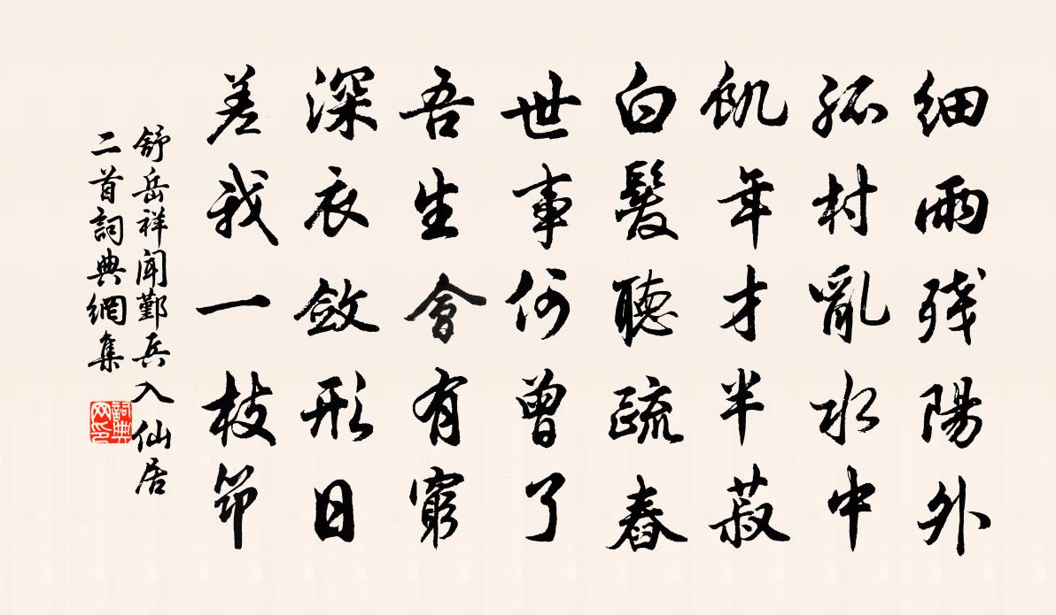 詩詞名句歷史字典書法欣賞書法字典國語詞典說文解字康熙字典古漢語字典標 題 作 者 詩 句 聞鄞兵入仙居二首作者:舒岳祥 朝代:宋代聞鄞兵入仙居二首原文細雨殘陽外,孤村亂水中。飢年才半菽,白髮聽疏舂。世事何曾了,吾生會有窮。深衣斂形日,差我一枝筇。詩詞問答問:聞鄞兵入仙居二首的作者是誰?答:舒岳祥問:聞鄞兵入仙居二首寫於哪個朝代?答:宋代舒岳祥聞鄞兵入仙居二首書法欣賞聞鄞兵入仙居二首書法作品詩詞推薦贈從古上人周弼〔宋代〕山僧袖出新詩卷,字字馨香撲人面。清晨何處展看來,捲得梅花兩三片。辛亥各口占十絕劉克莊〔宋代〕乞骸親奉留行韶,擢髮猶蒙掩覆恩。澤畔纍臣回首處,湯村已遠更徐村。題湘山大施堂范成大〔宋代〕重倚春林淚竹枝,南遊風物鬢成絲。難尋桂嶺千峰夢,更了湘山一段奇。來雲別無心外法,行藏休問塔中師。若論酬友人翁卷〔宋代〕常憂別時數,每苦歡事疎。矧茲同心人,契闊三月余。昨日攜瘦藤,往訪林間廬。差池不一見,出門恨何如。今晨小重山趙令畤〔宋代〕雨霽風高天氣清。玉盤浮出海,轉空明。小窗簾影冷如冰。愁不寐,獨自傍階行。情似浪頭輕。一番銷欲盡,一番驀山溪(壽生女)王大烈〔宋代〕東風吹物,漸入韶華媚。和氣散千門,更靈鵲、前村報喜。月宮仙子,昨夜下瑤台,人傳道,誕蘭房,喜把金盆洗水龍吟(己亥自壽二首)劉克莊〔宋代〕年年歲歲今朝,左弧懸罷渾無事。吾衰久矣,我辰安在,老之將至。懶寫京書,怕看除目,敗人佳思。把東籬掩定畫眉鳥歐陽修〔宋代〕百囀千聲隨意移,山花紅紫樹高低。始知鎖向金籠聽,不及林間自在啼。箋年老逢春八首自知一賞有分付邵雍〔宋代〕箋云:群卉爭妍處,奇花獨異時,東君深意思,亦恐要人知。太初宮楊備〔宋代〕三軍不食武昌魚,萬騎時遷建業居。曾得紫髯開國意,太初名是作宮初。老嘆陸游〔宋代〕老翁終日飽還嬉,常拾兒童竹馬騎。食為齒搖艱咀嚼,冠因發少易傾欹。鳥烏歌罷人誰問?咄咄書成自不知。堪笑驀山溪王哲〔元代〕觀公形貌,俊爽偏清秀。慷慨又雄豪,你肯把、清閒拯救。只知名利,前路做榮華,論文章,說佳吉,衣紫金章綬別鄉人南還張九齡〔唐代〕橘柚南中暖,桑榆北地陰。何言榮落異,因見別離心。吾亦江鄉子,思歸夢寐深。聞君去水宿,結思渺雲林。牽綴又和劉景文韻蘇軾〔宋代〕牡丹松檜一時栽,付與春風自在開。試問壁間題字客,幾人不為看花來。寄胡竹洲張至龍〔宋代〕野菜生根土亦香,寒林晴久漏春陽。山臨古畫開當戶,蝸學名書篆滿牆。密竹旋刪嫌礙月,青柑遲摘待經霜。兒童秋蕊香·七夕吳文英〔宋代〕懶浴新涼睡早。雪靨酒紅微笑。倚樓起把繡針小。月冷波光夢覺。 怕聞井葉西風到。恨多少。粉河不語墮秋曉。五粒小松歌李賀〔唐代〕前謝秀才、杜雲卿,命予作《五粒小松歌》,予以選書多事,不治曲辭,經十日,聊道八句,以當命意。蛇子蛇孫五溪陶弼〔宋代〕六月五溪邊,溪深氣象偏。晝陰疑雨後,久冷覺秋先。棧倚臨崖石,竿通隔領泉。片帆雲里現,知是貢賨船。靜寄孟運管招客皆藏春侍郎故人因與花翁孫季戴復古〔宋代〕來訪藏春宅,因登靜寄堂。異香薰寶鼎,清樂送瑤觴。穿行過花所,尋梅見海棠。白頭思往事,無語立斜陽。次韻鄭僉判方岳〔宋代〕煙藤雲木卷蒼虬,更放琅玕出一頭。山下人家方酷暑,此中棋局自驚秋。圖書如昨不堪煮,風月無多誰與酬。怪得名句推薦竹疏虛檻靜,松密醮壇陰。張泌《女冠子·露花菸草》 正單衣試酒,恨客里、光陰虛擲。周邦彥《六醜·落花》 壯歲從戎,曾是氣吞殘虜。陸游《謝池春·壯歲從戎》 樂遊原上清秋節,鹹陽古道音塵絕。李白《憶秦娥·簫聲咽》 不知命,無以為君子也;不知禮,無以立也;不知言,無以知人也。孔子弟子《論語·堯曰篇》 漸行漸遠漸無書,水闊魚沉何處問。歐陽修《玉樓春·別後不知君遠近》 善歌者,使人繼其聲;善教者,使人繼其志。戴聖《禮記·學記》 阿香秋夢起嬌啼,玉女傳幽素。吳文英《燭影搖紅·越上霖雨應禱》 風蕭蕭兮易水寒,壯士一去兮不復還。佚名《荊軻歌 / 渡易水歌》 歲月騖過,山陵浸遠范曄《後漢書·列傳·光武十王列傳》