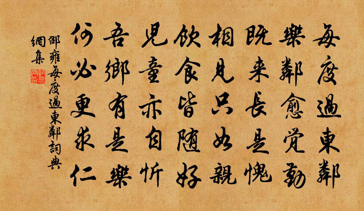 詩詞名句歷史字典書法欣賞書法字典國語詞典說文解字康熙字典古漢語字典標 題 作 者 詩 句 每度過東鄰作者:邵雍 朝代:宋代每度過東鄰原文每度過東鄰,樂鄰愈覺勤。既來長是愧,相見只如親。飲食皆隨好,兒童亦自忻。吾鄉有是樂,何必更求仁。詩詞問答問:每度過東鄰的作者是誰?答:邵雍問:每度過東鄰寫於哪個朝代?答:宋代邵雍每度過東鄰書法欣賞每度過東鄰書法作品詩詞推薦虛谷志歸後賦十首方回〔宋代〕樂天在知命,行止豈人能。元亮歸廬阜,延之牧始興。時才宜政柄,老我只詩朋。何日攜君手,西湖共訪僧。萬景樓三首用韻孫應時〔宋代〕德潤連城璧,文工五鳳樓。不愁來蜀徼,政喜識荊州。世久欺儒素,人當問品流。平生郭有道。得共李公舟。送元上人歸寧魏野〔宋代〕禪性雖無著,偏親奈白頭。直應飛錫到,方是倚門休。雪裡猶思去,花前豈易留。如何迎侍得,住近免離愁。直舍即事晁補之〔宋代〕秋雲多重陰,凌旦亦可樂。虛齋坐亭午,寒雨依高閣。王官有憂責,霖潦河未落。孝先但欲眠,不奈弟子謔。黃花和潘澤之沈元吉泛舟湖上王之道〔宋代〕散騎真前輩,休文即當家。泛舟成麗句,散綺見餘霞。驚去沙鷗沒,招來酒旆斜。春歸何處覓,籬角見金沙。早梅寄周純臣蔡沈〔宋代〕秋風日日吹芳草,山北山南跡如掃。江梅一夜暗將春,疏影橫斜水邊道。道逢驛使江南歸,袖中袖出天香老。英姿題洪景伯通判清閟堂陳知柔〔宋代〕別乘清名滿世間,卻來堂下植檀欒。已無欲物敗人意,且與此君同歲寒。夜月半庭金影碎,秋風一枕玉聲殘。雁行和劉評事送海禪和歸山杜荀鶴〔唐代〕衲外元無象,言尋那路尋。問禪將底說,傳印得何心。未了群山淺,難休一室深。伏魔寧是獸,巢頂亦非禽。觀色水調歌頭利登〔宋代〕日月換飛澗,風雨老孤松。千岩萬壑秋重,白氣接長空。一笑掀髯徐起,蒼佩腰間相照,猶自涌晴虹。桑海幾番覆苕山水歌楊維楨〔元代〕苕山如畫雲,苕水如篆文。使君畫船山水裡,蕩漾朝暉與夕曛。中流棹歌驚水鴨,捷如競渡千人軍。渡頭劉阮郎,赤亭渚詩江淹〔南北朝〕吳江泛丘墟。饒桂復多楓。水夕潮波赫。日暮精氣紅。路長寒光盡。鳥鳴秋草窮。瑤水雖未合。珠霜竊過中。坐識次韻林同年方岳〔宋代〕歲月半行李,與君荊蔞間。十年場屋夢,何日道家山。征棹江千里,雩壇月一間。豈無經濟意,生世政多嘻。送何元英鄭剛中〔宋代〕己未花夏入秦,花馬足臨渭花水。辛酉冬使蜀,去謂亦無幾。君於兩年間,同我三萬里。我今寄戎閫,君復持行李宿東寺范成大〔宋代〕一聲黃鵠夜深歸,棲雀驚鳴觸殿扉。北斗半垂樓閣外,風旛渾欲上雲飛。謝人惠扇子及茶齊己〔唐代〕槍旗封蜀茗,圓潔制鮫綃。好客分烹煮,青蠅避動搖。陸生夸妙法,班女恨涼飆。多謝崔居士,相思寄寂寥。賦得濁水求珠王損之〔唐代〕積水非澄徹,明珠不易求。依稀沈極浦,想像在中流。瞪目思清淺,褰裳恨暗投。徒看川色媚,空愛夜光浮。月入石堂上人房夜坐顧逢〔宋代〕秋夜坐來清,禪房靜掩扃。希賢思益語,愛國讀忠經。香篆行微蚓,燈花落小螢。西風憐寂寞,一曲奏檐鈴。端午觀競渡曲江朱翌〔宋代〕楝花角黍五色縷,一吊湘纍作端午。越人哀君楫迎汝,呼聲動地汗流雨。魚暇走避無處所,小試勒兵吾有取。樓船題蒼筤亭韓元吉〔宋代〕手種蒼筤數竿,築亭相與枕書看。故知落落非春事,直有青青共歲寒。一壑自欣幽意足,三年獨得此君歡。蕭然風橋上聞檐葡香趙蕃〔宋代〕曾聞檐葡林,自是佛世界。何許郁若風,飄颻能自在。不然山之靈,作意現奇怪。於此證香嚴,通途蓋亡礙。名句推薦百畝庭中半是苔,桃花淨盡菜花開。劉禹錫《再游玄都觀》 野臣潛隨擊壤老,日下鼓腹歌可封。鮑防《元日早朝行》 伏雨朝寒愁不勝,那能還傍杏花行。納蘭性德《浣溪沙·伏雨朝寒愁不勝》 功蓋三分國,名成八陣圖。杜甫《八陣圖》 不能則學,疑則問戴聖《大戴禮記·曾子制言上第五十四》 吾以為古之善者則述之,今之善者則作之,欲善之益多也。墨子《墨子·46章 耕柱》 長風蕭蕭渡水來,歸雁連連映天沒。盧思道《從軍行》 去來江口守空船,繞船月明江水寒。白居易《琵琶行 / 琵琶引》 假作真時真亦假,無為有處有還無。曹雪芹《紅樓夢·第一回》 蘭帳玉人睡覺,怪春衣、雪沾瓊綴。章楶《水龍吟·燕忙鶯懶芳殘》