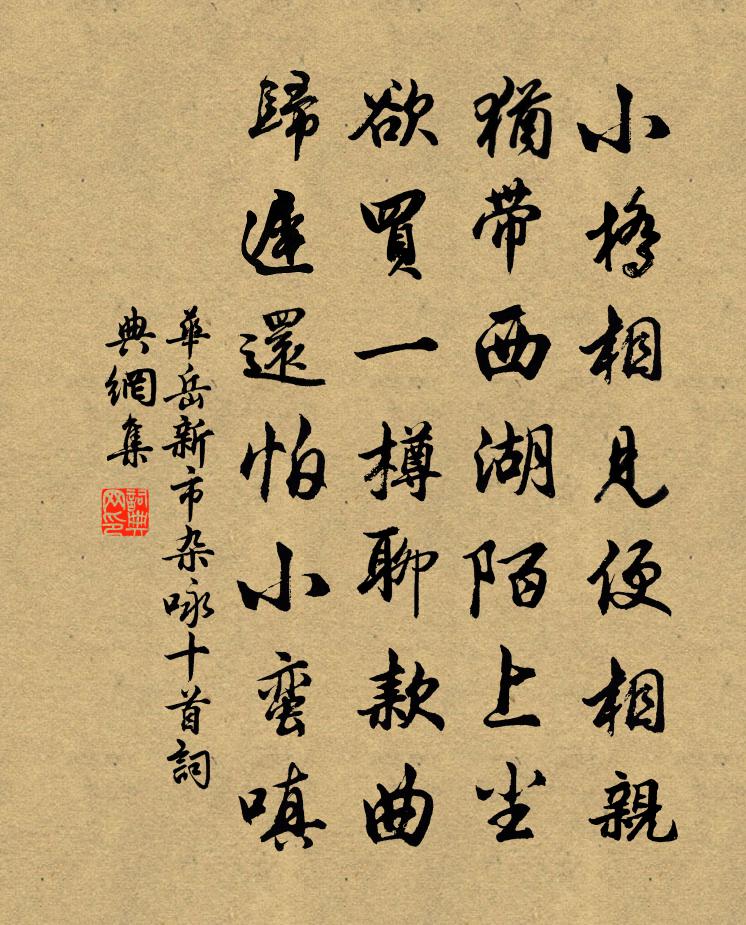 詩詞名句歷史字典書法欣賞書法字典國語詞典說文解字康熙字典古漢語字典標 題 作 者 詩 句 新市雜詠十首作者:華岳 朝代:宋代新市雜詠十首原文小橋相見便相親,猶帶西湖陌上塵。欲買一樽聊款曲,歸遲還怕小蠻嗔。詩詞問答問:新市雜詠十首的作者是誰?答:華岳問:新市雜詠十首寫於哪個朝代?答:宋代華岳新市雜詠十首書法欣賞新市雜詠十首書法作品詩詞推薦和安上弟雨雪應禱絕句蘇頌〔宋代〕霰雪為霖近浹旬,江湖清氣壓冬溫。應時豈是誠能感,作物宜同易畫坤。次韻江州林黃中上巳日會邛州劉侍郎梓漕任直周必大〔宋代〕牙旗排檻曉鳴風,樓上何人清宴同。東道主開軍府盛,西都賓共聖賢中。詞鋒永日論堅白,輦路他年記軟紅。頗念賦參政叔祖水亭陳必復〔宋代〕一段漁歌起夕陽,溪山佳處欠平章。受風楊柳絲絲弱,臨水軒窗面面涼。約客有時同把酒,橫琴無事 * 香。沙頭浪淘沙曾覿〔宋代〕一線海門來。雪噴雲開。崑山移玉下瑤台。捲地西風吹不斷,直到蓬萊。羯鼓譟春雷。鼉舞蛟回。歌樓鼓吹夕陽催送吳立夫方鳳〔宋代〕有人儲書塞中腸,不能奮發為辭章。亦有英姿限時命,坎坷名不登文場。吳子妙年即秀穎,隻字過眼終無忘。文如四月旦大雨晝夜不止者兩日微水一夕暴漲張嵲〔宋代〕山木綠陰暗,駭雲當晝繁。驚風乍掩冉,積雨連荒村。映岫若銀竹,瀉澗如翻盆。懸霤遂及旦,暗空還至昏。長川阻風茅山港項安世〔宋代〕日日南風費挽牽,江神知我意悠然。小舟隨水隨風住,不羨千帆上水舡。嘲李瑒題名韋蟾〔唐代〕渭水秦山照眼明,希仁何事寡詩情。只因學得虞姬婿,書字才能記姓名。祁門道中即事曹彥約〔宋代〕嶂疊巒層巧送青,一溪幽處小園亭。誰能換得王維手,洗我塵埃作畫屏。述行賦蔡邕〔兩漢〕延熹二年秋,霖雨逾月。是時梁翼新誅,而徐璜、左悺等五侯擅貴於其處。又起顯陽苑於城西,人徒凍餓,不得其曾仲恭侍郎惠酒以偶有名酒無夕不飲為韻謝之章甫〔宋代〕窮居少人事,落落仍寡偶。晨曦入茆檐,和氣生戶牖。擁褐還負暄,看雲更搔首。閒喔陶令詩,飢腸作雷吼。次姜堯章餞徐南卿韻二首陳造〔宋代〕姜郎未仕不求田,倚賴生涯九萬箋。稛載珠璣肯分我,北關當有合肥船。水龍吟陳德武〔宋代〕花驄柳外頻嘶,使君底事拼人去。圮橋風月,睢陵桃李,幾回良遇。我待君來,他催君去,誰留君住。想尊空北海題楊子容扇范成大〔宋代〕雙竹軒窗聽讀書,垂天雲翼要搏扶。與君只作三年別,射策東來過石湖。契丹馬蘇頌〔宋代〕邊城養馬逐萊蒿,棧皂都無出入勞。用力已過東野稷,相形不待九方皋。人知良御鄉評貴,家有材駒事力豪。略問句哀謙〔宋代〕時人不識田園樂,只羨相如駟馬歸。總領戶部楊公輓詩曹彥約〔宋代〕赬尾勞民久,青天轉粟艱。三年流馬運,一笑狎鷗閒。天遠才多阨,功深報肯慳。勒銘周伏柱,何恨掩丘山。再哭無竭禪師方回〔宋代〕倒撐無底船和尚,撐上西天是世尊。萬壑啼猿如下淚,一江明月與招魂。涅槃滿證無生果,解脫深參阿字門。卻笑秋晚山行黃庚〔宋代〕鏗然短策聲,無事覺身輕。落葉山行軟,流泉澗飲清。蟹痕沙露濕,雁影夕陽明。歸路逢林叟,斑荊歃隱盟。上巳日祓禊渭濱應制徐彥伯〔唐代〕晴風麗日滿芳洲,柳色春筵祓錦流。皆言侍蹕橫汾宴,暫似乘槎天漢游。名句推薦兩人對酌山花開,一杯一杯復一杯。李白《山中與幽人對酌》 楝花飄砌。蔌蔌清香細。謝逸《千秋歲·詠夏景》 五原秋草綠,胡馬一何驕。李白《塞上曲》 望征路愁迷,離緒難整陸叡《瑞鶴仙梅》 海榴花發應相笑,無酒淵明亦獨醒貝瓊《已酉端午》 以若所為,求若所欲,猶緣木而求魚也。孟子《孟子·梁惠王章句上·第八節》 心生,種種魔生;心滅,種種魔滅。吳承恩《西遊記·第十三回》 李白如今已仙去,月在青天幾圓缺?唐寅《把酒對月歌》 野梅燒不盡,時見兩三花劉基《古戍》 人棄我取,人取我與。司馬遷《史記·貨殖列傳》