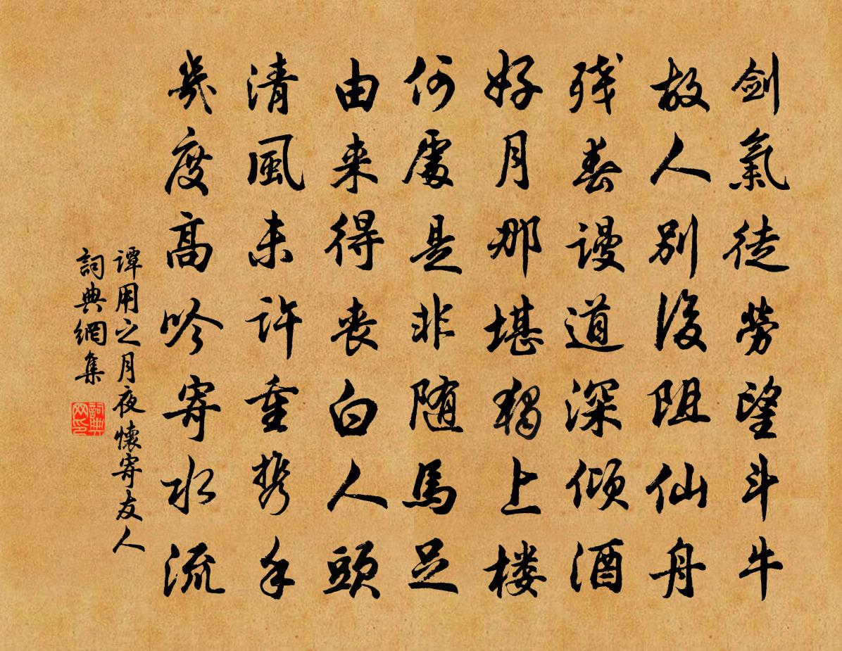 詩詞名句歷史字典書法欣賞書法字典國語詞典說文解字康熙字典古漢語字典標 題 作 者 詩 句 月夜懷寄友人作者:譚用之 朝代:唐代月夜懷寄友人原文劍氣徒勞望鬥牛,故人別後阻仙舟。殘春謾道深傾酒,好月那堪獨上樓。何處是非隨馬足,由來得喪白人頭。清風未許重攜手,幾度高吟寄水流。詩詞問答問:月夜懷寄友人的作者是誰?答:譚用之問:月夜懷寄友人寫於哪個朝代?答:唐代譚用之月夜懷寄友人書法欣賞月夜懷寄友人書法作品詩詞推薦宿簡寂觀白居易〔唐代〕岩白雲尚屯,林紅葉初隕。秋光引閒步,不知身遠近。夕投靈洞宿,臥覺塵機泯。名利心既忘,市朝夢亦盡。暫來山花子和凝〔唐代〕鶯錦蟬□[1]馥麝臍,輕裾花草曉煙迷。□□[2]顫金紅掌墜,翠雲低。星靨笑偎霞臉畔,蹙金開□[3]襯題陸羽祠堂兼寄李援援有詩殊佳二首張耒〔宋代〕陸子不可招,寥寥風月魂。空堂掩遺像,幸此配老禪。舉世人澆薄,雲誰知子賢。竟陵樵牧地,陳跡豈復存。我欲月映清淮流佚名〔宋代〕淮月秋偏靜,含虛夜轉明。桂花窺鏡發,蟾影映波生。澹灩輪初上,裴回魄正盈。遙塘分草樹,近浦寫山城。桐柏用五男兒再賦方回〔宋代〕每於生日賦新詩,似覺今年老更痴。竊謂齊公千駟馬,豈知陶氏五男兒。能拼久客常沉醉,不念全家慣忍飢。七十偈三十五首釋祖珍〔宋代〕向上一路,千聖不傳。恁麽明得,十萬八千。桃紅李白薔薇紫,問著春風總不知。題賈氏林泉聶夷中〔唐代〕市朝束名利,林泉系清通。豈知黃塵內,迥有白雲蹤。輕流逗密蓧,直乾入寬空。高吟五君詠,疑對九華峰。我知秋夕宴李侍御宅許渾〔唐代〕公子徵詞客,秋堂遞玉杯。月高羅幕卷,風度錦屏開。鳳管添簧品,鵾弦促柱哀。轉喉雲旋合,垂手露徐來。燭換湖上易士達〔宋代〕兩岸青簾簫鼓多,閒愁到此總消磨。湖光十里平如掌,穩泛輕舟擊楫歌。步步高佚名〔宋代〕三更里,銀漢星移淡。出戶將身探。月正南。二八嬌娥配童男。煉三三。手把天關撼。五明宮裡元辰聚。七寶山頭舍西夕望陸游〔宋代〕茆舍菱陂北,柴門藥圃西。奇雲去人近,澹月傍檐低。野迥羊牛下,林昏鳥雀棲。郊墟少還往,父子自扶攜。守歲五首薛嵎〔宋代〕新歲才餘七日糧,燈前猶自笑人忙。茅檐霜下寒衣薄,爇盡蒹葭夜更長。贈蜀僧欽師高斯得〔宋代〕天台招提藪,我常避其塵。夫豈無名緇,近膩終汗人。衲子來西州,見之獨情親。豈惟枌社意,亦喜叢林聲。欽公久雨妨於農收,因訪子上有嘆楊萬里〔宋代〕君能過我意殊傾,我每看君腳便輕。若為泥塗斷還往,端令老病底心情。未霜楊柳秋猶碧,既雨芙蓉晚更明。旱歲酹江月/念奴嬌周紫芝〔宋代〕冰輪飛上,正金波翻動,玉壺新綠。風帽還猗清露滴,凜凜微生寒粟。白玉樓高,水精簾卷,十里堆瓊屋。千山人贈竇尊師唐彥謙〔唐代〕我愛竇高士,棄官仍在家。為嫌句漏令,兼不要丹砂。黃柑邵伯溫〔宋代〕果山仙果秀天香,處處圓金樹樹黃。書後欲題三百顆,滿林猶待洞庭霜。送方君節監丞劉克莊〔宋代〕世論喧啾眾竅鳴,先賢於此極持平。坡稱淳父文經世,沂惜希文諫近名。向去史書將有考,由來公議最無情。我衰和微之道保生三日白居易〔唐代〕相看鬢似絲,始作弄璋詩。且有承家望,誰論得力時。莫興三日嘆,猶勝七年遲。[予老微之七歲。]我未能忘喜方明古免喪西上山陰賀鑄方回以詩送行非敢贈賀鑄〔宋代〕西上遲遲誰挽留,了君方寸慕松楸。三年既盡亦當起,五斗有餘非所求。早歲向風勞企羨,殘生指日願依投。得官名句推薦泠泠七弦上,靜聽松風寒。劉長卿《聽彈琴》 誰料蘇卿老歸國,茂陵松柏雨蕭蕭。李商隱《茂陵》 何意更觴昌歜酒,為君擊節一長歌。趙蕃《端午三首》 秋至搗羅紈,淚滿未能開。江淹《悼室人》 綠遍山原白滿川,子規聲里雨如煙。翁卷《鄉村四月》 琉璃鍾,琥珀濃,小槽酒滴真珠紅。李賀《將進酒》 良農不為水旱不耕,良賈不為折閱不市。荀子《荀子·修身》 知者順時而謀,愚者逆理而動范曄《後漢書·列傳·朱馮虞鄭周列傳》 從心所欲,不逾矩。孔子弟子《論語·為政篇》 翠葉藏鶯,朱簾隔燕。晏殊《踏莎行·小徑紅稀》