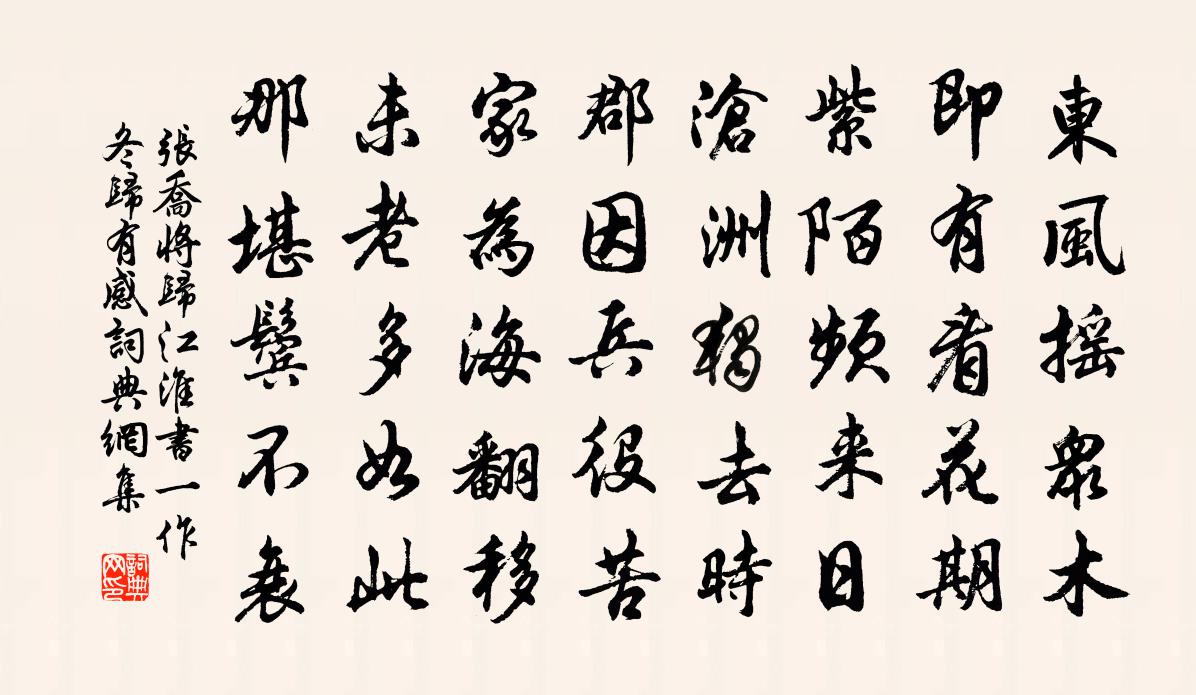 詩詞名句歷史字典書法欣賞書法字典國語詞典說文解字康熙字典古漢語字典標 題 作 者 詩 句 將歸江淮書(一作冬歸有感)作者:張喬 朝代:唐代原文東風搖眾木,即有看花期。紫陌頻來日,滄洲獨去時。郡因兵役苦,家為海翻移。未老多如此,那堪鬢不衰。詩詞問答問:《將歸江淮書(一作冬歸有感)》的作者是誰?答:張喬問:該詩寫於哪個朝代?答:唐代書法欣賞將歸江淮書(一作冬歸有感)書法作品注釋全唐詩:卷638-55詩詞推薦依韻答青州富資政見寄范仲淹〔宋代〕樞府當年日輦襄,隱然一柱在明堂。親逢英主開前席,力與皇家正舊章。直道豈求安富貴,純誠惟欲助清光。龔黃寧公新拜首座因贈王禹偁〔宋代〕著書新奏御,優詔及禪扉。首座名雖貴,家山老未歸。磬聲寒繞枕,塔影靜侵衣。終憶西湖上,秋風白鳥飛。丁酉道道暮春陳造〔宋代〕去家如昨日,節物轉頭非。風處綠自舞,雨餘紅頓稀。野橋平水過,村路躡花歸。趁得酴醾在,箏琶拂舊衣。問淵明蘇軾〔宋代〕子知神非形,何復異人天。豈惟三才中,所在靡不然。我引而高之,則為日星懸。我散而卑之,寧非山與川。三皇次回仙韻文及翁〔宋代〕形棲枯槁元寂寞,跡寄榴皮特有餘。欲喚回仙談往事,直須癭相認天書。琴曲歌辭。湘夫人鄒紹先〔唐代〕楓葉下秋渚,二妃愁渡湘。疑山空杳藹,何處望君王。日落水雲里,悠悠心自傷。紹興別廟樂歌五首真宗〔宋代〕曾沙表慶,正位椒庭。徽音杳邈,宮台科刑。虔修祀事,清酌惟聲。縮以包芳,昭格明靈。柳梢青(餞別蔣德施、粟子求諸公)張孝祥〔宋代〕重陽時節。滿城風雨,更催行色。隴樹寒輕,海山秋老,清愁如織。一杯莫惜留連,我亦是、天涯倦客。後夜相思和子厚弟冬至即事王之道〔宋代〕天容如鑒地無塵,陽氣依稀動紫荊。日晷漸長端可愛,霜華增重不勝清。題南岩釋行海〔宋代〕昔年此地屬龍門,兩壁崖崖禹鑿痕。泉墮半空翻作雨,天藏一竅狹於村。蘿煙尚瘞仙人骨,磯月 * 釣客魂。岩下次令衿游玉壺高詠十絕對換席羲叟〔宋代〕絕景頻因警句夸,莫傳俚耳便紛拿。須知味道耽岩穴,志意難將富貴加。寄題廣州田諫議頤堂余靖〔宋代〕退食公堂暇,應無俗慮侵。簾開雙燕外,吏散百花陰。海域逍遙境,榮途淡泊心。政成先養正,惠愛及民深。曲倚劉子翬〔宋代〕器成因揉木,偃月勢相侔。適用形雖巧,論材性本柔。倦憑觀秘籙,趺坐接禪流。莫效愚溪戮,時多曲似鉤。送鄧秘丞知德安縣余靖〔宋代〕里閈俊游心久降,越台成政俗敦龐。香爐山下重為縣,閶闔風高還渡江。且喜恩威長及物,莫嫌功業未經邦。公齋謝陳僉惠紅綠柿劉宰〔宋代〕紅綠分佳果,丹青讓好辭。遙憐霜落葉,岸幘坐題詩。用蜀行送徐隆慶守金州洪咨夔〔宋代〕兵家如弈棋,局局勢不同。漢王引兵故道出襲雍,武侯率師祁山搖關中。何曾踏陳跡,乃欲收新功。中興用蜀九十玩丹砂 贈朱先生馬鈺〔元代〕一飽馨香野菜羹。臨溪對竹自吟賡。不妨斡運甲和庚。何是道人真活計,日當卓午打三更。連雲和月一齊耕。翠羽吟蔣捷〔宋代〕紺露濃。映素空。樓觀峭玲瓏。粉凍霽英,冷光搖盪古青松。半規黃昏淡月,梅氣山影溟濛。有麗人、步依修竹,寄千乘劉殿丞求字人編祖無擇〔宋代〕千乘劉夫子,高名繼謫仙。從居庇身邑,已著字人編。才入鍾嶸口,文期鄭氏箋。何當求副本,長願播匏弦。獨立陸游〔宋代〕上書不上登封書,乘車但乘下澤車。夕陽獨立衡門外,閒看村童學釣魚。名句推薦裊裊城邊柳,青青陌上桑。張仲素《春閨思》 寂寂柴門村落里,也教插柳記年華。趙鼎《寒食》 畫圖省識春風面,環珮空歸夜月魂。杜甫《詠懷古蹟五首·其三》 別來春半,觸目柔腸斷。李煜《清平樂·別來春半》 欲買桂花同載酒,終不似,少年游。劉過《唐多令·蘆葉滿汀洲》 秋霜欲下手先知,燈底裁縫剪刀冷。白居易《空閨怨》 兵出無名,事故不成班固《漢書·紀·高帝紀上》 橫笛聞聲不見人,紅旗直上天山雪。陳羽《從軍行》 須作一生拚,盡君今日歡。牛嶠《菩薩蠻·玉爐冰簟鴛鴦錦》 巧言令色,鮮矣仁。孔子弟子《論語·學而篇》