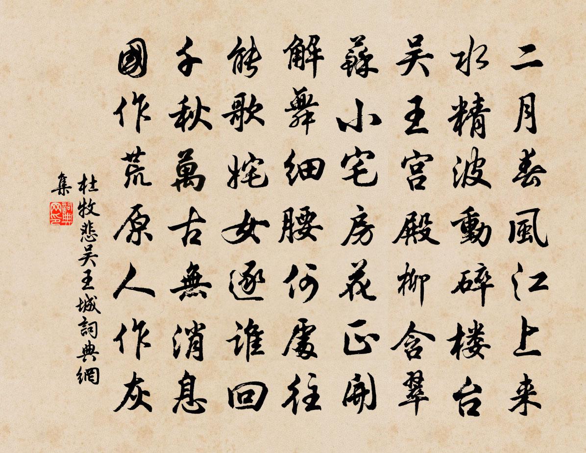 詩詞名句歷史字典書法欣賞書法字典國語詞典說文解字康熙字典古漢語字典標 題 作 者 詩 句 悲吳王城作者:杜牧 朝代:唐代悲吳王城原文二月春風江上來,水精波動碎樓台。吳王宮殿柳含翠,蘇小宅房花正開。解舞細腰何處往?能歌奼女逐誰回?千秋萬古無訊息,國作荒原人作灰。詩詞問答問:悲吳王城的作者是誰?答:杜牧問:悲吳王城寫於哪個朝代?答:唐代問:悲吳王城是什麼體裁?答:七律問:杜牧的名句有哪些?答:杜牧名句大全杜牧悲吳王城書法欣賞悲吳王城書法作品詩詞推薦與生公游石窟山張九齡〔唐代〕探秘孰雲遠,忘懷復爾同。日尋高深意,宛是神仙中。躋險構靈室,詭制非人功。潛洞黝無底,殊庭忽似夢。豈如六州歌頭辛棄疾〔宋代〕西湖萬頃,樓觀矗千門。春風路,紅堆錦,翠連雲。俯層軒。風月都無際,盪空藹,開絕境,雲夢澤,饒 * ,不和趙忠州見寄陳文蔚〔宋代〕道義雖同趣,窮通奈兩管。蜀閩歌召杜,莘野樂唐虞。世上風波惡,胸中矛盾無。交情歲寒見,故我即今吾。送林伯農還鹿角山敖陶孫〔宋代〕今我不樂游四方,夙昔已具浮海航。十年點化鷗心性,一生正坐虎文章。海山未必盡佳處,往與蜑子收漁粱。夢中照君辭釋智圓〔宋代〕昭君停車淚暫止,為把功名奏天子。靜得胡塵唯妾身,漢家文武合羞死。愛秋釋文珦〔宋代〕宋玉悲秋我愛秋,清秋行樂勝春遊。林疎盡見山中石,更有寒泉帶石流。雜詠一百首李廣劉克莊〔宋代〕飛將無時命,庸奴有戰勛。誰憐老衛尉,身屬大將軍。邀花伴(自注,時在朔方)孟郊〔唐代〕邊地春不足,十里見一花。及時須遨遊,日暮饒風沙。偈頌一百零一首釋慧性〔宋代〕雲收天際,杲日當空。坐立儼然,如何通信。自是不歸歸便得,五湖煙浪有誰爭。登城隍廟張耒〔宋代〕靈祠孤絕壓城頭,下瞰清濠一曲流。盡日風埃昏幾席,有時簫鼓祭春秋。西瞻太昊祠千樹,北望封君土一丘。旅客題太白五松書堂阜民〔宋代〕江氛朝暮半晴陰,紺宇飛甍接翠岑。手摘匏瓜曾未遍,身從鷗鷺得相尋。千年舞袖雲崖冷,幾度桃花春水深。猶有滿庭芳(叔父慶宅並章服代作)史浩〔宋代〕烘錦花堤,鋪綿柳巷,曉來膏雨初晴。畫堂初建,碧沼映朱楹。最好芙蓉繡褥,交輝敞、孔雀金屏。那堪更,華裾漓之水曾豐〔宋代〕漓之水浮兮,粗資以汰。漓之水激兮,頑資以淬。漓之水清兮,垢資以灑。漓之水潤兮,槁資以溉。送盧端公歸台盧校書之夏縣羅隱〔唐代〕綿綿堤草拂征輪,龍虎俱辭楚水濱。只見勝之為御史,不知梅福是仙人。地推八米源流盛,才笑三張事業貧。一種早起即事薛嵎〔宋代〕隔水鐘聲枕上聞,城中人事已紛紛。開門放鶴溪邊去,衝破閒階一片雲。安樂公主移入新宅侍宴應制宗楚客〔唐代〕星橋他日創,仙榜此時開。馬向鋪錢埒,簫聞弄玉台。人同衛叔美,客似長卿才。借問游天漢,誰能取石回。王大卿輓詞樓鑰〔宋代〕老去王摩詰,歸來道更全。賸添天美祿,真得地行仙。日欲增三徑,君胡欠百年。桃源不無路,重上慘風煙。寺居寄簡長釋懷古〔宋代〕雪苑東山寺,山深少往還。紅塵無夢想,白日自安間。杖履苔花上,香燈樹影間。何須更飛錫,歸隱沃洲山。如夢令 蒙友惠詞王哲〔元代〕明月古今長有。怎奈華宗海口。黑窟裡頭居。黯不分夜晝。吾友。吾友。問你如何下手。次韻鄉侯計院二首劉克莊〔宋代〕請老皆曾接典型,鵝湖一輩亦豪英。晚持師說尤堅壘,不怕兵家會斫營。晴色極佳宜歲事,郊行因好訪民情。朝家名句推薦誠者,非自成己而已也。所以成物也。成己仁也。成物知也。性之德也,合外內之道也。故時措之宜也。子思《中庸·第二十五章》 長條短葉翠濛濛,才過西風,又過東風。夏完淳《一剪梅·詠柳》 壯年何事憔悴,華發改朱顏。蘇舜欽《水調歌頭·滄浪亭》 美人自刎烏江岸,戰火曾燒赤壁山,將軍空老玉門關。張可久《賣花聲·懷古》 懷春情不斷,猶帶相思舊子。吳文英《丁香結·夷則商秋日海棠》 客從遠方來,遺我雙鯉魚。佚名《飲馬長城窟行》 日暮長江里,相邀歸渡頭。儲光羲《江南曲四首》 日永如年愁難度,高城回首,暮雲遮盡,目斷人何處惠洪《青玉案·絲槐煙柳長亭路》 秋風蕭瑟天氣涼,草木搖落露為霜,群燕辭歸鵠南翔。曹丕《燕歌行二首·其一》 茅檐低小,溪上青青草。辛棄疾《清平樂·村居》