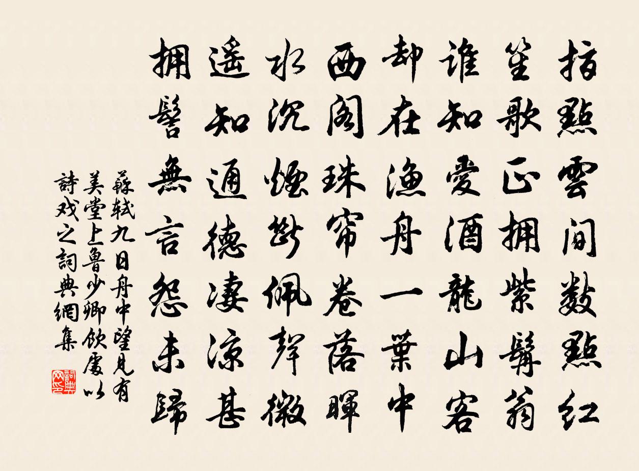 指點雲間數點紅,笙歌正擁紫髯翁。誰知愛酒龍山客,卻在漁舟一葉中。