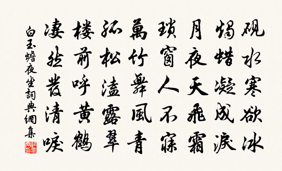 詩詞名句歷史字典書法欣賞書法字典國語詞典說文解字康熙字典古漢語字典標 題 作 者 詩 句 夜坐作者:白玉蟾 朝代:宋代夜坐原文硯水寒欲冰,燭蠟凝成淚。月夜天飛霜,瑣窗人不寐。萬竹舞風青,孤松溘露翠。樓前呼黃鶴,悽然發清唳。詩詞問答問:夜坐的作者是誰?答:白玉蟾問:夜坐寫於哪個朝代?答:宋代問:夜坐是什麼體裁?答:五古白玉蟾夜坐書法欣賞夜坐書法作品詩詞推薦送芍藥葉翥〔宋代〕枌社光榮晝錦歸,新移紅式著花時。殷勤折贈難虛擲,要向詩翁覓好詩。和梁守錢諸貢士林季仲〔宋代〕右文逢新地,首善自神京。延及吳中士。威稱洛下英。我邦雖僻陋,此學號專精。耆舊風流在,山川氣象新。元侯南歌子(二之二)賀鑄〔宋代〕心蹙黃金縷,梢垂白玉團。孤芳不怕雪霜寒。先向百花頭上、探春□。傍水添新韻,橫牆露粉顏。夜來和月起憑闌題溪橋雪月圖陳造〔宋代〕雪野無人訪夜闌,冰壺絕景畫中看。橋邊覺欠梅枝在,姑射嫦娥各耐寒。臨江仙(席上贈張建康)蘇庠〔宋代〕本是白萍洲畔客,虎符臥鎮江城。歸來猶得趁鷗盟。柳絲搖曉市,杜若遍芳汀。莫惜飛觴仍墮幘,柳邊依約鶯聲。尋梅花尚未有開者晁公溯〔宋代〕問訊溪頭樹,如何殊未春。亦應心老大,不逐世陳新。沁園春 贈損庵人靜李道純〔元代〕九轉工夫,三元造化,百日立基。便打撲精神,存決定志,掀翻妄幻,絕斷狐疑。剔起眉毛,放開心地,物物頭頭題龍泉寺絕頂方乾〔唐代〕未明先見海底日,良久遠雞方報晨。古樹含風長帶雨,寒岩四月始知春。中天氣爽星河近,下界時豐雷雨勻。前後青玉案 壽趙方塘學士五月五日程文海〔元代〕昌陽初薦長生醑。又好日、逢重五。綠鬢神仙家玉署。每年今日,彩鸞齊駕,排日歡初度。今年天上恩榮異。道壽勸行樂白居易〔唐代〕少年信美何曾久,春日雖遲不再中。歡笑勝愁歌勝哭,請君莫道等頭空。觀三王吟邵雍〔宋代〕一片中原萬里餘,殆非孱德所宜居。夏商正朔猶能布,湯武干戈未便驅。澤火有名方受革,水天無應不成需。詳知歌莎衣道人〔宋代〕胡孫死,鬧啾啾,也須還我一百州。【越調】天淨沙_孤山雪夜淡張可久〔元代〕孤山雪夜淡妝人在羅浮,黃昏月上西湖,翠袖翩翩起舞。倚闌索句,雪中樹老山孤。湖上送別紅蕉隱隱窗紗,朱簾吳道子華清宮圖朱翌〔宋代〕霜清十月天無風,行宮縹緲祥雲中。重重繡嶺光相通,莊嚴具足無遺功。泉鳴三湯春蒙蒙,合歡皂莢雙垂紅。人間宮詞宋白〔宋代〕水殿東西夾翠樓,春乘步輦過瀛洲。赭袍如日花如錦,一半宮人盡裡頭。景定初元即事十首劉克莊〔宋代〕糲食憂民瘠,茅廬念士寒。一生憐此老,錯把兩眉攢。舫齋王孝嚴〔宋代〕我本湖漘一漫郎,生來住處波茫茫。時尋畫舸破煙水,菰蒲滿路荷花香。一川窈窕詫紅蓼,兩岸蘆葦明秋霜。船頭東曾梅坡二首蒲壽宬〔宋代〕靡靡秋已駛,眇焉幽思殷。美人百尺樓,修帽千丈雲。白駒古難縶,寒蛩今畏聞。得酒且共隱,莫惑紙上文。北平家傳成馬廷鸞〔宋代〕三百年間事屢危,降之人傑豈中衰。巍巍祖烈將千歲,赫赫元功彼一時。起義堂碑雲漢麗,凌煙閣像日星垂。藏山官居二首陳造〔宋代〕磔磔初鳴曉,通通已報衙。拙勤知待旦,欺紿未停撾。漫役鄉園夢,只添老眼花。屈信庸敢計,斗祿倚生涯。名句推薦憑君莫話封侯事,一將功成萬骨枯。曹松《己亥歲感事》 小男供餌婦搓絲,溢榼香醪倒接罹。李郢《南池》 土膏欲動雨頻催,萬草千花一餉開;范成大《春日田園雜興》 寂歷秋江漁火稀,起看殘月映林微。湯顯祖《江宿》 雪滿山中高士臥,月明林下美人來。高啟《詠梅九首》 燕子飛來窺畫棟,玉鉤垂下簾旌。歐陽修《臨江仙·柳外輕雷池上雨》 燕語如傷舊國春,宮花一落已成塵。李益《隋宮燕》 疾雷不及塞耳,疾霆不暇掩目。劉安及其門客《淮南子·兵略訓》 江帶峨眉雪,川橫三峽流。李白《經亂離後天恩流夜郎憶舊遊書懷贈江夏韋太守良宰》 綠池落盡紅蕖卻,荷葉猶開最小錢。楊萬里《秋涼晚步》