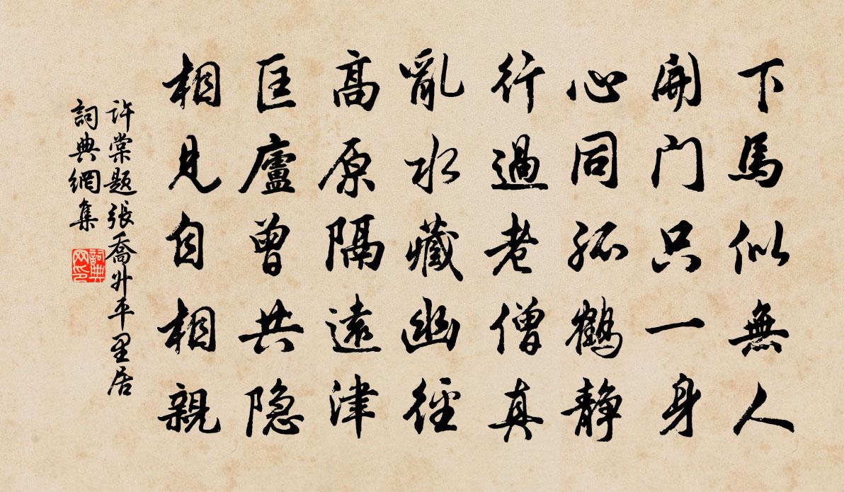 詩詞名句歷史字典書法欣賞書法字典國語詞典說文解字康熙字典古漢語字典標 題 作 者 詩 句 題張喬昇平里居作者:許棠 朝代:唐代題張喬昇平里居原文下馬似無人,開門只一身。心同孤鶴靜,行過老僧真。亂水藏幽徑,高原隔遠津。匡廬曾共隱,相見自相親。詩詞問答問:題張喬昇平里居的作者是誰?答:許棠問:題張喬昇平里居寫於哪個朝代?答:唐代問:題張喬昇平里居是什麼體裁?答:五律許棠題張喬昇平里居書法欣賞題張喬昇平里居書法作品注釋全唐詩:卷603-29詩詞推薦句徐仲謀〔宋代〕羅列全如斗極星。贈妓兜娘滕宗諒〔宋代〕十載芳洲采白苹,移舟弄水賞青春。當時自倚青春力,不信東風解誤人。宮詞一百首岳珂〔宋代〕池上繁紅心曙霞,喧天簫吹教坊家。龍舟近晚傳回輦,催進姚黃一朵花。新雁黃庚〔宋代〕來賓何太早,嘹嚦過南樓。數點乍離塞。一聲初報秋。行行驚客眼,字字寫鄉愁。仗節人何在,帛書能寄不。謝師厚歸南陽效阮步兵梅堯臣〔宋代〕一日復一朝,一暮復一旦。與子相經過,少會不言散。我心終未極,歲月忽雲晏。嘶馬思長道,孤鳥逐前伴。駕言齊天樂(題滕王閣)龍紫蓬〔宋代〕雨簾雲棟重尋處,青紅半空飛去。檻影侵鷗,檐光送雁,搖盪秋容千里。歌珠舞翠。怎禁得無情,一江流水。可是除歙州途中寄座主王侍郎盧肇〔唐代〕忽忝專城奉六條,自憐出谷屢遷喬。驅車雖道還家近,捧日惟愁去國遙。朱戶昨經新棨戟,風帆常覺戀簞瓢。江天早起偶成文天祥〔宋代〕澹澹池光曙,沉沉野色秋。片雲生北舍,只雁過南樓。有見皆成趣,無言總是愁。芭蕉夜來水,嚥罷自搔頭。孚舟亭新成賦十絕方回〔宋代〕南北東西四面看,舸軒雖窄自心寬。永無金馬門邊夢,豈有黃牛峽里灘。雨過壽岡先生趙蕃〔宋代〕煩濁不能勝,自知為雨候。俄然落疏疏,頗恨殊不驟。款門執戟家,竹樹密以覆。書幃與書帙,晚靜乃移晝。人高答杜如箎馮時行〔宋代〕迂疏百試百無長,身世從教墮渺茫。老得雲山真不惡,拙憑草樹更深藏。三杯且共逢迎酒,一瓣誰薰知見香。便肯彈琴司馬扎〔唐代〕涼室無外響,空桑七弦分。所彈非新聲,俗耳安肯聞。月落未終曲,暗中泣湘君。如傳我心苦,千里蒼梧雲。春日田園雜興許元發〔宋代〕片雲豈是出山時,曾被東風誤一吹。歸意不煩啼鴂動,閒情只許落花知。桑麻窮巷扉長掩,煙火空林黍自炊。粟里小溪至新田四首楊萬里〔宋代〕只愛孤峰惹寸雲,忽驚頭上雨翻盆。北來南去緣何事,路上君看屐子痕。感舊陸游〔宋代〕我思杜陵叟,處處有遺蹤。錦里瞻祠柏,綿州吊海棕。蹉跎悲櫪驥,感會失雲龍。生世後斯士,吾將安所從?鴛鴦湖棹歌 之十五朱彝尊〔清代〕鴨餛飩小漉微鹽,雪後壚頭酒價廉。聽說河豚新入市,蔞蒿荻筍急須拈。浣溪沙元好問〔金代〕芳草垂楊長樂坡。兩行紅粉一聲歌。淋漓襟袖酒痕多。夢裡翠翹驚墮枕,愁邊羅襪見凌波。春寒春瘦夜如何。寄李鶴田汪元量〔宋代〕文江別後又三年,別後三年詩幾篇。老去莫思身外事,命窮甘作飲中仙。天陰雨溼龍歸海,雲淡風輕鶴在田。回首南遷途中作七首途中偶懷吳融〔唐代〕無路能酬國士恩,短亭寂寂到黃昏。迴腸一寸危如線,賴得商山未有猿。發建康文天祥〔宋代〕賞心亭下路,拍手唱吾歌。樓外梁時塔,城中秦氏河。江山如夢耳,天地柰愁何。回首清溪曲,長江一雁過。名句推薦二十餘年如一夢,此身雖在堪驚。陳與義《臨江仙·夜登小閣憶洛中舊遊》 命室攜童弱,良日登遠遊陶淵明《酬劉柴桑》 細讀離騷還痛飲,飽看修竹何妨肉。辛棄疾《滿江紅·山居即事》 吹燈窗更明,月照一天雪。袁枚《十二月十五夜》 明犯強漢者,雖遠必誅。班固《漢書·傳·傅常鄭甘陳段傳》 回鞭指長安,西日落秦關。李白《登敬亭北二小山余時送客逢崔侍御並登此地》 山中相送罷,日暮掩柴扉。王維《送別 / 山中送別 / 送友》 無冥冥之志者,無昭昭之明;無惛惛之事者,無赫赫之功。荀子《荀子·勸學》 手如柔荑,膚如凝脂佚名《碩人》 我愛山中夏,空冥花雨下。元鵬《山中四詠》