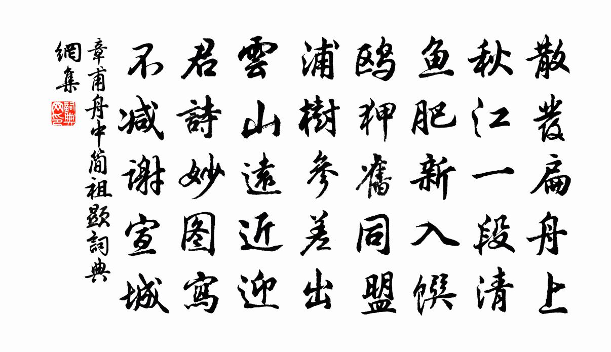詩詞名句歷史字典書法欣賞書法字典國語詞典說文解字康熙字典古漢語字典標 題 作 者 詩 句 舟中簡祖顯作者:章甫 朝代:宋代舟中簡祖顯原文散發扁舟上,秋江一段清。魚肥新入饌,鷗狎舊同盟。浦樹參差出,雲山遠近迎。君詩妙圖寫,不減謝宣城。詩詞問答問:舟中簡祖顯的作者是誰?答:章甫問:舟中簡祖顯寫於哪個朝代?答:宋代章甫舟中簡祖顯書法欣賞舟中簡祖顯書法作品詩詞推薦贈蕭山彭少府方乾〔唐代〕作尉孜孜更寒苦,操心至癖不為清。雖將劍鶴支殘債,猶有歌篇取盛名。盡擬勤求為弟子,皆將疑義問先生。與君老鶴嘆賀鑄〔宋代〕華表華表歸來乎,出無車,食無魚。懿公之遇難再圖,卑棲俛啄同群雛。誰謂嵇氏子不孤,強顏市井交屠沽,巨源感白蓮花白居易〔唐代〕白白芙蓉花,本生吳江濆。不與紅者雜,色類自區分。誰移爾至此,姑蘇白使君。初來苦憔悴,久乃芳氛氳。月月贊佛眼和尚釋道行〔宋代〕因我得禮你,玄沙出窠臼,龍門與薦燈後。咄!相和歌辭。襄陽曲二首崔國輔〔唐代〕蕙草嬌紅萼,時光舞碧雞。城中美年少,相見白銅鞮。少年襄陽地,來往襄陽城。城中輕薄子,知妾解秦箏。奉使契丹二十八首其四古北口道中呈同事二首蘇轍〔宋代〕笑語相從正四人,不須嗟嘆久離群。及春煮菜過邊郡,賜火煎茶約細君。日暖山蹊冬未雪,寒生胡月夜無雲。明朝代邑士上趙百里劉宰〔宋代〕美矣吾邦此大夫,仁中有勇信今無。治侔東里興鄉校,政壓西門送女巫。謀廣生員來共學,力排淫祀警群愚。一陶少年游趙子發〔宋代〕曉山日薄半春陰。煙暖柳拖金。滿眼新晴,歌聲妝影,悠蕩碧雲心。閒庭客散人歸去,疏雨濕羅襟。樓閣濛濛,斷和李公擇赴歷下道中雜詠十二首其十一梁山洎蘇轍〔宋代〕花開南北一般紅,路過江淮萬里通。飛蓋靚妝迎客笑,鮮魚白酒醉船中。觀荷方岳〔宋代〕紅紅白白兩娉婷,一種風流各黃刑。紅亦非紅白非白,阿嬌微醉阿環醒。頌古三十三首釋師觀〔宋代〕香嚴上樹,住住住住。擬問如何,葛藤露布。雒縣輿人誦佚名〔唐代〕我有聖帝撫令君,遭暴昏椽惸寡紛。民戶流散日月曛,君去來兮惠我仁,百姓蘇矣見陽春。書嘆陸游〔宋代〕人生如春蠶,作繭自纏裹,一朝眉羽成,鑽破亦在我。少年不自珍,妄念然烈火,眼亂舞腰輕,心醉笑齒瑳。余齡東籬陸游〔宋代〕東籬深僻嬾衣裳,書卷縱橫雜藥囊。無吏徵租終日睡,得錢沽酒一春狂。新營茅舍軒窗靜,旋煮山蔬匕箸香。戲集記夢陳文蔚〔宋代〕夢裡分明記本極,覺來無語正心君。陰陽卻把量消長,且喜新來勝一分。次韻伯父工部見慶塵忝之什葛立方〔宋代〕江夏無雙舊姓黃,末科容我出寒鄉。人間學子垂垂老,天上丹枝恰恰芳。避地本安元結洞,擁書猶記贊公房。豈知偈頌二百零五首釋正覺〔宋代〕身里出門,門裡出身。白雲能作客,明月解隨人。客路朱繼芳〔宋代〕閨合空相憶,那知客路艱。背人前去鳥,迎面遠來山。夜泊孤燈悄,晨裝片月彎。猿聲不知處,杳杳白雲間。納火禮祀大辰十二首佚名〔宋代〕[圜鍾為宮]赫赫皇圖,炎炎火德。侈神之陽,奄有方國。粢盛既豈,俎豆有飶。於萬斯年,報祀無對。絕句二首贈月蓬道人過建安謁劉漕中書劉克莊〔宋代〕只有破裘禦寒色,遍將甜卦賣痴人。那知兩個非師弟,一是鍾離一洞賓。名句推薦用貧求富,農不如工,工不如商。司馬遷《史記·貨殖列傳》 滿衣血淚與塵埃,亂後還鄉亦可哀。高啟《送陳秀才還沙上省墓》 花前失卻遊春侶,獨自尋芳。馮延巳《採桑子·花前失卻遊春侶》 燕歸花謝,早因循、又過清明。納蘭性德《紅窗月·燕歸花謝》 丹陽城南秋海陰,丹陽城北楚雲深。王昌齡《芙蓉樓送辛漸二首》 暗教愁損蘭成,可憐夜夜關情張炎《清平樂·候蛩淒斷》 客子過壕追野馬,將軍韜箭射天狼。李夢陽《秋望》 爭奈愁來,一日卻為長賀鑄《行路難·縛虎手》 明日相思莫上樓,樓上多風雨。游次公《卜運算元·風雨送人來》 中軍置酒飲歸客,胡琴琵琶與羌笛。岑參《白雪歌送武判官歸京》