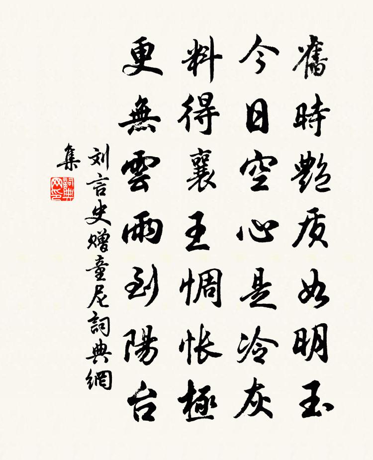 詩詞名句歷史字典書法欣賞書法字典國語詞典說文解字康熙字典古漢語字典標 題 作 者 詩 句 贈童尼作者:劉言史 朝代:唐代贈童尼原文舊時艷質如明玉,今日空心是冷灰。料得襄王惆悵極,更無雲雨到陽台。詩詞問答問:贈童尼的作者是誰?答:劉言史問:贈童尼寫於哪個朝代?答:唐代問:贈童尼是什麼體裁?答:七絕劉言史贈童尼書法欣賞贈童尼書法作品注釋全唐詩:卷468-34詩詞推薦釣台徐德輝〔宋代〕歸把灘頭舊釣竿,帝王只作故人看。此身合向丘林著,漢祚已如磐石安。流水雹表千古在,客星有影九天寒。到頭滿江紅張鎡〔宋代〕玉照梅開,三百樹、香雲同色。光搖動、一川銀浪,九霄珂月。幸遇勛華時世好,歡娛況是張燈夕。更不邀、名勝頌古一百二十一首釋宗杲〔宋代〕瞎驢一眾跳皆驚, * 那堪付與人。三要三玄俱喪盡,堂堂擺手出重城。送李蘊赴鄭州因獻盧郎中(亻叔)趙嘏〔唐代〕僕射陂西想到時,滿川晴色見旌旗。馬融閒臥笛聲遠,王粲醉吟樓影移。幾日賦詩秋水寺,經年起草白雲司。惟君賀筵占贈營妓楊汝士〔唐代〕郎君得意及青春,蜀國將軍又不貧。一曲高歌紅一匹,兩頭娘子謝夫人。南康郡牧陸肱郎中辟許棠先輩為郡從事,因有寄贈鄭谷〔唐代〕末路思前侶,猶為戀故巢。江山多勝境,賓主是貧交。飲舫閒依葦,琴堂雅結茅。夜清僧伴宿,水月在松梢。致仕後即事陸游〔宋代〕一生病鶴寄樊籠,此去鴻冥萬里空。未論蓴羹與羊酪,新粳要勝太倉紅。思家五首方回〔宋代〕世道駸駸似可咍,多年吾已似銜枚。品題已定門人叛,議論方公敵國來。瓦礫敢侔珠玉價,茅茨誰辦棟樑材。淵明偈頌四十二首釋祖先〔宋代〕世出世間希有事,顯發須還過量人。出沒卷舒驚世夢,蓬萊山色又重新。秋日苦雨和子厚弟韻王之道〔宋代〕煙郁濕薪費挑撥,可堪餘瀝濺如潑。吹霞弄日文縱工,正恐詩人類迂闊。屋角蕭蕭霜葉鳴,夜靜亂我糟床聲。詩成甲午出知漳州,晚發船龍山,暮宿桐廬二首楊萬里〔宋代〕道塗奔走不曾安,卻羨山家住得閒。記取還山安住日,更忘奔走道塗間。郊廟歌辭。享文敬太子廟樂章。亞獻終獻崔邠〔唐代〕醴齊泛尊彝,軒縣動乾戚。入室僾如在,升階虔所歷。奮疾合威容,定利舒皦繹。方崇廟貌禮,永被君恩錫。減字木蘭花仇遠〔宋代〕雞兒畫曲。處處箏鳴雨屋。十載重遊。柳外啼烏也怨秋。粉楹醉墨。燕去樓空人不識。醉踏花陰。錯認人家月下門寄靈隱惠明禪師釋重顯〔宋代〕海嶠生片雲,有時忽如蓋。不掛飛來峰,悠悠擬何待。汴京紀事二十首 其十八劉子翬〔宋代〕倉黃禁陌放飛戈,南去我稀北去多。自古胡沙埋皓齒,不堪重唱蓬蓬歌。句左偃〔唐代〕胡笳聞欲死,漢月望還生。日華離碧海,雲影散青霄。秘藏院丘葵〔宋代〕才入空門裹,塵心使欲拋。土花生石縫,野蔓上林梢。棟老蜂鑽穴,檐低雀結巢。僧中無賈島,得句自推敲。石竹花齊己〔唐代〕石竹花開照庭石,紅蘚自稟離宮色。一枝兩枝初笑風,猩猩血潑低低叢。常嗟世眼無真鑒,卻被丹青苦相陷。誰為閒中戲賦村落景物陸游〔宋代〕遊宦才能薄,還山日月長。買牛捐寶劍,取酒解金章。泉脈疏供啜,松肪煉按方。北窗貪兀傲,南陌喜彷徉。僧過立春郭印〔宋代〕頗恨東風巧入簾,不論朱戶與茅檐。青春處處為誰好,白髮年年空自嫌。市酒豈能供燕笑,官娃無復問穠纖。強隨名句推薦與朋友交遊,須將他們好處留心學來,方能受益王永彬《圍爐夜話·第二則》 父母教,須敬聽。父母責,須順承。李毓秀《弟子規·入則孝》 待浮花、浪蕊都盡,伴君幽獨。蘇軾《賀新郎·夏景》 不覺新涼似水,相思兩鬢如霜。劉辰翁《西江月·新秋寫興》 夢裡不知身是客,一晌貪歡。李煜《浪淘沙令·簾外雨潺潺》 謾道愁須殢酒,酒未醒、愁已先回秦觀《滿庭芳·碧水驚秋》 春近寒雖轉,梅舒雪尚飄。陰鏗《雪裡梅花詩》 路上有飢人,家中有剩飯。佚名《增廣賢文·上集》 非君子不可與語變。王通《中說·卷七·述史篇》 治國無法則亂,守法而弗變則悖,悖亂不可以持國。呂不韋《呂氏春秋·覽·慎大覽》