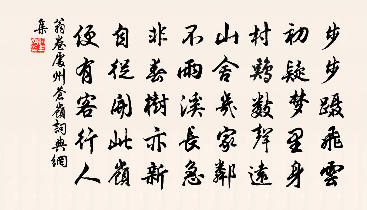詩詞名句歷史字典書法欣賞書法字典國語詞典說文解字康熙字典古漢語字典標 題 作 者 詩 句 處州蒼嶺作者:翁卷 朝代:宋代處州蒼嶺原文步步躡飛雲,初疑夢裡身。村雞數聲遠,山舍幾家鄰。不雨溪長急,非春樹亦新。自從開此嶺,便有客行人。詩詞問答問:處州蒼嶺的作者是誰?答:翁卷問:處州蒼嶺寫於哪個朝代?答:宋代翁卷處州蒼嶺書法欣賞處州蒼嶺書法作品詩詞推薦賦將軍木王執禮〔宋代〕脫急曾聞匿異人,論功僅得號將軍。長身已逐雲煙去,賴有孫枝記舊勛。奉簡湯子和晁公溯〔宋代〕衛尉女公子,始生在開封。君來謁衛尉,見之文褓中。卻後十五載,我乃臥廂東。與君初會面,修髯郁垂胸。席間郡齋秋夕張詠〔宋代〕久負嵩雲約,年來半白頭。風驚落葉夕,雨滴戍城秋。調古將誰合,心狂謾自愁。遲回不能寐,重起憑危樓。一剪梅 述懷贈程老先生尹志平〔元代〕學道無成天不慳。虛名濫占,實得應難。從今志氣更重加,東望都休,不下西山。深謝知交忻崞間。四時不闕,助過左伯桃羊角哀墓周邦彥〔宋代〕古交久淪喪,末世尤反覆。谷風歌焚輪,黃鳥譬伐木。永懷羊與左,重義逾血屬。客行乾楚王,冬雪無斗粟。傾糧再用前韻寄莘老蘇軾〔宋代〕君不見夷甫開三窟,不如長康號痴絕。痴人自得終天年,智士死智罪莫雪。困窮誰要卿料理,舉頭看山笏拄頰。野三月十二日晚雨因取淵明詩微雨洗高林清飈矯滕岑〔宋代〕老人見桃花,悟者有靈雲。我見亦有悟,花前飲玉醺。可憐南北家,論說事紛紜。為問參老禪,何如參面君。次韻員子春遊馬溪二首李新〔宋代〕樹影陰蒙逕,雲衣淺撲門。禪心無冷暖,客意自晨昏。澗水鳴孬破,山花野血噴。再來何薄暮,騶從觸狐蹲。又七首其五奉幣楊億〔宋代〕醴齊良潔,有牲斯純。大采玄冕,乃昭其文。王宮定位,粢盛苾芬。民事以敘,玄德升聞。甥館五首許月卿〔宋代〕月色真圖畫,風聲古瑟琴。月風天地職,風月聖賢心。竹砌水如璧,梧罔朋蓋簪。不須聯句得,天籟竹梧吟。禪人並化主寫真求贊釋正覺〔宋代〕如珪如璧,雕文喪德。如雲如石,堅潤是式。蒼竹無心歲寒色,老松有傲霜雪力。照破諸緣兮,兩眼如漆。挽顏尚書二首劉克莊〔宋代〕憶昨端平際,煩公尹帝京。解弦三輔理,免胄一軍驚。舉國言尊勇,無人議敞輕。如何開濟手,寂寞向佳城。送呂興元李新〔宋代〕梯天懸閣馬行空,旌旆悠悠照谷紅。靈鳳陰寒春過晚,萬山猶有牡丹風。洞庭魚李商隱〔唐代〕洞庭魚可拾,不假更垂罾。鬧若雨前蟻,多於秋後蠅。豈思鱗作簟,仍計腹為燈。浩蕩天池路,翱翔欲化鵬。次韻楊文甫監茶名山新建學橋二首李流謙〔宋代〕高棟浮空插萬甍,來游誰是魯諸生。規模要識鳴弦意,土苴猶水擊柱爭。馴壠雉驕佳氣象,集林鴞惡好音聲。白頭初到蜀州寄成都諸友陸游〔宋代〕流落天涯鬢欲絲,年來用短始能奇。無材藉作長閒地,有懣留為劇飲資。萬里不通京洛夢,一春最負牡丹時。襞牋呂不韋徐鈞〔宋代〕謀立儲君誰孕姬,巨商販鬻巧觀時。十年富貴隨輕覆,奇貨元來禍更奇。進德陸游〔宋代〕進德工夫在日新,正如更歷自知津。迷時誤認毒為藥,定後始知天勝人。四壁不妨身落魄,萬夫誰敵膽輪囷?遺經東池戴復古〔宋代〕來尋吾祖隱居處,裊裊春風吹酒旗。手把梅花寄愁絕,東池只是舊東池。和蔣御帶薦合中三偈釋師觀〔宋代〕唯憑者個薦嚴妻,借路經過般若池。撒手那邊無避處,大洋海里火星飛。名句推薦玉骨那愁瘴霧,冰姿自有仙風。蘇軾《西江月·梅花》 聖人忘情,最下不及情;情之所鍾,正在我輩。劉義慶《世說新語·傷逝》 入門休問榮枯事,且看容顏便得知。佚名《增廣賢文·上集》 烏鵲倦棲,魚龍驚起,星斗掛垂楊。陳亮《一叢花·溪堂玩月作》 攜手藕花湖上路。一霎黃梅細雨。朱淑真《清平樂·夏日游湖》 歲暮遠為客,邊隅還用兵。杜甫《歲暮》 家童掃蘿徑,昨與故人期。錢起《谷口書齋寄楊補闕》 明朝甑復空,母子相持哭。陸游《十月二十八日風雨大作》 滿隄芳草不成歸,斜日畫橋煙水冷。吳翌鳳《玉樓春·空園數日無芳信》 採得百花成蜜後,為誰辛苦為誰甜。羅隱《蜂》