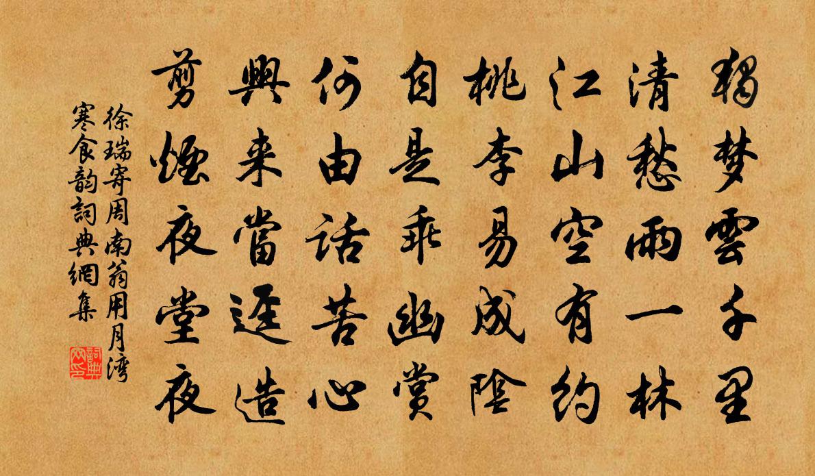 詩詞名句歷史字典書法欣賞書法字典國語詞典說文解字康熙字典古漢語字典標 題 作 者 詩 句 寄周南翁用月灣寒食韻作者:徐瑞 朝代:宋代寄周南翁用月灣寒食韻原文獨夢雲千里,清愁雨一林。江山空有約,桃李易成陰。自是乖幽賞,何由話苦心。興來當逕造,剪煙夜堂夜。詩詞問答問:寄周南翁用月灣寒食韻的作者是誰?答:徐瑞問:寄周南翁用月灣寒食韻寫於哪個朝代?答:宋代徐瑞寄周南翁用月灣寒食韻書法欣賞寄周南翁用月灣寒食韻書法作品詩詞推薦頌一百則釋重顯〔宋代〕遍身是,通身是,拈來猶較十萬里。展翅崩騰六合雲,搏風鼓盪四溟水。是何埃塏兮忽生,那箇毫釐兮未止。君不石榴楊萬里〔宋代〕深著紅藍染暑裳,琢成紋玳敵秋霜。半含笑里清冰齒,忽綻吟邊古錦囊。霧縠作房珠作骨,水精為醴玉為漿。劉郎呈南安孟使君周南〔宋代〕使君四十銅虎符,一矢曾識金僕姑。唐三百年進士舉,不再鼓之終非夫。西風籠槐桂扶疎,筆勢洶如濤江驅。知君食菜張耒〔宋代〕大雨困淋漓,小雨傷霢霈。哀哉南畝人,日夜塗手足。入倉無一粒,敢望祈報福。余功歸老圃,畦菜青滿目。長官壽廣東陶漕徐泳〔宋代〕曉了羅浮杳靄中,一琴一劍一枯筇。官清便是長生訣,謾把丹砂問葛洪。句張徽〔宋代〕雲蒸洞穴秋成雨,泉落庭除夏結冰。春日田園雜興感興吟〔宋代〕兒結衰衣婦浣紗,暖風疏雨趲桑麻。金桃接種連花蕊,紫竹稱根帶筍芽。椎鼓踏歌朝祭社,賣薪挑花晚回家。前村書江亭壁陳郁〔宋代〕人間風浪最傾危,君自深藏了不知。只恐隨流禹門去,又翻頭角露天池。玉樓春楊無咎〔宋代〕酒闌未放賓朋散。自拈冰芽教旋碾。調膏初喜玉成泥,濺沫共驚銀作線。已知於我情非淺。不必寧寧書碗面。滿嘗總司官餞董少卿曾協〔宋代〕蚤聞天詔下江津,元是君王自賞音。闊步穩登霄漢路,借留難副士民心。緩歌共有留連意,別酒休辭瀲灩斟。三節謝令學道詩張辭〔唐代〕何用梯媒向外求,長生只合內中修。莫言大道人難得,自是行心不到頭。宿吳興道中苕村鮑溶〔唐代〕浮客倦長道,秋深夜如年。久行惜日月,常起雞鳴前。夕計今日程,息車在苕川。霜中水南寺,金磬泠泠然。疇昔劉岩居士再和去年中秋見貽次韻姜特立〔宋代〕蒼茫雲海渺無津,玉戶初圓絕點塵。萬里共欣雲葉淨,一年爭看桂華新。狂吟定約六七友,低唱可無三兩人。今日五君詠向秀錢選〔宋代〕向秀甘淡薄,深心托毫素。探道好淵玄,觀書鄙章句。交呂既鴻軒,攀嵇亦鳳舉。流連河裡游,惻愴出陽賦。偈頌一百二十三首釋崇岳〔宋代〕有解有結,虛空釘橛。無解無結,咬著生鐵。二千年代錯流傳,天下衲曾無處雪。雪不雪,崖崩石裂。偶成周端臣〔宋代〕一灑斑斑小雨晴,杖藜隨意散幽情。不論城市山林地,才有梅花處便清。稽山道中陸游〔宋代〕文章事業初何有,鐘鼎山林本自同。昨暮釣魚天鏡北,今朝採藥石帆東。送唐德輿趙蕃〔宋代〕國朝唐與蘇,不數漢相如。繼彼二季後,當茲三世余。青雲曾給札,班鬢尚題輿。古義惟知學,時人或謂疏。鄭虔如夢令(壽茶)姚述堯〔宋代〕龍焙初分丹闕。玉果輕翻瓊屑。彩仗挹香風,攪起一甌春雪。清絕。清絕。更把獸煙頻爇。賦園中所有十首蘇轍〔宋代〕吾兄客關中,果羸施吾宇。兄雖未得還,我豈如婦女。呦呦感微物,涕泗若零雨。但愛果羸莖,屈曲上牆堵。朝見名句推薦江山如有待,花柳自無私。杜甫《後游》 人之忌,在好為人師。孟子《孟子·離婁章句上·第二十三節》 是數人之齒,而以為富。墨子《墨子·48章 公孟》 不恥不若人,何若人有?孟子《孟子·盡心章句上·第七節》 我見青山多嫵媚,料青山見我應如是。辛棄疾《賀新郎·甚矣吾衰矣》 但願人長久,千里共嬋娟。蘇軾《水調歌頭·丙辰中秋》 今日俸錢過十萬,與君營奠復營齋。元稹《遣悲懷三首·其一》 問君何能爾?心遠地自偏。陶淵明《飲酒·其五》 片雲天共遠,永夜月同孤。杜甫《江漢》 柳庭風靜人眠晝,晝眠人靜風庭柳。蘇軾《菩薩蠻·回文夏閨怨》