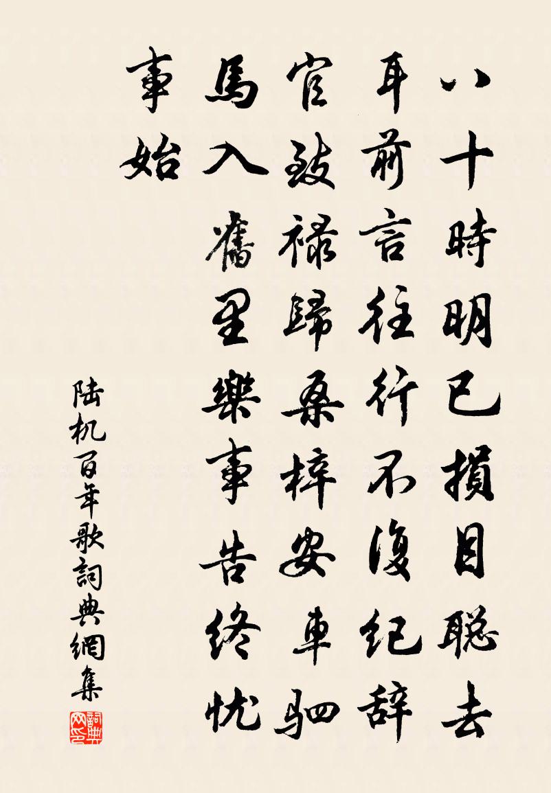 詩詞名句歷史字典書法欣賞書法字典國語詞典說文解字康熙字典古漢語字典標 題 作 者 詩 句 百年歌作者:陸機 朝代:魏晉百年歌原文八十時。明已損目聰去耳。前言往行不復紀。辭官致祿歸桑梓。安車駟馬入舊里。樂事告終憂事始。詩詞問答問:百年歌的作者是誰?答:陸機問:百年歌寫於哪個朝代?答:魏晉問:百年歌是什麼體裁?答:樂府陸機百年歌書法欣賞百年歌書法作品詩詞推薦和春睡廖行之〔宋代〕持底賞春晴,清眠自爽魂。據梧銷白日,高枕未黃昏。蝴蝶飛何樂,華胥夢可溫。周公應不遠,心事得深論。偈頌一百零二首釋慧遠〔宋代〕今朝九月初一,敗葉凋零滿室。缽盂高掛懸崖,拄杖依前靠壁。幾許溪山風月,且無遮個訊息。諸祖不解提擲,久長相思令/長相思譚意哥〔宋代〕舊燕初歸,梨花滿院,迤邐天氣融和。新晴巷陌,是處輕車駿馬,禊飲笙歌。舊賞人非,對佳時、一向樂少愁多。陸簿生日王炎〔宋代〕冬令始嚴肅,涉氣回晏溫。簾幃映瑞色,見此天上麟。蒙羽有再來,機雲定前身。清標入黃綬,胸次不受塵。洗玉野堂陸游〔宋代〕野堂蕭颯雪侵冠,歷盡人間行路難。病馬不收菸草暝,孤桐半落井床寒。長瓶濁酒猶堪醉,敗篋殘編更細看。此興偈頌三十六首釋如珙〔宋代〕三界心盡,即是涅槃。山花紅似錦,澗水湛如藍。晚步池上張鎡〔宋代〕藤杖徐穿竹徑涼,地寬那更水雲鄉。山明屋背髻鬟聳,蟬奏樹頭絲吹長。蓑笠釣船家自有,軒裳朝路夢俱忘。英雄畫山水圖答大愚荊浩〔唐代〕恣意縱橫掃,峰巒次第成。筆尖寒樹瘦,墨淡野雲輕。岩石噴泉窄,山根到水平。禪房時一展,兼稱苦空情。春懷衛宗武〔宋代〕時來桃李妍,春風乃知已。時去桃李萎,春華俱夢寐。芳菲氣不齊,一一理猶是。何如松與柏,無榮亦無悴。浮生百字令 為沈畫師題寫山樓韓奕〔元代〕軟紅塵里,愛君家、縹緲半空樓倚。曲檻外,江南江北,兩岸好山無際。日涌浮金,煙凝積翠,朝夕映窗幾。拋書六月二十七日望湖樓醉書五首其一蘇軾〔宋代〕黑雲翻墨未遮山,白雨跳珠亂入船。捲地風來忽吹散,望湖樓下水如天。晝寢白居易〔唐代〕坐整白單衣,起穿黃草屨。朝餐盥漱畢,徐下階前步。暑風微變候,晝刻漸加數。院靜地陰陰,鳥鳴新葉樹。獨行送陳逸之筠州晁補之〔宋代〕居貧百草春靃靡,製作舞雩春服美。愛君欲贈華韡韡,思君何處無芳卉。三年眼花秪欲眠,驚夢往往音跫然。單金同李著作縱題塵外上人院皎然〔唐代〕百緣唯有什公瓶,萬法但看一字經。從遣鳥喧心不動,任教香醉境常冥。蓮花天晝浮雲卷,貝葉宮春好月停。禪伴頌古十六首釋明辯〔宋代〕行主無人能賽,姐姐更是好手。騰身百尺竿頭,打個背翻筋斗。偈釋本〔宋代〕五峰家風,南北西東。要用便用,以橛釘空。高安公主輓歌二首李乂〔唐代〕湯沐三千賦,樓台十二重。銀爐稱貴幸,玉輦盛過逢。嬪則留中饋,娥輝沒下舂。平陽百歲後,歌舞為誰容。賓衛送堅上人歸杭州天竺寺清江〔唐代〕十年勞負笈,經論化中朝。流水知鄉近,和風惜別遙。雲山零夜雨,花岸上春潮。歸臥南天竺,禪心更寂寥。老學庵北窗雜書陸游〔宋代〕定交魚鳥欲忘形,獨岸綸巾坐草亭。不恨囊中無赤仄,且欣案上有黃庭。題元真觀屋壁二首蘇泂〔宋代〕琳宮無俗務,書卷得相親。樹影自知午,棋聲不見人。實為蕭爽地,暫得自由身。客至誰能接,應知懶是真。名句推薦富貴多憂,貧窮自在。佚名《增廣賢文·上集》 永憶江湖歸白髮,欲回天地入扁舟。李商隱《安定城樓》 鬧花深處層樓,畫簾半卷東風軟。陳亮《水龍吟·春恨》 六朝文物草連空,天淡雲閒今古同。杜牧《題宣州開元寺水閣閣下宛溪夾溪居人》 半夜倚喬松,不覺滿衣雪。孟郊《苦寒吟》 豆蔻連梢煎熟水,莫分茶。李清照《攤破浣溪沙·病起蕭蕭兩鬢華》 望廬思其人,入室想所歷。潘安《悼亡詩三首》 人誰無過?過而能改,善莫大焉。左丘明《左傳·宣公·宣公二年》 父兮生我,母兮鞠我。佚名《蓼莪》 寒夜客來茶當酒,竹爐湯沸火初紅。杜耒《寒夜》