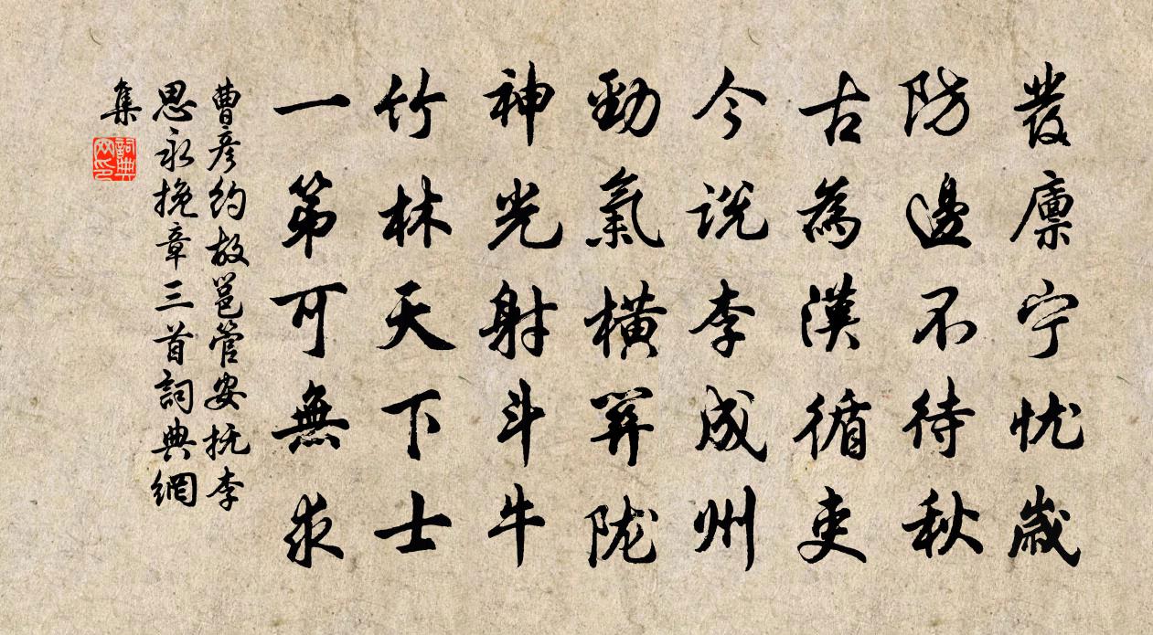 詩詞名句歷史字典書法欣賞書法字典國語詞典說文解字康熙字典古漢語字典標 題 作 者 詩 句 故邕管安撫李思永挽章三首作者:曹彥約 朝代:宋代故邕管安撫李思永挽章三首原文發廩寧憂歲,防邊不待秋。古為漢循吏,今說李成州。勁氣橫關隴,神光射鬥牛。竹林天下士,一第可無求。詩詞問答問:故邕管安撫李思永挽章三首的作者是誰?答:曹彥約問:故邕管安撫李思永挽章三首寫於哪個朝代?答:宋代曹彥約故邕管安撫李思永挽章三首書法欣賞故邕管安撫李思永挽章三首書法作品詩詞推薦記夢舒岳祥〔宋代〕春夢是耶蜚,終慚戀祿微。整冠騎馬出,欹枕聽雞回。食櫱風霜入,還丹志願違。未能忘習氣,安得寸心灰。泊雁汊寄主簿董嗣杲〔宋代〕窮通歸造化,蹤跡易參商。自畫新居樣,誰傳舊槀香。寒沙埋虎坂,晚燒起龍岡。相望風塵闊,愁懷不可量。月色許月卿〔宋代〕明月亦清哉,清風絕點埃。村童催睡去,野叟問禪來。樂事賞心夜,清風明月梅。夜深群籟靜,猿鶴莫相猜。詠竹生花趙崇嶓〔宋代〕竹老方作花,清氣應自結。結實成琅玕,中心換冰雪。世人弗肯食,欲獻終不屑。鳳凰在高岡,音響方節節。至保福精舍釋紹嵩〔宋代〕山水尋吳越,搜奇事轉新。松風知近寺,檣燕語留人。雨過閒田地,雲饒落日春。登臨獨無語,泉石自相親。崧嶺石泉陳文蔚〔宋代〕高城石井下成池,對自初分混沌時。雖小古今無涸溢,卻憐江海有盈虧。晚臥張耒〔宋代〕日落煩暑退,秋晴河漢明。微雲映天白,纖月過林清。獨臥誰晤語,幽懷殊未平。蕭蕭夜深冷,皓露滿前楹。何季皋司理故人也作詩見相勉意二首戴復古〔宋代〕梅花庾嶺外,別是一山川。那使民無訟,須知獄有冤。心常存正直,法不尚平反。于氏緣何事,陰功到子孫。客思吳錫疇〔宋代〕淹留為客久,蕭散與心違。妻病家緣廢,奴逃書問稀。雨荒招鶴逕,苔滑釣魚磯。愧爾汀頭鷺,滄波自在飛。巫山一段雲 登龍峰趙孟頫〔元代〕片月生危岫,殘霞拂翠桐。登龍峰下楚王宮。千古感遺蹤。柳色眉邊綠,花明臉上紅。欲尋靈積阻江風。離思杳無西際劉黻〔宋代〕一徑寒松老,因來采茯苓。水禽鳴杞澗,野鹿臥棕亭。瀑近雲根濕,仙遺石井靈。守廬青道者,不厭客頻經。題李愬畫像惠洪〔宋代〕淮陰帶北帶師廣帶武,其氣帶豈止吞項羽?君得李祐不敢誅,便知元濟在掌股。羊公德化行悍夫,臥鼓不戰良驕吳伯封書中敘去歲七夕之樂因寄李洪〔宋代〕去年此夜對芳樽,今日棲棲嘆失群。茅屋只餘燈伴我,酒爐應有月尋君。愁將從事青州去,風共禪師白足分。料想滿庭芳 寄趙宣慰平遠姚燧〔元代〕有北先寒,來時鴻雁,記經何地初霜。問渠鵝鸛,何苦上顏行。浩蕩煙波萬頃,怕誰去、爭許三湘。聊容與,誰求南陵留別段氏兄弟許渾〔唐代〕不知身老大,猶似舊時狂。為酒游山縣,留詩遍草堂。歸期秋未盡,離恨日偏長。更羨君兄弟,參差雁一行。安國置酒敬簡堂分韻得柳暗六春字張栻〔宋代〕公憎孔壬面,怪石乃寓目。夜堂發深藏,林立驚滿屋。我亦苦嗜此,一見下風伏。何當載而歸,妙策三十六。雪後黃樓寄負山居士陳師道〔宋代〕林廬煙不起,城郭歲將窮。雲日明松雪,溪山進冕風。人行圖畫裡,鳥度醉吟中。不盡山陰興,天留憶戴公。立春日大雪作代簡招友蕭元之〔宋代〕山意久辭臘,林根凍未消。清尊如有待,白髮正無聊。歲去梅花在,春初柳絮飄。同吟二三子,折簡可能招。和趙簿題席麻林居士小隱四韻五邁〔宋代〕繞園萬竿竹,奇壑千丈松。此物匹高士,坐羞桃李容。客至談世故,接之令人慵。相看兩不厭,晴昊倚高峰。失調名魏掞之〔宋代〕掛天師,撐著眼,直下覷。騎個生獰大艾虎。閒神浪鬼,辟惵他方遠方,大膽底,更敢來、上門下戶。名句推薦伊川桃李正芳新,寒食山中酒復春。宋之問《寒食還陸渾別業》 白日來深殿,青雲滿後塵杜甫《寄李十二白二十韻》 楚水辭魚窟,燕山到雁家裴說《塞上曲》 又有牆頭千葉桃,風動落花紅蔌蔌。元稹《連昌宮詞》 闌風伏雨催寒食,櫻桃一夜花狼藉。納蘭性德《菩薩蠻·闌風伏雨催寒食》 下謀上以術,術有窮者以力。來俊臣《羅織經·謀劃卷第九》 裊裊兮秋風,洞庭波兮木葉下。屈原《九歌·湘夫人》 桃花仙人種桃樹,又摘桃花換酒錢。唐寅《桃花庵歌》 兩岸月橋花半吐。紅透肌香,暗把遊人誤。真德秀《蝶戀花·兩岸月橋花半吐》 雉雊麥苗秀,蠶眠桑葉稀。王維《渭川田家》