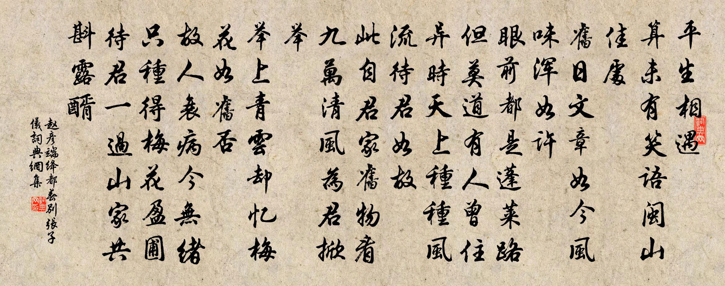 詩詞名句歷史字典書法欣賞書法字典國語詞典說文解字康熙字典古漢語字典標 題 作 者 詩 句 絳都春(別張子儀)作者:趙彥端 朝代:宋代絳都春(別張子儀)原文平生相遇。算未有、笑語閩山佳處。舊日文章,如今風味渾如許。眼前都是蓬萊路。但莫道、有人曾住。異時天上,種種風流,待君如故。此自君家舊物,看九萬清風,為君掀舉。舉上青雲,卻憶梅花如舊否。故人衰病今無緒。只種得、梅花盈圃。待君一過山家,共斟露醑。詩詞問答問:絳都春(別張子儀)的作者是誰?答:趙彥端問:絳都春(別張子儀)寫於哪個朝代?答:宋代問:絳都春(別張子儀)是什麼體裁?答:詞趙彥端絳都春(別張子儀)書法欣賞絳都春(別張子儀)書法作品詩詞推薦迎仙客張可久〔元代〕雲冉冉,草纖纖,誰家隱居山半崦。水煙寒,溪路險。半幅青簾,五里桃花店。詠青溪石壁陳與義〔宋代〕青溪宜曉日,曲處千丈晦。天開蒼石屏,影落西村外。虛無元氣立,明滅河漢對。人行崢嶸下,鳥急浩蕩內。向來村社歌李若川〔宋代〕清曉冬冬鳴杜鼓,前村後村走兒女。田家醵錢共賽神,謝神時晴復時雨。案有餚酒爐有香,老巫禱祝躬案傍。願得題鬼字軸姚勉〔宋代〕玉衡杓建天之綱,枕參魁耀森寒芒。總提眾星環侍傍,仰望熠熠開神光。有美俊容分天章,收入翰墨何淋浪,一筆漁父/漁歌子陸游〔宋代〕湘湖煙雨長蓴絲。菰米新炊滑上匙。雲散後,月斜時。潮落舟橫醉不知。冬夜有懷柯田山人四首張元乾〔宋代〕客里了無況,亂來何止貧。淹留頻換歲,老大更思親。泥飲思田父,供糧乏故人。自憐歸來得,不是白頭新。東園牆隅雙松可愛,栽酴醾、金沙以繞其上楊萬里〔宋代〕雙松樹子碧團欒,紅錦纏頭白錦冠。盡放花枝過牆去,不妨分與路人看。滿江紅洪邁〔宋代〕雨澀風慳,雙溪閟、幾曾洋溢。長長是、非霞散綺,岫雲凝碧。修禊歡游今不講,流觴故事何從覓。待它時、水到題度儀堂四首張繼先〔宋代〕屢賞中秋月,山堂亦悵哉。暫居行百日,常覺近三台。大木聲深夜,修篁蔭靜階。倘非能自度,何以見歸來。水仙子·尋梅喬吉〔元代〕冬前冬後幾村莊,溪北溪南兩履霜。樹頭樹底孤山上。冷風來何處香?忽相逢縞袂綃裳。酒醒寒驚夢,笛淒春斷腸賦張袁州隱齋三首度正〔宋代〕少時見敲搒,濈濈背欲汗。及壯事州縣,稍稍覺不憚。由來只一心,今昔非異見。君子遠庖廚,夫豈惡芻豢。長恐送曹士弘四明丈亭巡檢並呈前尚書翰林學士王方回〔宋代〕之子博古今,妙年著儒冠。顧肯易戎服,屑為游徼官。未喜弓力武,尚愛虀鹽酸。紫面頰骨聳,赤心膽氣完。得非贈雷殿直石恪〔唐代〕衡陽去此正三年,一路程途甚坦然。深邃門牆三楚外,清風池館五峰前。西邊市井來商客,東岸汀洲簇釣船。公退讀退之傳舒邦佐〔宋代〕退之二十八,三上宰相書。晚折王廷湊,罵佛戒鱷魚。少時及壯時,君試觀何如。士養要如此,合抱凌太虛。高宗郊祀前廟朝享太廟三十首真宗〔宋代〕有碩其性,登於大房。肅展以享,庶幾迪賞。匪腯是告,我民其康。保艾爾後,垂休無疆。偈二十七首釋守淨〔宋代〕一葉落,便知秋,顢頇佛性。一塵起,大地收,儱侗真如。若是衲僧門下客,不用更躊躇。曾向華山圖上看,又添漫興胡仲弓〔宋代〕大笑出塵間,吟謝得暫閒。解衣臨水閣,倚杖看雲山。歸鳥聲如市,騎牛歌更蠻。明邊一點墨,元是野僧遠。臨江仙·洞庭波浪颭晴天牛希濟〔五代〕洞庭波浪颭晴天,君山一點凝煙。此中真境屬神仙。玉樓珠殿,相映月輪邊。萬里平湖秋色冷,星辰垂影參然。橘雪後霜晴,元宵月色特奇楊萬里〔宋代〕玻璃盆瀉琉璃水,素娥晚妝欲梳洗。報導虛皇築雪宮,一架半間三萬里。卻嫌廣寒未苦寬,要借新宮作上元。先煩頌古二十五首釋崇岳〔宋代〕雲開空自闊,葉落即歸根。回首煙波里,漁歌過遠村。名句推薦颯颯東風細雨來,芙蓉塘外有輕雷。李商隱《無題·颯颯東風細雨來》 英雄者,胸懷大志,腹有良謀,有包藏宇宙之機,吞吐天地之志者也。羅貫中《三國演義·第二十一回》 未信此情難系絆,楊花猶有東風管。蘇軾《蝶戀花·蝶懶鶯慵春過半》 功者難成而易敗,時者難得而易失也。司馬遷《史記·七十列傳·淮陰侯列傳》 古來存老馬,不必取長途。杜甫《江漢》 庭院深深深幾許,楊柳堆煙,簾幕無重數。歐陽修《蝶戀花·庭院深深深幾許》 罔談彼短,靡恃己長。周興嗣《千字文·全文》 萬里悲秋常作客,百年多病獨登台。杜甫《登高》 榮螈,蜥蜴。佚名《爾雅·釋魚》 錦帶吳鉤,征思橫雁水。吳文英《荔枝香近·送人游南徐》