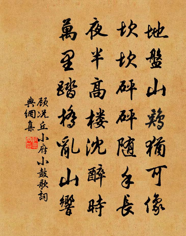 詩詞名句歷史字典書法欣賞書法字典國語詞典說文解字康熙字典古漢語字典標 題 作 者 詩 句 丘小府小鼓歌作者:顧況 朝代:唐代丘小府小鼓歌原文地盤山雞猶可像,坎坎砰砰隨手長。夜半高樓沈醉時,萬里踏橋亂山響。詩詞問答問:丘小府小鼓歌的作者是誰?答:顧況問:丘小府小鼓歌寫於哪個朝代?答:唐代問:丘小府小鼓歌是什麼體裁?答:七絕顧況丘小府小鼓歌書法欣賞丘小府小鼓歌書法作品注釋全唐詩:卷265_28詩詞推薦予出蜀日嘗遣僧則華乞簽於射洪陸使君祠使君陸游〔宋代〕我昔游青城,萬仞窮躋攀,巢居上官翁,許我分半山。且言牡丹平,可卜茅三間。報國未能忘,承詔遂東還。蹭蹬和至之秋宴感懷時至之已有歸休意吳則禮〔宋代〕紛紛舉世事輕肥,三徑蕭條獨可依。壯志未隨黃髮改,故山將伴白雲歸。林泉定落幽人手,塵土空侵病客衣。明月書房雜詠陸游〔宋代〕久客思鄉井,殘軀怯歲年。家能常食粥,口固不言錢。鐵補曾穿硯,韋聯屢絕編。臥聞兒講學,起坐失沉綿。苦熱寄赤松道者貫休〔唐代〕天雲如燒人如炙,天地爐中更何適。蟬喘雷乾冰井融,些子清風有何益。守羊真人聃之役,高吟招隱倚碧壁。紫氣龍金庵借張山長韻楊公遠〔宋代〕道人結屋萬山阿,趺坐焚香意味多。塵事不乾心已寂,年華易度發難皤。薇烹石銚供常饌,茶煮山泉當太和。我亦好事近(宴客七首。時留平江,俾侍兒歌以侑觴)仲並〔宋代〕二陸起雲間,千載風流人物。未似一門三鳳,向層霄聯翼。貞元朝士苦無多,公今未華發。重向紫宸朝路,立鵷鸞句种放〔宋代〕胡雛負恩信,聖主恥干戈。水調歌/水調佚名〔宋代〕一札自天下,五馬為民來。潛藩久須重鎮,帝命出蓬萊。曾侍九重筆橐,暫剖一州符竹,人謂屈公材。儒術要揚歷團欒說無上話圖贊釋紹曇〔宋代〕夙世冤憎,聚頭合腦。面面相看,說個甚麽。夜臥舟中聞有唱山歌者倚其聲作二首王道父〔宋代〕生來不識大門邊,一片丹心石樣堅。聞道阿郎難得婦,無媒爭得到郎前。寄任山人錢起〔唐代〕天階崇黼黻,世路有趨競。獨抱中孚爻,誰知苦寒詠。行潦難朝海,散材空遇聖。豈無鳴鳳時,其如問津命。所思挽沈夫人李流謙〔宋代〕人道孝為大,斯言俗之砭。簪緌顙猶泚,乃能出閨簾。逶迤竟潛通,姑慈霽霜嚴。老禪入宵夢,薄云為之殲。淨心過蘭亭書堂劉度〔宋代〕蘭亭擬金谷,逸少比季倫。史臣作此語,無異屠沽人。君看蘭亭墨,歲久跡豈陳。當時本嬉戲,後世乃見真。我行送胡象落第歸王屋別業岑參〔唐代〕看君尚少年,不第莫悽然。可即疲獻賦,山村歸種田。野花迎短褐,河柳拂長鞭。置酒聊相送,青門一醉眠。曹娥江蘇泂〔宋代〕月下傾殘酒,風前讀斷碑。采江那有意,陟岵不無悲。樹影經船疾,灘聲到枕遲。重來更何日,放棹欲何之。送羽林陶將軍李白〔唐代〕將軍出使擁樓船,江上旌旗拂紫煙。萬里橫戈探虎穴,三杯拔劍舞龍泉。莫道詞人無膽氣,臨行將贈繞朝鞭。雨宿方岳〔宋代〕雨宿疏篷不耐閒,苹花菰葉老江乾。鷺飛欲下忽驚起,秋水新添一寸寒。次韻酬陳之道明府見贈林表民〔宋代〕為政鄱君日,劬然似苦吟,光前還照後,行古卻居今。危世道猶直,故山春正深。露生觀庶物,清坐更觀心。別王銍性之賀鑄〔宋代〕吾老無北里,子能詎南來。臨分即間訣,薄暮更徘徊。晚節徇微尚,方剛患多才。此生南與北,出處兩悠哉。經舊遊張佖〔宋代〕暫到高唐曉又還,丁香結夢水潺潺。不知雲歸何處,歷歷空留十二山。名句推薦鄉思不堪悲橘柚,旅遊誰肯重王孫。譚用之《秋宿湘江遇雨》 斷崖蒼蘚對立久,凍雨為洗前朝悲。黃庭堅《書摩崖碑後》 入春才七日,離家已二年。薛道衡《人日思歸》 繞遍迴廊還獨坐。月籠雲暗重門鎖。蘇軾《蝶戀花·雨霰疏疏經潑火》 長相思,長相思。晏幾道《長相思·長相思》 同惡相助,同好相留,同情相成,同欲相趨,同利相死。司馬遷《史記七十列傳·吳王濞列傳》 一別如斯,落盡梨花月又西。納蘭性德《採桑子·當時錯》 吠犬雜鳴雞,燈火熒熒歸路迷。納蘭性德《南鄉子·秋暮村居》 數回細寫愁仍破,萬顆勻圓訝許同杜甫《野人送朱櫻》 馬駭輿,則君子不安輿;庶人駭政,則君子不安位。荀子《荀子·王制》
