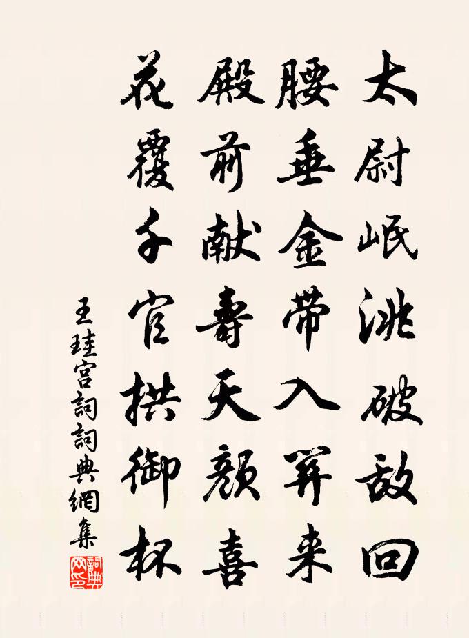 詩詞名句歷史字典書法欣賞書法字典國語詞典說文解字康熙字典古漢語字典標 題 作 者 詩 句 宮詞作者:王珪 朝代:唐代宮詞原文太尉岷洮破敵回,腰垂金帶入關來。殿前獻壽天顏喜,花覆千官拱御杯。詩詞問答問:宮詞的作者是誰?答:王珪問:宮詞寫於哪個朝代?答:唐代王珪宮詞書法欣賞宮詞書法作品詩詞推薦山居閒思羅與之〔宋代〕雨作糟床注,秋生鱸鱠思。捲簾了清景,沉水裊菸絲。賀新郎(壽洪雲岩)牟巘〔宋代〕雲擁油幢碧。眷蓬萊、宿緣一紀,竟須公出。上界清高仙地位。耿耿為民還切。此自是、平生願力。雨後新飆涼如偶成陳雲龍〔宋代〕野趣成間散,青山即故知。竹生逾砌筍,花引隔牆枝。舞蝶翻風亂,間雲出塢遲。倚欄無一事,俄有客傳詩。和同年張唐英懷弟晉英韻二首袁說友〔宋代〕舊學知何補,丹心早已平。過從欣故侶,慨慕熟英聲。笑洽愁腸釋,詩來俗眼清。君家好兄弟,何愧洛中程。登金山唐文若〔宋代〕江流出岷蜀,萬折東南傾。茲山若巨舫,勢欲扼滄溟。天高象教尊,海岳朝百靈。雲水渺四極,下上涵日星。朱甍次劉曉窗九日韻十首楊公遠〔宋代〕自憐萍梗老羈孤,暫寓僧寮不用租。九日有錢還可醉,不然萸菊酒俱無。示封中錄詩 二庾信〔南北朝〕高階既激澗。廣閣更交柯。葛巾久乖角。菊徑簡經過。晝錦堂宋自遜〔宋代〕荷龜葉龜游,龜庭皋鶴舞龜,應是秋龜滿淮涯。昨夜將星明處,彷佛峨眉。干戈已淨銀河淡,塵沙不動翠煙微。邦詠笛劉孝孫〔唐代〕涼秋夜笛鳴,流風韻九成。調高時慷慨,曲變或淒清。征客懷離緒,鄰人思舊情。幸以知音顧,千載有奇聲。題紫石禪房小池釋雲岫〔宋代〕窗前鑿破十尺土,海底潛通百斛泉。柳絮化萍飛不到,眼前贏得片青天。懷舊第一百六文天祥〔宋代〕天寒昏無日,故鄉不可思。訪舊半為鬼,慘慘中腸悲。次韻全真所感趙蕃〔宋代〕淡交異甘醴,雲雨相覆翻。二者固殊轍,終當戒多言。所遇既混餚,所防難每存。懷哉古之人,閉門或逾垣。和李文思早秋五首邵雍〔宋代〕徑小新經雨,庭幽遍有苔。風前閒意思,階下靜徘徊。不分筋骸老,難甘歲月催。時時藉芳草,賴有酒同杯。祝英台近(賦攬秀園)周密〔宋代〕步玲瓏,尋窈窕,瑤草四時碧。小小蓬萊,花氣透簾隙。幾回翠水荷初,蒼崖梅小,綺寮掩、玉壺春色。柳屏窄。題無訟堂屏上袁安臥雪圖楊萬里〔宋代〕雲窗避三伏,竹床橫一丈。退食急祖跣,病身聊偃仰。有夢元無夢,似想亦非想。滿堂變冥晦,寒陰起森爽。門外舒村趙蕃〔宋代〕有竹如椽故可佳,況於竹外隱鷗沙。不嫌官道多車馬,此地端宜著釣車。頌古七首釋祖璇〔宋代〕石羊頭子向東看,大地茫茫被眼謾。月映寒潭清徹底,雲收華岳露巑岏。早春歸山中舊居薛能〔唐代〕茫茫驅匹馬,歸處是荒榛。猿跡破庭雪,鼠蹤生甑塵。開門沖網斷,掃葉放苔勻。為惜詩情錯,應難致此身。城大順回道中作范仲淹〔宋代〕三月二十七,羌山始見花。將軍了邊事,春老未還家。和張器先十絕楊萬里〔宋代〕台家搜遍北山萊,傾國如君不用媒。次第幽人出空谷,鶴書即傍日邊來。名句推薦獨立寒秋,湘江北去,橘子洲頭。 * 《沁園春·長沙》 劃然長嘯,草木震動,山鳴谷應,風起水涌蘇軾《後赤壁賦》 金玉滿堂,莫之能守。富貴而驕,自遺其咎。功成身退,天之道。老子《老子·道經·第九章》 天涯靜處無征戰,兵氣銷為日月光。常建《塞下曲四首·其一》 滿眼遊絲兼落絮,紅杏開時,一霎清明雨。馮延巳《鵲踏枝·清明》 粗繒大布裹生涯,腹有詩書氣自華。蘇軾《和董傳留別》 北風利如劍,布絮不蔽身。白居易《村居苦寒》 人道惡盈而好謙。佚名《易傳·彖傳上·謙》 胡雁哀鳴夜夜飛,胡兒眼淚雙雙落。李頎《古從軍行》 傷身事莫做,傷心話莫說。佚名《增廣賢文·下集》