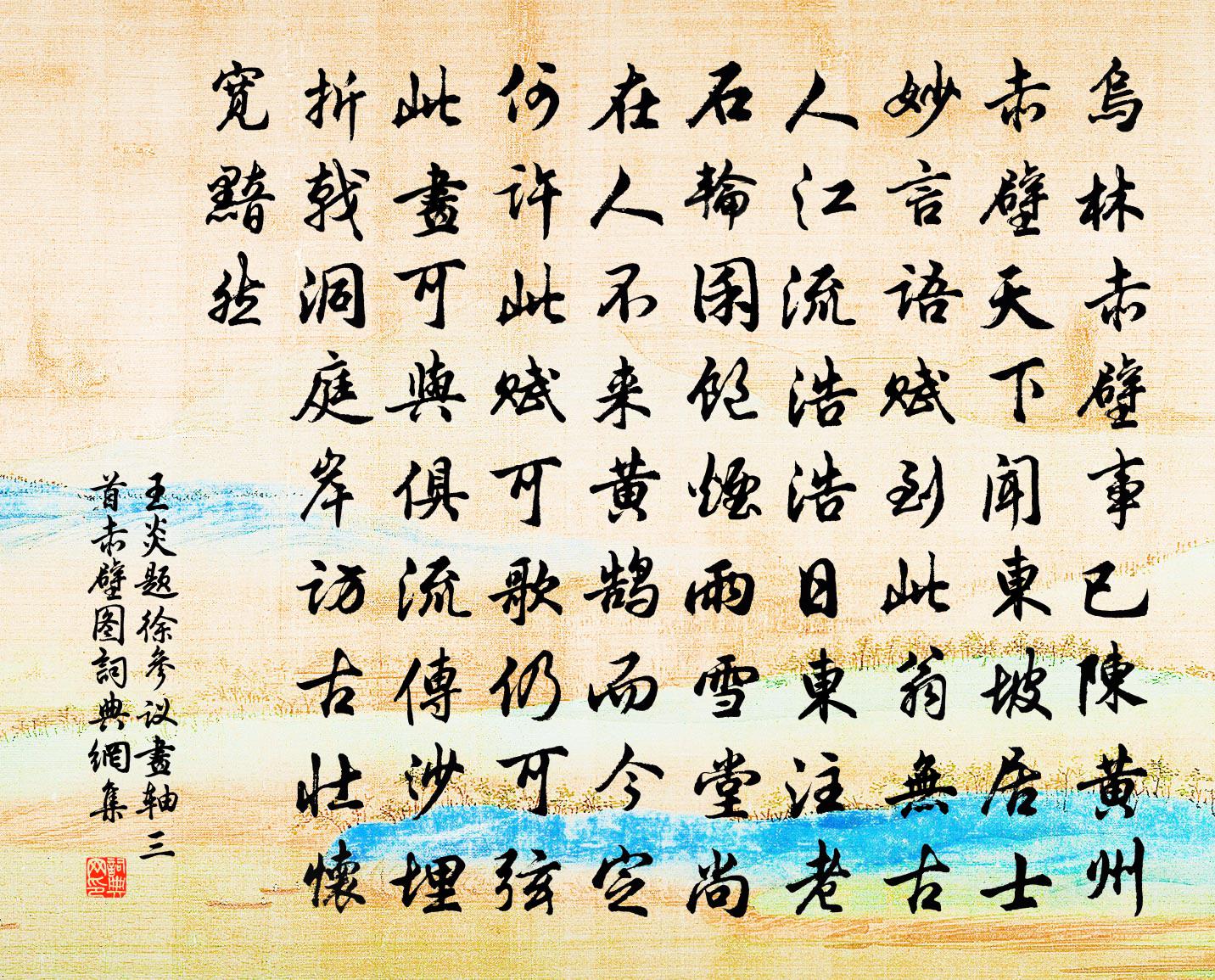 詩詞名句歷史字典書法欣賞書法字典國語詞典說文解字康熙字典古漢語字典標 題 作 者 詩 句 題徐參議畫軸三首赤壁圖作者:王炎 朝代:宋代題徐參議畫軸三首赤壁圖原文烏林赤壁事已陳,黃州赤壁天下聞。東坡居士妙言語,賦到此翁無古人。江流浩浩日東注,老石輪囷飽煙雨。雪堂尚在人不來,黃鵠而今定何許。此賦可歌仍可弦,此畫可與俱流傳。沙埋折戟洞庭岸,訪古壯懷寬黯然。詩詞問答問:題徐參議畫軸三首赤壁圖的作者是誰?答:王炎問:題徐參議畫軸三首赤壁圖寫於哪個朝代?答:宋代王炎題徐參議畫軸三首赤壁圖書法欣賞題徐參議畫軸三首赤壁圖書法作品詩詞推薦秋日范成大〔宋代〕新秋病骨頓成衰,不度溪橋半月來。無事閉門非左計,饒渠屐齒上青苔。寄呂惠卿吉甫兼簡林伯通王令〔宋代〕踆踆門外馬,客至知謂誰。昔面尚未逢。那論心相知。揖客拜上堂,謝客辱弗遺。寒暑相問酬,唯諾坐無為。靜默蔬飯張鎡〔宋代〕夜虹照飯光如玉,春甌飣莫菜肥於肉。周郎赤米太寒酸,潘令紫薑徒記錄。飢創寒罷忘貪慾,氣定徐行手摩腹。更大簏道中劉過〔宋代〕竹輿啞軋曉煙收,蒼玉岩巉萬里秋。路轉羊腸回草徑,溪分燕尾繞沙洲。愛山有癖須還債,覓句無工是不休。晴得端午帖子太上皇帝閣周必大〔宋代〕桃結千年實,蓮開十丈花。蘆香並槿茂,應笑阿瞞家。清禪者遊方釋智愚〔宋代〕金風露浥菊花秋,杞棘當途何處游。衡岳康廬相撞著,恐伊未是汝同流。和鮮于子駿益昌官舍八詠其三柏軒蘇轍〔宋代〕築室城市間,移柏南澗底。山林夙所尚,封植聊自寄。崎嶇脫岩石,擁塞出棼翳。上承清露滋,下受寒泉惠。秋來泛舟陸游〔宋代〕山照澄波發鬌青,新蒲梢上立蜻蜓。孤舟每為尋詩出,輸與漁翁醉不醒。清書張玉孃〔宋代〕書靜春偏遠,詩成與轉賖。看山憑書閣,問竹過遴家。摘翠間驚鳥,燒煙曉煮茶。無端雙蛺蝶,遠袖錯尋花。南塔詩蘇泂〔宋代〕松樹何知過百年,樹根流水亦清漣。莫嫌寂寞無人到,多有人來正不然。悼白雲王冕〔元代〕濁世儒名多浪得,先生高隱冠當今。注書已發程朱蘊,講道重明孔孟心。白日山林增氣象,清風江海振希音。少微丹鳳吟陳允平〔宋代〕暗柳煙深何處,翡翠簾櫳,鴛鴦樓閣。芹泥融潤,飛燕競穿珠幕。鞦韆倦倚,還思年少,襪步塵輕,衫裁羅薄。陡觀丙辰省試宣鎖作胡仲弓〔宋代〕四海文章屬品題,老夫刮臘有金篦。諸君熟讀阿房賦,未必能為五色迷。西江月 重陽全真集卷九王哲〔元代〕堪嘆青霄碧漢。高空景致尤寬。今朝清爽有餘歡。拈出我家公案。方顯平生手段。騰身便入雲端。西江月里跨祥鸞次韻王耘之秋興二首張鎡〔宋代〕多士寧王室,中宸夢傅岩。如何兩京客,猶掛五湖帆。落落雲松節,飄飄霜葉杉。深蕆草檄手,端欲取餚函。長安書懷呈知己項斯〔唐代〕江湖歸不易,京邑計長貧。獨夜有知己,論心無故人。一燈愁里夢,九陌病中春。為問清平日,無門致出身。海棠七首劉克莊〔宋代〕神女漂紅者,顛姨發赤然。年年吹洗了,未必恕今年。賣花聲·雨花台朱彝尊〔清代〕衰柳白門灣,潮打城還。小長乾接大長乾。歌板酒旗零落盡,剩有漁竿。秋草六朝寒,花雨空壇。更無人處一憑闌一葉舟侯善淵〔元代〕大道本無一物。遍納十方充塞。無外亦無心。不容針。要見闡開清目。認得本元虛谷。非淺亦非深。滿壺金。書適陸游〔宋代〕心清絕欲早,才薄去官多。月下時閒釣,雲邊每浩歌。野堂青草覆,山市白驢過。也有成功處,新降百萬魔。名句推薦聖人之官人,猶匠之用木也,取其所長,棄其所短。司馬光《資治通鑑·周紀一》 待把酒送君,恰又清明後。何夢桂《摸魚兒·記年時人人何處》 君有妒臣,則賢人不至。荀子《荀子·大略》 窮兵極武,仁者不為。令狐德棻《周書·列傳·卷二十七》 古人學問無遺力,少壯工夫老始成。陸游《冬夜讀書示子聿》 柳徑無人,墮絮飛無影。張先《翦牡丹(舟中聞雙琵琶·般涉調)》 輕陰池館水平橋,一番弄雨花梢。陳子龍《畫堂春·雨中杏花》 待到重陽日,還來就菊花。孟浩然《過故人莊》 不是暗塵明月,那時元夜。蔣捷《女冠子·元夕》 荊吳相接水為鄉,君去春江正淼茫。孟浩然《送杜十四之江南 / 送杜晃進士之東吳》